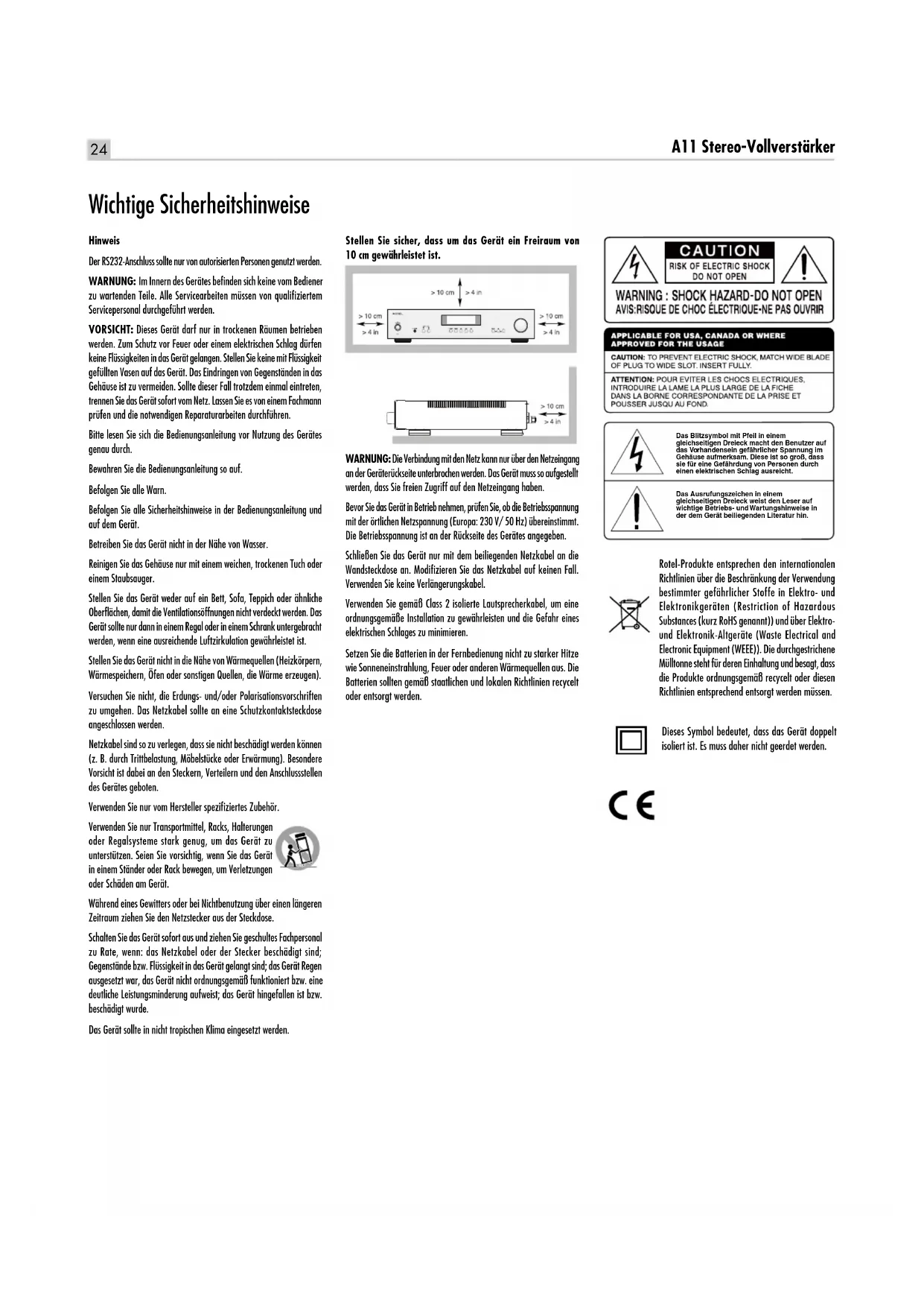 Poids (net) 6.85 kgs, 15.1 lbs. Toutes les spécifications sont garanties exactes au moment de l’impression. Rotel se réserve le droit de les modifier sans préavis. Rotel et le logo Rotel HiFi sont des marques déposées de The Rotel Co, Ltd, Tokyo, Japon.24 25 A11 Stereo-Vollverstärker Hinweis Der RS232-Anschluss sollte nur von autorisierten Personen genutzt werden. WARNUNG: Im Innern des Gerätes befinden sich keine vom Bediener zu wartenden Teile. Alle Servicearbeiten müssen von qualifiziertem Servicepersonal durchgeführt werden. VORSICHT: Dieses Gerät darf nur in trockenen Räumen betrieben werden. Zum Schutz vor Feuer oder einem elektrischen Schlag dürfen keine Flüssigkeiten in das Gerät gelangen. Stellen Sie keine mit Flüssigkeit gefüllten Vasen auf das Gerät. Das Eindringen von Gegenständen in das Gehäuse ist zu vermeiden. Sollte dieser Fall trotzdem einmal eintreten, trennen Sie das Gerät sofort vom Netz. Lassen Sie es von einem Fachmann prüfen und die notwendigen Reparaturarbeiten durchführen. Bitte lesen Sie sich die Bedienungsanleitung vor Nutzung des Gerätes genau durch. Bewahren Sie die Bedienungsanleitung so auf. Befolgen Sie alle Warn. Befolgen Sie alle Sicherheitshinweise in der Bedienungsanleitung und auf dem Gerät. Betreiben Sie das Gerät nicht in der Nähe von Wasser. Reinigen Sie das Gehäuse nur mit einem weichen, trockenen Tuch oder einem Staubsauger. Stellen Sie das Gerät weder auf ein Bett, Sofa, Teppich oder ähnliche Oberflächen, damit die Ventilationsöffnungen nicht verdeckt werden. Das Gerät sollte nur dann in einem Regal oder in einem Schrank untergebracht werden, wenn eine ausreichende Luftzirkulation gewährleistet ist. Stellen Sie das Gerät nicht in die Nähe von Wärmequellen (Heizkörpern, Wärmespeichern, Öfen oder sonstigen Quellen, die Wärme erzeugen). Versuchen Sie nicht, die Erdungs- und/oder Polarisationsvorschriften zu umgehen. Das Netzkabel sollte an eine Schutzkontaktsteckdose angeschlossen werden. Netzkabel sind so zu verlegen, dass sie nicht beschädigt werden können (z. B. durch Trittbelastung, Möbelstücke oder Erwärmung). Besondere Vorsicht ist dabei an den Steckern, Verteilern und den Anschlussstellen des Gerätes geboten. Verwenden Sie nur vom Hersteller spezifiziertes Zubehör. Verwenden Sie nur Transportmittel, Racks, Halterungen oder Regalsysteme stark genug, um das Gerät zu unterstützen. Seien Sie vorsichtig, wenn Sie das Gerät in einem Ständer oder Rack bewegen, um Verletzungen oder Schäden am Gerät. Während eines Gewitters oder bei Nichtbenutzung über einen längeren Zeitraum ziehen Sie den Netzstecker aus der Steckdose. Schalten Sie das Gerät sofort aus und ziehen Sie geschultes Fachpersonal zu Rate, wenn: das Netzkabel oder der Stecker beschädigt sind; Gegenstände bzw. Flüssigkeit in das Gerät gelangt sind; das Gerät Regen ausgesetzt war, das Gerät nicht ordnungsgemäß funktioniert bzw. eine deutliche Leistungsminderung aufweist; das Gerät hingefallen ist bzw. beschädigt wurde. Das Gerät sollte in nicht tropischen Klima eingesetzt werden. Rotel-Produkte entsprechen den internationalen Richtlinien über die Beschränkung der Verwendung bestimmter gefährlicher Stoffe in Elektro- und Elektronikgeräten (Restriction of Hazardous Substances (kurz RoHS genannt)) und über Elektro- und Elektronik-Altgeräte (Waste Electrical and Electronic Equipment (WEEE)). Die durchgestrichene Mülltonne steht für deren Einhaltung und besagt, dass die Produkte ordnungsgemäß recycelt oder diesen Richtlinien entsprechend entsorgt werden müssen. Dieses Symbol bedeutet, dass das Gerät doppelt isoliert ist. Es muss daher nicht geerdet werden. Wichtige Sicherheitshinweise Stellen Sie sicher, dass um das Gerät ein Freiraum von 10 cm gewährleistet ist. WARNUNG: Die Verbindung mit den Netz kann nur über den Netzeingang an der Geräterückseite unterbrochen werden. Das Gerät muss so aufgestellt werden, dass Sie freien Zugriff auf den Netzeingang haben. Bevor Sie das Gerät in Betrieb nehmen, prüfen Sie, ob die Betriebsspannung mit der örtlichen Netzspannung (Europa: 230 V/ 50 Hz) übereinstimmt. Die Betriebsspannung ist an der Rückseite des Gerätes angegeben. Schließen Sie das Gerät nur mit dem beiliegenden Netzkabel an die Wandsteckdose an. Modifizieren Sie das Netzkabel auf keinen Fall. Verwenden Sie keine Verlängerungskabel. Verwenden Sie gemäß Class 2 isolierte Lautsprecherkabel, um eine ordnungsgemäße Installation zu gewährleisten und die Gefahr eines elektrischen Schlages zu minimieren. Setzen Sie die Batterien in der Fernbedienung nicht zu starker Hitze wie Sonneneinstrahlung, Feuer oder anderen Wärmequellen aus. Die Batterien sollten gemäß staatlichen und lokalen Richtlinien recycelt oder entsorgt werden. Das Blitzsymbol mit Pfeil in einem gleichseitigen Dreieck macht den Benutzer auf das Vorhandensein gefährlicher Spannung im Gehäuse aufmerksam. Diese ist so groß, dass sie für eine Gefährdung von Personen durch einen elektrischen Schlag ausreicht. Das Ausrufungszeichen in einem gleichseitigen Dreieck weist den Leser auf wichtige Betriebs- und Wartungshinweise in der dem Gerät beiliegenden Literatur hin.25 Deutsch