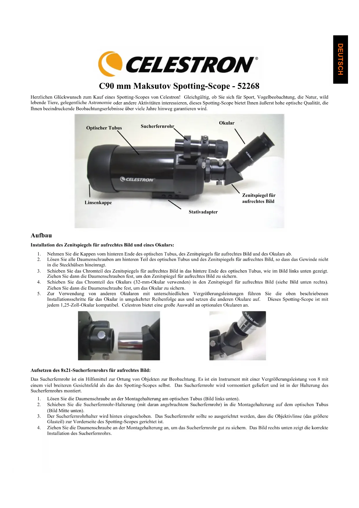 2. Schieben Sie die Sucherfernrohr-Halterung (mit daran angebrachtem Sucherfernrohr) in die Montagehalterung auf dem optischen Tubus (Bild Mitte unten). 3. Der Sucherfernrohrhalter wird hinten eingeschoben. Das Sucherfernrohr sollte so ausgerichtet werden, dass die Objektivlinse (das größere Glasteil) zur Vorderseite des Spotting-Scopes gerichtet ist. 4. Ziehen Sie die Daumenschraube an der Montagehalterung an, um das Sucherfernrohr gut zu sichern. Das Bild rechts unten zeigt die korrekte Installation des Sucherfernrohrs. Optischer Tubus Sucherfernrohr Okular Linsenkappe Stativadapter Zenitspiegel für aufrechtes Bild DEUTSCHAufsetzen des Spotting-Scopes auf einem Foto-/Videostativ Setzen Sie das Spotting-Scope vor dem Einsatz für Beobachtungen auf ein festes Foto-/Videostativ; die physische Größe und Vergrößerung des Spotting-Scopes erfordern ein robustes Stativ für scharfe und verwacklungsfreie Bilder. Unten am Spotting-Scope befindet sich ein Stativadapter (siehe Bild auf Seite 1) mit 1/4x20-Gewindelöchern. Sie ermöglichen die Installation Ihres Stativs am Spotting-Scope. Celestron bietet optionale Foto-/Videostative an.