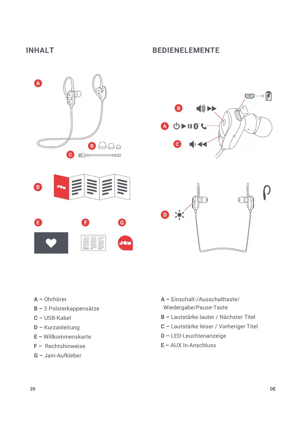 “Live Large” HX-EP303 BedienungsanleitungDE20 INHALT A – Ohrhörer B – 3 Polsterkappensätze C – USB-Kabel D – Kurzanleitung E – Willkommenskarte F – Rechtshinweise G – Jam-Aufkleber BEDIENELEMENTE A – Einschalt-/Ausschalttaste/ Wiedergabe/Pause-Taste B – Lautstärke lauter / Nächster Titel C – Lautstärke leiser / Vorheriger Titel D – LED-Leuchtenanzeige E – AUX In-Anschluss