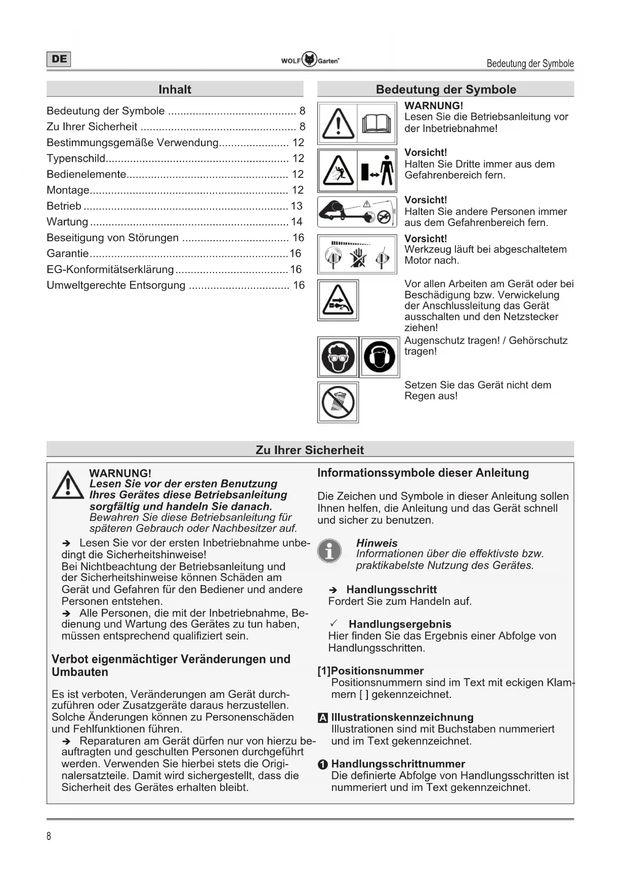 - Umweltgerechte Entsorgung Zu Ihrer Sicherheit Bedeutung der Symbole WARNUNG! Lesen Sie die Betriebsanleitung vor der Inbetriebnahme! Vorsicht! Halten Sie Dritte immer aus dem Gefahrenbereich fern. 360° Vorsicht! Halten Sie andere Personen immer aus dem Gefahrenbereich fern. Vorsicht! Werkzeug läuft bei abgeschaltetem Motor nach. Vor allen Arbeiten am Gerät oder bei Beschädigung bzw. Verwickelung der Anschlussleitung das Gerät ausschalten und den Netzstecker ziehen! Augenschutz tragen! / Gehörschutz tragen! Setzen Sie das Gerät nicht dem Regen aus! InhaltZu Ihrer Sicherheit p. 16