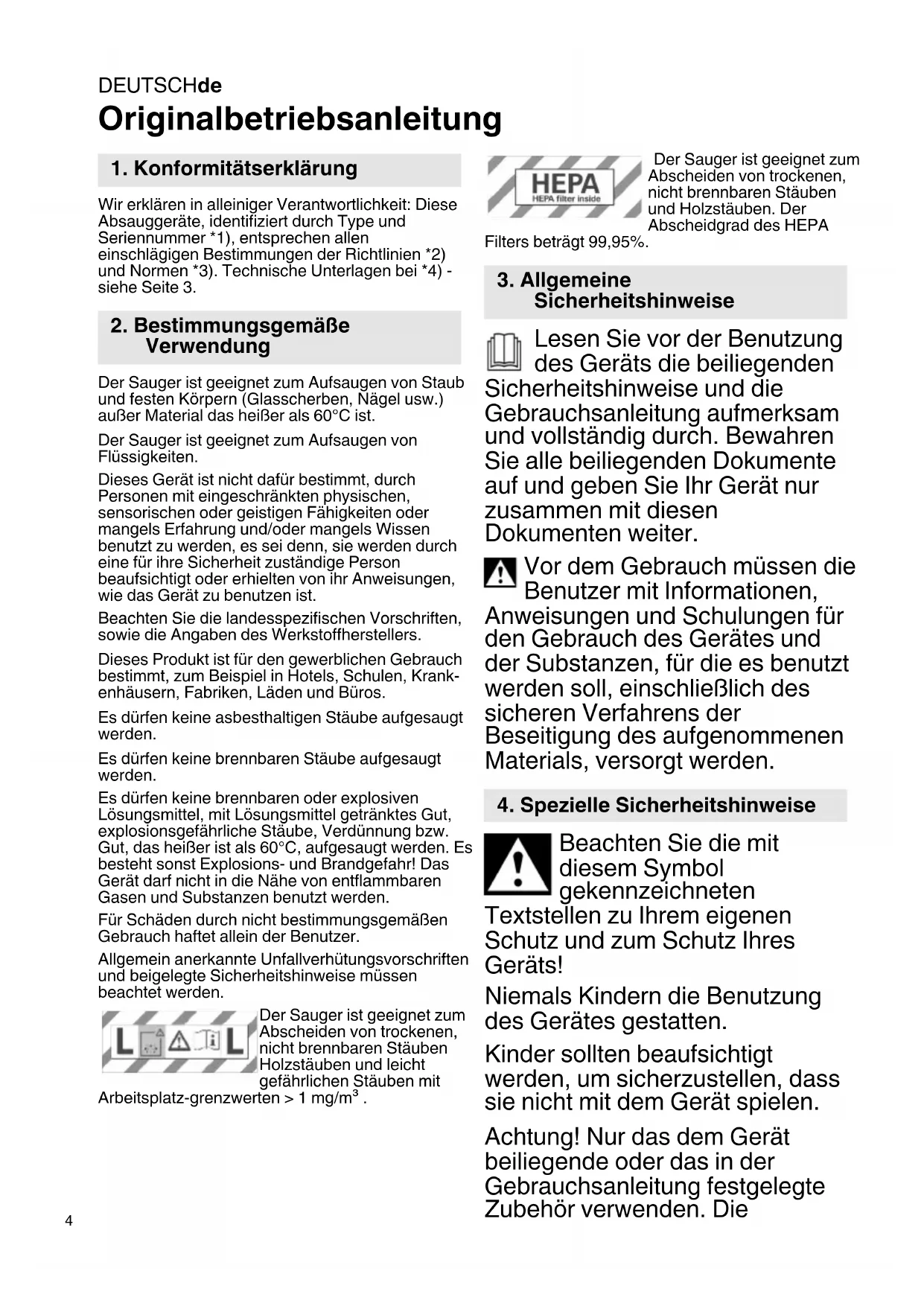 Originalbetriebsanleitung Wir erklären in alleiniger Verantwortlichkeit: Diese Absauggeräte, identifiziert durch Type und Seriennummer *1), entsprechen allen einschlägigen Bestimmungen der Richtlinien *2) und Normen *3). Technische Unterlagen bei *4) - siehe Seite 3. Der Sauger ist geeignet zum Aufsaugen von Staub und festen Körpern (Glasscherben, Nägel usw.) außer Material das heißer als 60°C ist. Der Sauger ist geeignet zum Aufsaugen von Flüssigkeiten. Dieses Gerät ist nicht dafür bestimmt, durch Personen mit eingeschränkten physischen, sensorischen oder geistigen Fähigkeiten oder mangels Erfahrung und/oder mangels Wissen benutzt zu werden, es sei denn, sie werden durch eine für ihre Sicherheit zuständige Person beaufsichtigt oder erhielten von ihr Anweisungen, wie das Gerät zu benutzen ist. Beachten Sie die landesspezifischen Vorschriften, sowie die Angaben des Werkstoffherstellers. Dieses Produkt ist für den gewerblichen Gebrauch bestimmt, zum Beispiel in Hotels, Schulen, Krank- enhäusern, Fabriken, Läden und Büros. Es dürfen keine asbesthaltigen Stäube aufgesaugt werden. Es dürfen keine brennbaren Stäube aufgesaugt werden. Es dürfen keine brennbaren oder explosiven Lösungsmittel, mit Lösungsmittel getränktes Gut, explosionsgefährliche Stäube, Verdünnung bzw. Gut, das heißer ist als 60°C, aufgesaugt werden. Es besteht sonst Explosions- und Brandgefahr! Das Gerät darf nicht in die Nähe von entflammbaren Gasen und Substanzen benutzt werden. Für Schäden durch nicht bestimmungsgemäßen Gebrauch haftet allein der Benutzer. Allgemein anerkannte Unfallverhütungsvorschriften und beigelegte Sicherheitshinweise müssen beachtet werden. Der Sauger ist geeignet zum Abscheiden von trockenen, nicht brennbaren Stäuben Holzstäuben und leicht gefährlichen Stäuben mit Arbeitsplatz-grenzwerten > 1 mg/m³ . Der Sauger ist geeignet zum Abscheiden von trockenen, nicht brennbaren Stäuben und Holzstäuben. Der Abscheidgrad des HEPA Filters beträgt 99,95%. Lesen Sie vor der Benutzung des Geräts die beiliegenden Sicherheitshinweise und die Gebrauchsanleitung aufmerksam und vollständig durch. Bewahren Sie alle beiliegenden Dokumente auf und geben Sie Ihr Gerät nur zusammen mit diesen Dokumenten weiter. Vor dem Gebrauch müssen die Benutzer mit Informationen, Anweisungen und Schulungen für den Gebrauch des Gerätes und der Substanzen, für die es benutzt werden soll, einschließlich des sicheren Verfahrens der Beseitigung des aufgenommenen Materials, versorgt werden. Beachten Sie die mit diesem Symbol gekennzeichneten Textstellen zu Ihrem eigenen Schutz und zum Schutz Ihres Geräts! Niemals Kindern die Benutzung des Gerätes gestatten. Kinder sollten beaufsichtigt werden, um sicherzustellen, dass sie nicht mit dem Gerät spielen. Achtung! Nur das dem Gerät beiliegende oder das in der Gebrauchsanleitung festgelegte Zubehör verwenden. Die