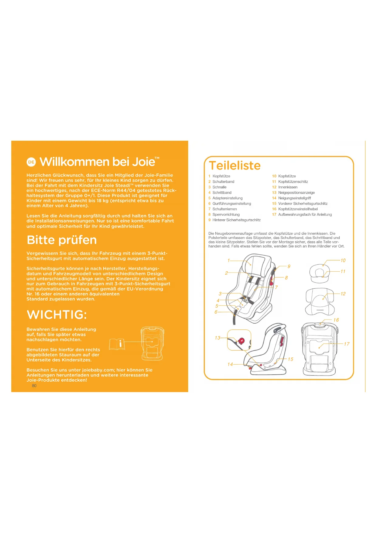 Herzlichen Glückwunsch, dass Sie ein Mitglied der Joie-Familie sind! Wir freuen uns sehr, für Ihr kleines Kind sorgen zu dürfen. Bei der Fahrt mit dem Kindersitz Joie Steadi™ verwenden Sie ein hochwertiges, nach der ECE-Norm R44/04 getestetes Rück- haltesystem der Gruppe 0+/1. Diese Produkt ist geeignet für Kinder mit einem Gewicht bis 18 kg (entspricht etwa bis zu einem Alter von 4 Jahren). Lesen Sie die Anleitung sorgfältig durch und halten Sie sich an die Installationsanweisungen. Nur so ist eine komfortable Fahrt und optimale Sicherheit für Ihr Kind gewährleistet. Bitte prüfen Vergewissern Sie sich, dass Ihr Fahrzeug mit einem 3-Punkt-Sicherheitsgurt mit automatischem Einzug ausgestattet ist.Sicherheitsgurte können je nach Hersteller, Herstellungs- datum und Fahrzeugmodell von unterschiedlichem Design und unterschiedlicher Länge sein. Der Kindersitz eignet sich nur zum Gebrauch in Fahrzeugen mit 3-Punkt-Sicherheitsgurt mit automatischem Einzug, die gemäß der EU-Verordnung Nr. 16 oder einem anderen äquivalenten Standard zugelassen wurden. WICHTIG: