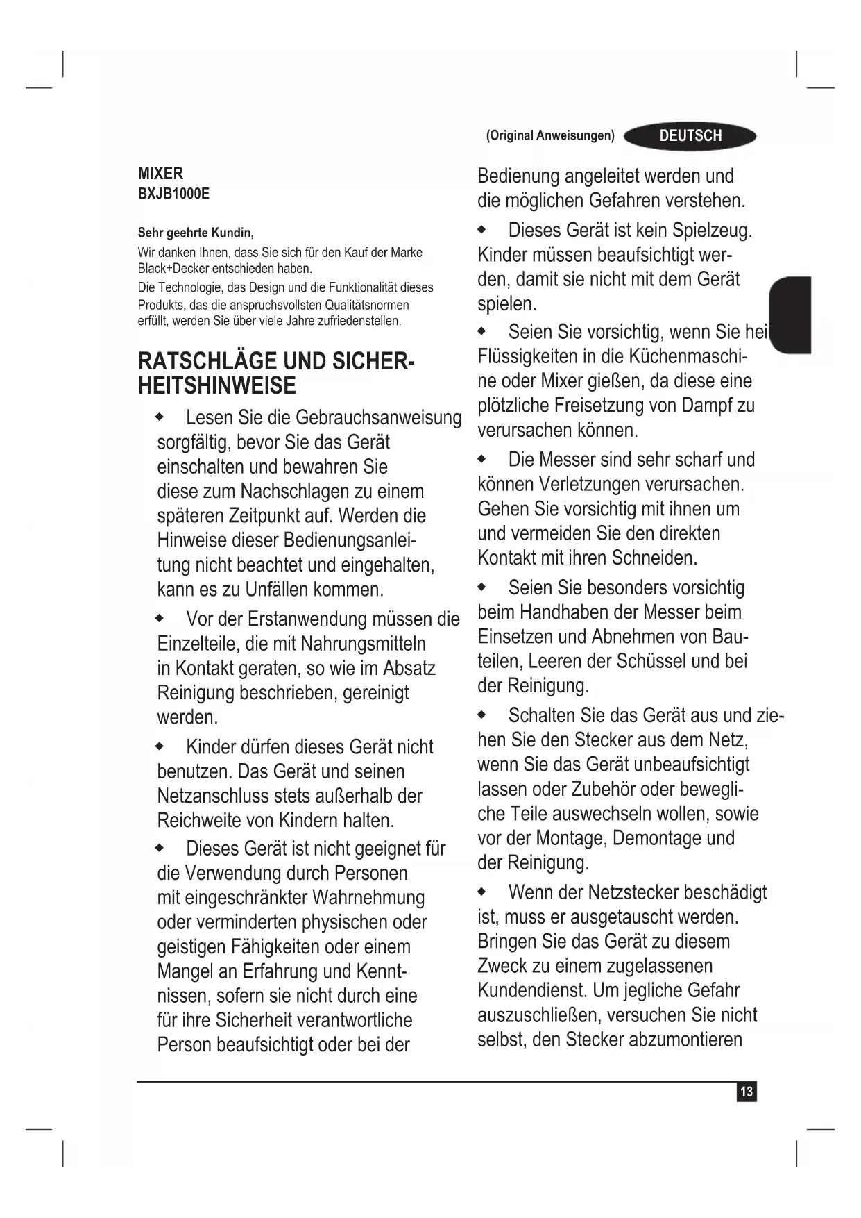 MIXER BXJB1000E Sehr geehrte Kundin, Wir danken Ihnen, dass Sie sich für den Kauf der Marke Black+Decker entschieden haben. Die Technologie, das Design und die Funktionalität dieses Produkts, das die anspruchsvollsten Qualitätsnormen erfüllt, werden Sie über viele Jahre zufriedenstellen.