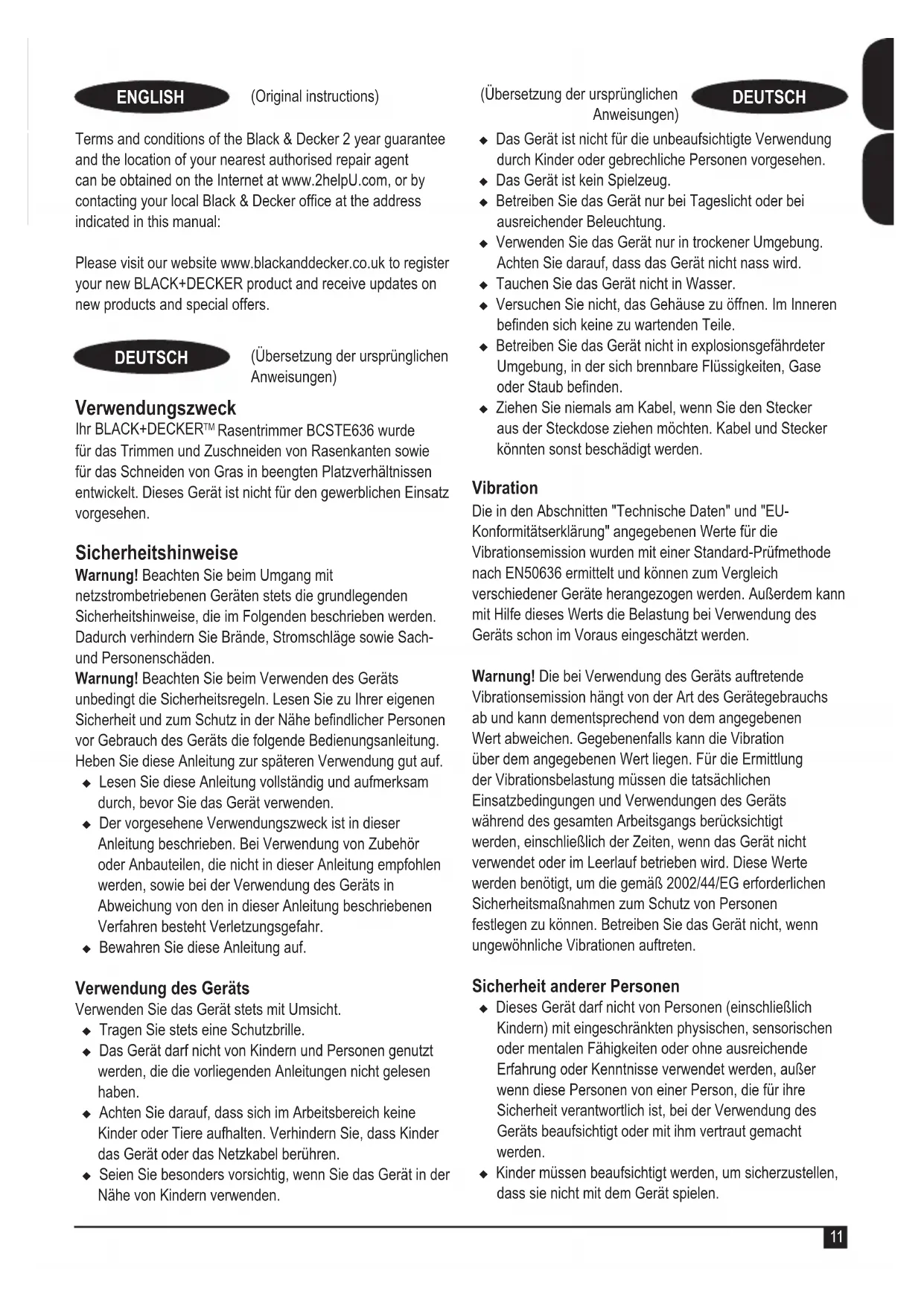 Rasentrimmer BCSTE636 wurde für das Trimmen und Zuschneiden von Rasenkanten sowie für das Schneiden von Gras in beengten Platzverhältnissen entwickelt. Dieses Gerät ist nicht für den gewerblichen Einsatz vorgesehen. Sicherheitshinweise Warnung! Beachten Sie beim Umgang mit netzstrombetriebenen Geräten stets die grundlegenden Sicherheitshinweise, die im Folgenden beschrieben werden. Dadurch verhindern Sie Brände, Stromschläge sowie Sach- und Personenschäden. Warnung! Beachten Sie beim Verwenden des Geräts unbedingt die Sicherheitsregeln. Lesen Sie zu Ihrer eigenen Sicherheit und zum Schutz in der Nähe bendlicher Personen vor Gebrauch des Geräts die folgende Bedienungsanleitung. Heben Sie diese Anleitung zur späteren Verwendung gut auf. u Lesen Sie diese Anleitung vollständig und aufmerksam durch, bevor Sie das Gerät verwenden. u Der vorgesehene Verwendungszweck ist in dieser Anleitung beschrieben. Bei Verwendung von Zubehör oder Anbauteilen, die nicht in dieser Anleitung empfohlen werden, sowie bei der Verwendung des Geräts in Abweichung von den in dieser Anleitung beschriebenen Verfahren besteht Verletzungsgefahr. u Bewahren Sie diese Anleitung auf. Verwendung des Geräts Verwenden Sie das Gerät stets mit Umsicht. u Tragen Sie stets eine Schutzbrille. u Das Gerät darf nicht von Kindern und Personen genutzt werden, die die vorliegenden Anleitungen nicht gelesen haben. u Achten Sie darauf, dass sich im Arbeitsbereich keine Kinder oder Tiere aufhalten. Verhindern Sie, dass Kinder das Gerät oder das Netzkabel berühren. u Seien Sie besonders vorsichtig, wenn Sie das Gerät in der Nähe von Kindern verwenden. u Das Gerät ist nicht für die unbeaufsichtigte Verwendung durch Kinder oder gebrechliche Personen vorgesehen. u Das Gerät ist kein Spielzeug. u Betreiben Sie das Gerät nur bei Tageslicht oder bei ausreichender Beleuchtung. u Verwenden Sie das Gerät nur in trockener Umgebung. Achten Sie darauf, dass das Gerät nicht nass wird. u Tauchen Sie das Gerät nicht in Wasser. u Versuchen Sie nicht, das Gehäuse zu öffnen. Im Inneren benden sich keine zu wartenden Teile. u Betreiben Sie das Gerät nicht in explosionsgefährdeter Umgebung, in der sich brennbare Flüssigkeiten, Gase oder Staub benden. u Ziehen Sie niemals am Kabel, wenn Sie den Stecker aus der Steckdose ziehen möchten. Kabel und Stecker könnten sonst beschädigt werden. Vibration Die in den Abschnitten "Technische Daten" und "EU- Konformitätserklärung" angegebenen Werte für die Vibrationsemission wurden mit einer Standard-Prüfmethode nach EN50636 ermittelt und können zum Vergleich verschiedener Geräte herangezogen werden. Außerdem kann mit Hilfe dieses Werts die Belastung bei Verwendung des Geräts schon im Voraus eingeschätzt werden. Warnung! Die bei Verwendung des Geräts auftretende Vibrationsemission hängt von der Art des Gerätegebrauchs ab und kann dementsprechend von dem angegebenen Wert abweichen. Gegebenenfalls kann die Vibration über dem angegebenen Wert liegen. Für die Ermittlung der Vibrationsbelastung müssen die tatsächlichen Einsatzbedingungen und Verwendungen des Geräts während des gesamten Arbeitsgangs berücksichtigt werden, einschließlich der Zeiten, wenn das Gerät nicht verwendet oder im Leerlauf betrieben wird. Diese Werte werden benötigt, um die gemäß 2002/44/EG erforderlichen Sicherheitsmaßnahmen zum Schutz von Personen festlegen zu können. Betreiben Sie das Gerät nicht, wenn ungewöhnliche Vibrationen auftreten. Sicherheit anderer Personen u Dieses Gerät darf nicht von Personen (einschließlich Kindern) mit eingeschränkten physischen, sensorischen oder mentalen Fähigkeiten oder ohne ausreichende Erfahrung oder Kenntnisse verwendet werden, außer wenn diese Personen von einer Person, die für ihre Sicherheit verantwortlich ist, bei der Verwendung des Geräts beaufsichtigt oder mit ihm vertraut gemacht werden. u Kinder müssen beaufsichtigt werden, um sicherzustellen, dass sie nicht mit dem Gerät spielen.12 (Übersetzung der ursprünglichen Anweisungen) DEUTSCH Restrisiken. Beim Gebrauch dieses Geräts verbleiben zusätzliche Restrisiken, die möglicherweise nicht in den Sicherheitswarnungen genannt werden. Diese Risiken bestehen beispielsweise bei Missbrauch oder längerem Gebrauch. Auch bei der Einhaltung der entsprechenden Sicherheitsvorschriften und der Verwendung aller Sicherheitsgeräte bestehen weiterhin bestimmte Restrisiken. Diese sind: u Verletzungen, die durch das Berühren von sich drehenden/bewegenden Teilen verursacht werden. u Verletzungen, die durch das Austauschen von Teilen, Messern oder Zubehör verursacht werden. u Der längere Gebrauch eines Geräts kann Verletzungen zur Folge haben. Legen Sie bei längerem Gebrauch regelmäßige Pausen ein. u Schwerhörigkeit. u Gesundheitsrisiken durch das Einatmen von Staub beim Gebrauch des Geräts (z. B. bei Holzarbeiten, insbesondere Eiche, Buche und Pressspan) Nach dem Gebrauch u Bewahren Sie das Gerät bei Nichtgebrauch an einem trockenen, gut belüfteten Ort außerhalb der Reichweite von Kindern auf. u Kinder sollten keinen Zugang zu aufbewahrten Geräten haben. u Wenn das Gerät in einem Fahrzeug transportiert oder gelagert wird, bewahren Sie es im Kofferraum oder einer geeigneten Ablage auf, damit es bei plötzlichen Geschwindigkeits- oder Richtungsänderungen nicht in Bewegung geraten kann. Inspektion und Reparaturen u Prüfen Sie das Gerät vor der Verwendung auf beschädigte oder defekte Teile. Prüfen Sie, ob Teile beschädigt sind oder andere Bedingungen vorliegen, die die Funktion beeinträchtigen können. u Betreiben Sie das Gerät nicht, wenn Teile beschädigt oder defekt sind. u Lassen Sie beschädigte oder defekte Teile in einer Vertragswerkstatt reparieren oder austauschen. u Ersetzen oder entfernen Sie keine Teile, für die in dieser Anleitung keine entsprechende Beschreibung enthalten ist. Zusätzliche Sicherheitshinweise für Rasentrimmer Warnung! Die Schneidevorrichtung rotiert 