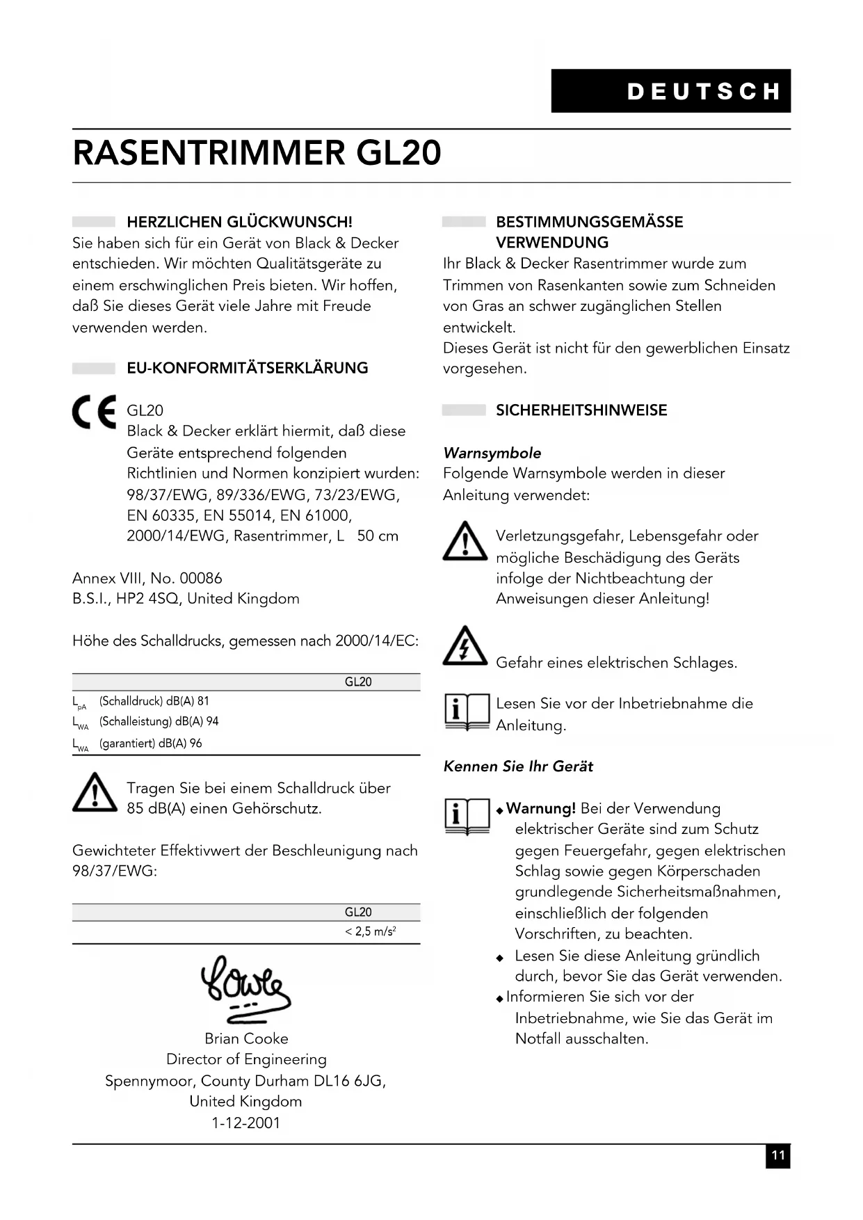 GL20 Black & Decker erklärt hiermit, daß diese Geräte entsprechend folgenden Richtlinien und Normen konzipiert wurden: 98/37/EWG, 89/336/EWG, 73/23/EWG, EN 60335, EN 55014, EN 61000, 2000/14/EWG, Rasentrimmer, L 50 cm Annex VIII, No. 00086 B.S.I., HP2 4SQ, United Kingdom Höhe des Schalldrucks, gemessen nach 2000/14/EC: GL20