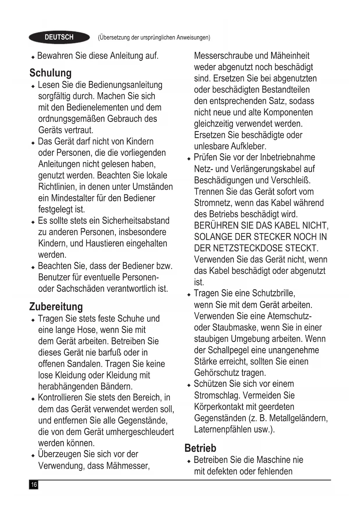 DER NETZSTECKDOSE STECKT. Verwenden Sie das Gerät nicht, wenn das Kabel beschädigt oder abgenutzt ist. u Tragen Sie eine Schutzbrille, wenn Sie mit dem Gerät arbeiten. Verwenden Sie eine Atemschutz- oder Staubmaske, wenn Sie in einer staubigen Umgebung arbeiten. Wenn der Schallpegel eine unangenehme Stärke erreicht, sollten Sie einen Gehörschutz tragen. u Schützen Sie sich vor einem Stromschlag. Vermeiden Sie Körperkontakt mit geerdeten Gegenständen (z. B. Metallgeländern, Laternenpfählen usw.). Betrieb u Betreiben Sie die Maschine nie mit defekten oder fehlenden u Bewahren Sie diese Anleitung auf. Schulung u Lesen Sie die Bedienungsanleitung sorgfältig durch. Machen Sie sich mit den Bedienelementen und dem ordnungsgemäßen Gebrauch des Geräts vertraut. u Das Gerät darf nicht von Kindern oder Personen, die die vorliegenden Anleitungen nicht gelesen haben, genutzt werden. Beachten Sie lokale Richtlinien, in denen unter Umständen ein Mindestalter für den Bediener festgelegt ist. u Es sollte stets ein Sicherheitsabstand zu anderen Personen, insbesondere Kindern, und Haustieren eingehalten werden. u Beachten Sie, dass der Bediener bzw. Benutzer für eventuelle Personen- oder Sachschäden verantwortlich ist. Zubereitung u Tragen Sie stets feste Schuhe und eine lange Hose, wenn Sie mit dem Gerät arbeiten. Betreiben Sie dieses Gerät nie barfuß oder in offenen Sandalen. Tragen Sie keine lose Kleidung oder Kleidung mit herabhängenden Bändern. u Kontrollieren Sie stets den Bereich, in dem das Gerät verwendet werden soll, und entfernen Sie alle Gegenstände, die von dem Gerät umhergeschleudert werden können. u Überzeugen Sie sich vor der Verwendung, dass Mähmesser,17 (Übersetzung der ursprünglichen Anweisungen) DEUTSCH Schutzvorrichtungen, wie z. B. Deektoren und/oder Grasfangkorb. u Betreiben Sie das Gerät nur bei Tageslicht oder bei ausreichender Beleuchtung. u Schützen Sie das Gerät vor Regen. Betreiben Sie das Gerät nie in feuchter oder nasser Umgebung. Vermeiden Sie es, das Gerät auf feuchtem Rasen zu betreiben. u Achten Sie auf Standfestigkeit, insbesondere bei Arbeiten an Hängen. Achten Sie darauf, dass frisch gemähtes Gras feucht und rutschig sein kann. Arbeiten Sie nie an steilen Hängen. u Schieben Sie das Gerät immer parallel zum Hang, nie den Hang hinauf oder hinunter. Arbeiten Sie mit äußerster Vorsicht, wenn Sie an Hängen die Richtung wechseln. u Mähen Sie nicht an steilen Hängen. u Betreiben Sie das Gerät nur im Gehen, nie im Rennen. Ziehen Sie das Gerät nicht zu sich heran. Gehen Sie mit dem Gerät nie rückwärts. u Schalten Sie das Gerät den Anweisungen entsprechend ein. Achten Sie darauf, dass Ihre Füße einen Sicherheitsabstand zum Messer einhalten. u Starten Sie das Gerät nicht, wenn Sie sich vor der Auswurföffnung benden. u Kippen Sie das Gerät beim Anschalten nicht, es sei denn, das Gerät muss zum Starten gekippt werden. Kippen Sie das Gerät in diesem Fall nicht mehr als nötig. Heben Sie stets den von Ihnen entfernten Teil des Geräts an. Bringen Sie beide Hände in die Betriebsposition, bevor Sie das Gerät wieder auf den Boden setzen. u Schalten Sie in folgenden Situationen das Gerät stets aus, und warten Sie, bis die Mäheinheit zum Stillstand gekommen ist: wenn das Gerät für den Transport gekippt werden muss, wenn Sie Oberächen überqueren, die nicht aus Gras bestehen, und wenn Sie das Gerät zu der zu mähenden Fläche und von dort weg transportieren. u Warten Sie stets, bis das Messer vollständig zum Stillstand gekommen ist, bevor Sie das Gerät anheben oder tragen. u Halten Sie Hände und Füße vom Messer fern. u Bringen Sie nie Hände und Füße in die Nähe von rotierenden Geräteteilen oder unter rotierende Geräteteile. u Halten Sie jederzeit einen Sicherheitsabstand zu den Auswurföffnungen ein. u Schalten Sie das Gerät ab, trennen Sie es von der Stromversorgung, und stellen Sie sicher, dass alle beweglichen Teile zum Stillstand gekommen sind, bevor Sie das Gerät unbeaufsichtigt stehen lassen, reinigen, inspizieren, Geräteteile auswechseln oder eine Blockade entfernen. Nach dem Überfahren eines Fremdkörpers. Kontrollieren Sie das Gerät auf Beschädigungen, bevor sie es wieder in Betrieb nehmen.18 (Übersetzung der ursprünglichen Anweisungen) DEUTSCH u Wenn das Gerät ungewöhnlich vibriert oder mit einem Fremdkörper in Berührung gekommen ist, schalten Sie das Gerät aus, und trennen Sie es von der Stromversorgung. Kontrollieren Sie das Gerät auf Beschädigungen, ersetzen bzw. reparieren Sie beschädigte Teile, kontrollieren Sie, ob lose Teile vorhanden sind, und ziehen Sie diese ggf. fest. u Achten Sie darauf, dass das Stromkabel nicht in die Nähe des Messers gerät. Achten Sie stets auf die Lage des Stromkabels. u Der Motor läuft nach dem Abschalten einige Sekunden lang weiter. Versuchen Sie nie, das Messer mit Gewalt zum Stillstand zu bringen. Wartung und Aufbewahrung u Prüfen Sie das Gerät vor der Verwendung auf beschädigte oder defekte Teile. Überprüfen Sie, ob bewegliche Teile falsch ausgerichtet oder falsch angebracht und ob Teile, Schutzvorrichtungen oder Schalter beschädigt sind. Achten Sie auch auf andere Beschädigungen, die den Betrieb des Geräts beeinträchtigen können. Stellen Sie sicher, dass das Gerät ordnungsgemäß funktioniert. Betreiben Sie das Gerät nie, wenn Schutzvorrichtungen oder Abdeckungen beschädigt oder nicht vorhanden sind. Betreiben Sie das Gerät nicht, wenn Teile beschädigt oder defekt sind. Betreiben Sie das Gerät nicht, wenn der Schalter zum Ein- und Ausschalten nicht funktioniert. Lassen Sie beschädigte oder defekte Teile in einer Vertragswerkstatt reparieren oder austauschen. u Überprüfen Sie das Kabel regelmäßig auf Beschädigungen. Wenn das Kabel beschädigt ist, muss es in einer Vertragswerkstatt repariert oder ausgetauscht werden. Es können sonst Unfälle verursacht werden. Überprüfen Sie Verlängerungskabel regelmäßig auf Beschädigu