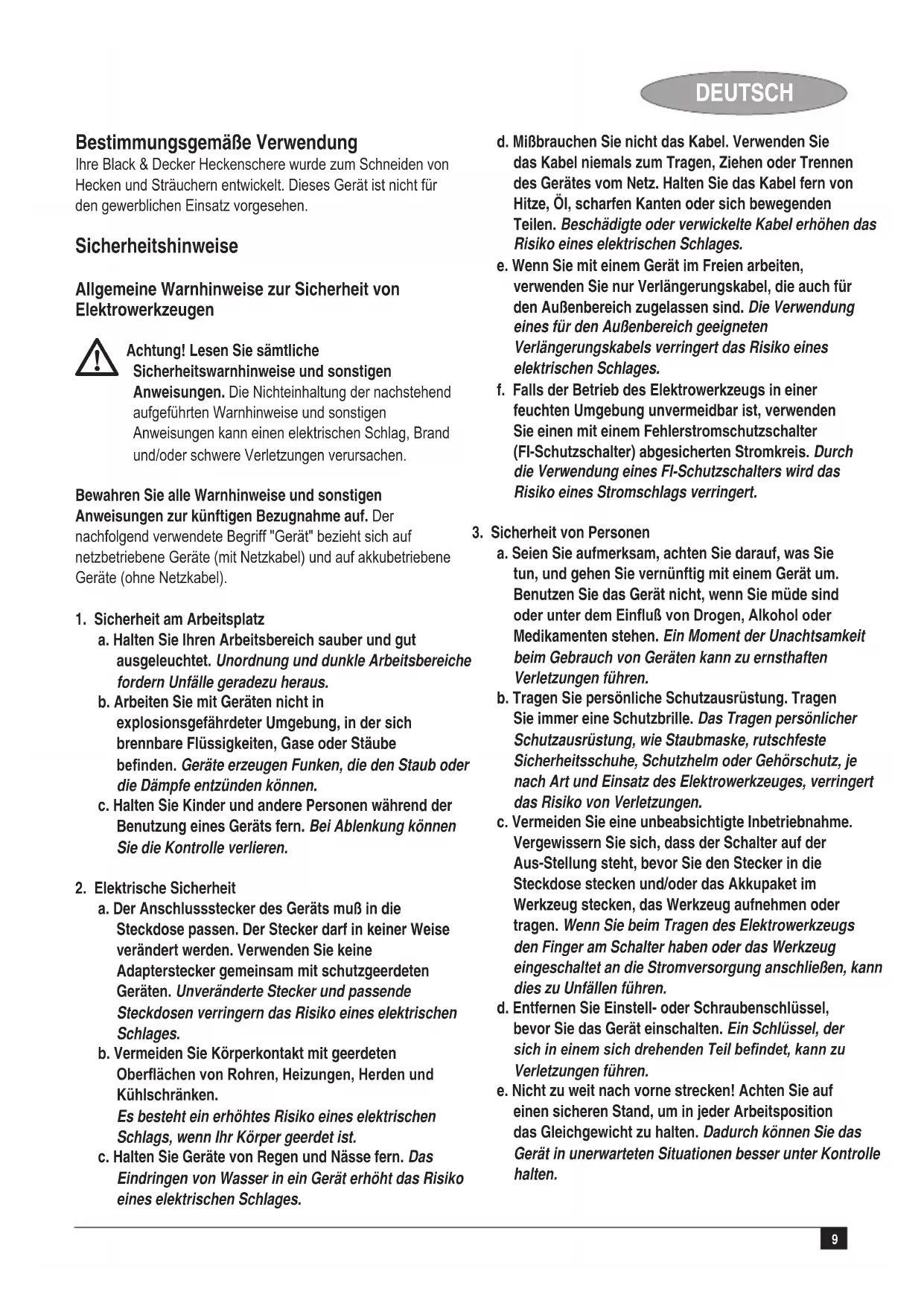 Diese Heckenschere weist folgende nützliche Merkmale auf: u Ergonomisch geformte Griffe für komfortables Schneiden.u Bearbeitete Messer für verbesserten Schnitt.u Gegenläuge Messer für verringerte Vibrationen. Montage Achtung! Vergewissern Sie sich vor der Montage, daß das Gerät ausgeschaltet, der Netzstecker gezogen und die Messerhülle auf den Messern angebracht ist. Anbringen der Schutzvorrichtung (Abb. A) u Setzen Sie die Schutzvorrichtung (4) in den Rillen (8) ein.u Befestigen Sie den Handschutz mit Hilfe der beiden im Lieferumfang enthaltenen Schrauben (9). Achtung! Verwenden Sie das Gerät nie ohne den Handschutz. Anschließen des Geräts an die Stromversorgung (Abb. B) Falls das Gerät nicht mit einem Netzkabel ausgestattet ist, müssen Sie ein Verlängerungskabel mit dem Netzanschluss verbinden. u Schließen Sie die Steckerbuchse eines geeigneten Verlängerungskabels an den Netzanschluss des Geräts an. u Haken Sie eine Schleife des Kabels wie abgebildet hinter die Zugentlastung (7), damit sich das Verlängerungskabel während des Gebrauchs nicht lösen kann. u Stecken Sie den Netzstecker in eine Steckdose. Achtung! Das Verlängerungskabel muss für den Einsatz im Freien geeignet sein. Rollen Sie das Kabel bei Verwendung einer Kabeltrommel immer völlig aus. Restrisiken. Für den Gebrauch dieses Geräts verbleiben zusätzliche Restrisiken, die möglicherweise nicht in den Sicherheitswarnungen genannt werden. Diese Risiken bestehen beispielsweise bei Missbrauch oder längerem Gebrauch. Auch bei der Einhaltung der entsprechenden Sicherheitsvorschriften und der Verwendung aller Sicherheitsgeräte bestehen weiterhin bestimmte Restrisiken. Diese werden im Folgenden aufgeführt: u Verletzungen, die durch das Berühren von sich drehenden/bewegenden Teilen verursacht werden. u Verletzungen, die durch das Austauschen von Teilen, Messern oder Zubehör verursacht werden. u Verletzungen, die durch längeren Gebrauch eines Geräts verursacht werden. Legen Sie bei längerem Gebrauch regelmäßige Pausen ein. u Beeinträchtigung des Gehörs. u Gesundheitsrisiken durch das Einatmen von Staub beim Gebrauch des Geräts (Beispielsweise bei Holzarbeiten, insbesondere Eiche, Buche und Pressspan). Gebrauch Achtung! Beschleunigen Sie den Arbeitsvorgang nicht mit Gewalt. Vermeiden Sie eine Überlastung des Gerätes. u Führen Sie das Kabel sorgfältig, damit Sie es nicht versehentlich durchschneiden. Es empehlt sich, das Kabel zu führen, indem Sie es über die Schulter legen. u Aus Sicherheitsgründen ist dieses Gerät mit einem Doppelschaltersystem ausgestattet. Dieses System verhindert ein unbeabsichtigtes Einschalten des Geräts und erlaubt den Betrieb nur, wenn Sie das Gerät in beiden Händen halten. Ein- und Ausschalten Einschalten u Fassen Sie den vorderen Handgriff (3) fest mit einer Hand, damit der Zweithandschalter (2) in das Gerätegehäuse gedrückt wird. u Betätigen Sie mit der anderen Hand den Betriebsschalter (1), um das Gerät zu starten. Ausschalten u Lassen Sie den Handgriffschalter (2) oder den Betriebsschalter (1) los. Achtung! Versuchen Sie nie, einen Schalter in eingeschaltetem Zustand zu blockieren. Hinweise für optimale Arbeitsergebnisse u Schneiden Sie zuerst die Oberseite der Hecke. Neigen Sie das Gerät ein wenig (max. 15° von der Schnittlinie), damit die Messerspitzen mehr in Richtung der Hecke zeigen (Abb. C1). So schneiden die Messer besser. Halten Sie das Gerät im gewünschten Winkel und bewegen Sie es gleichmäßig entlang der Schnittlinie. Da die Messer an beiden Seiten schneiden, können Sie sowohl nach links als auch nach rechts schneiden. u Um einen sehr geraden Schnitt zu erzielen, spannen Sie auf der gewünschten Höhe eine Schnur über die gesamte Länge der Hecke. Verwenden Sie die Schnur als Bezugslinie und schneiden Sie unmittelbar oberhalb der Schnur.13 DEUTSCH u Um ache Seiten zu erhalten, schneiden Sie aufwärts. Wenn die Messer nach unten schneiden, bewegen sich jüngere Zweige nach außen und bilden schmale Fetzen in der Hecke (Abb. C2). u Achten Sie darauf, daß Sie nicht auf Fremdkörper stoßen. Passen Sie speziell auf harte Objekte wie Metalldraht und Gitter auf, da diese die Messer beschädigen können. u Ölen Sie die Messer regelmäßig. Wann sollte man schneiden u Im allgemeinen sind Hecken, die ihr Laub im Herbst verlieren, im Juni und im Oktober zu schneiden. u Immergrüne Hecken sind im April und im August zu schneiden. u Koniferen und andere schnell wachsende Straucharten können ab Mai etwa alle 6 Wochen geschnitten werden. Wartung Ihr Black & Decker Gerät wurde im Hinblick auf eine lange Lebensdauer und einen möglichst geringen Wartungsaufwand entwickelt. Ein dauerhafter, einwandfreier Betrieb setzt eine regelmäßige Pege und Reinigung voraus. Achtung! Bevor Sie irgendwelche Wartungsarbeiten vornehmen, schalten Sie das Gerät aus, und ziehen Sie den Netzstecker. u Reinigen Sie nach dem Gebrauch vorsichtig die Messer. Geben Sie nach dem Reinigen zum Schutz vor Korrosion ein wenig Maschinenöl auf die Messer. u Reinigen Sie regelmäßig die Lüftungsschlitze im Gerät mit Hilfe einer weichen Bürste oder eines trockenen Tuches. u Reinigen Sie regelmäßig das Motorgehäuse mit Hilfe eines feuchten Tuches. Verwenden Sie keine scheuernden Reinigungsmittel oder Reinigungsmittel auf Lösungsmittelbasis. u Stellen Sie vor und nach dem Gebrauch sicher, dass alle Schalter frei von Verunreinigungen sind. Entfernen des Handschutzes (Abb. A) Achtung! Entfernen Sie den Handschutz ausschließlich zu Wartungszwecken. Bringen Sie immer den Handschutz nach der Wartung an. u Lösen Sie die Schrauben (9) und entfernen Sie sie.u Schieben Sie die Schutzvorrichtung (4) vom Werkzeug herunter. Störungsbehebung Falls das Gerät nicht einwandfrei arbeitet, überprüfen Sie Folgendes: Störung Mögliche Ursache Abhilfe Das Gerät. Die Sicherung Erneuern startet nicht. ist durchgebrannt. Sie die Sicherung. Der Schutzschalter Überprüfen Sie den hat ausg