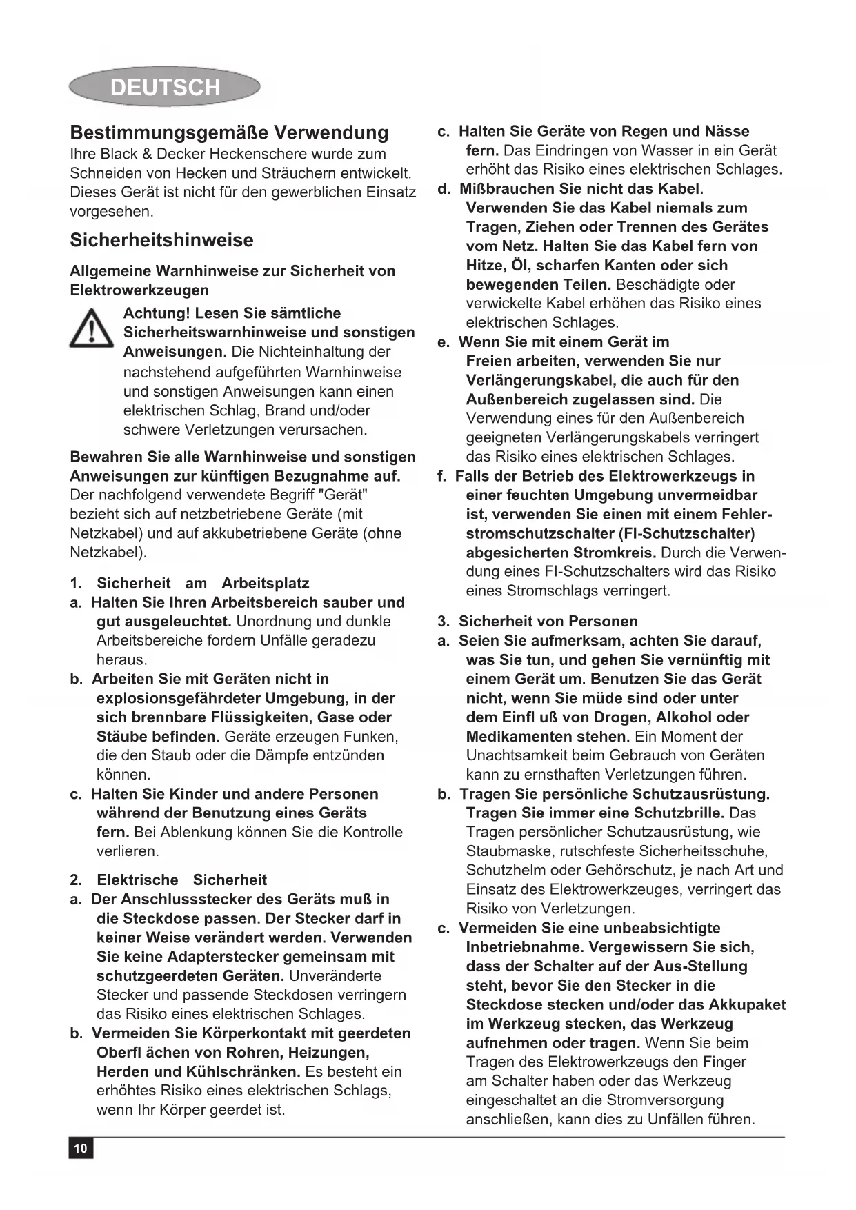 a. Seien Sie aufmerksam, achten Sie darauf, was Sie tun, und gehen Sie vernünftig mit einem Gerät um. Benutzen Sie das Gerät nicht, wenn Sie müde sind oder unter dem Einfl uß von Drogen, Alkohol oder Medikamenten stehen. Ein Moment der Unachtsamkeit beim Gebrauch von Geräten kann zu ernsthaften Verletzungen führen. b. Tragen Sie persönliche Schutzausrüstung. Tragen Sie immer eine Schutzbrille. Das Tragen persönlicher Schutzausrüstung, wie Staubmaske, rutschfeste Sicherheitsschuhe, Schutzhelm oder Gehörschutz, je nach Art und Einsatz des Elektrowerkzeuges, verringert das Risiko von Verletzungen. c. Vermeiden Sie eine unbeabsichtigte Inbetriebnahme. Vergewissern Sie sich, dass der Schalter auf der Aus-Stellung steht, bevor Sie den Stecker in die Steckdose stecken und/oder das Akkupaket im Werkzeug stecken, das Werkzeug aufnehmen oder tragen. Wenn Sie beim Tragen des Elektrowerkzeugs den Finger am Schalter haben oder das Werkzeug eingeschaltet an die Stromversorgung anschließen, kann dies zu Unfällen führen. Bestimmungsgemäße Verwendung Ihre Black & Decker Heckenschere wurde zum Schneiden von Hecken und Sträuchern entwickelt. Dieses Gerät ist nicht für den gewerblichen Einsatz vorgesehen. Sicherheitshinweise Allgemeine Warnhinweise zur Sicherheit von Elektrowerkzeugen Achtung! Lesen Sie sämtliche Sicherheitswarnhinweise und sonstigen Anweisungen. Die Nichteinhaltung der nachstehend aufgeführten Warnhinweise und sonstigen Anweisungen kann einen elektrischen Schlag, Brand und/oder schwere Verletzungen verursachen. Bewahren Sie alle Warnhinweise und sonstigen Anweisungen zur künftigen Bezugnahme auf. Der nachfolgend verwendete Begriff "Gerät" bezieht sich auf netzbetriebene Geräte (mit Netzkabel) und auf akkubetriebene Geräte (ohne Netzkabel).