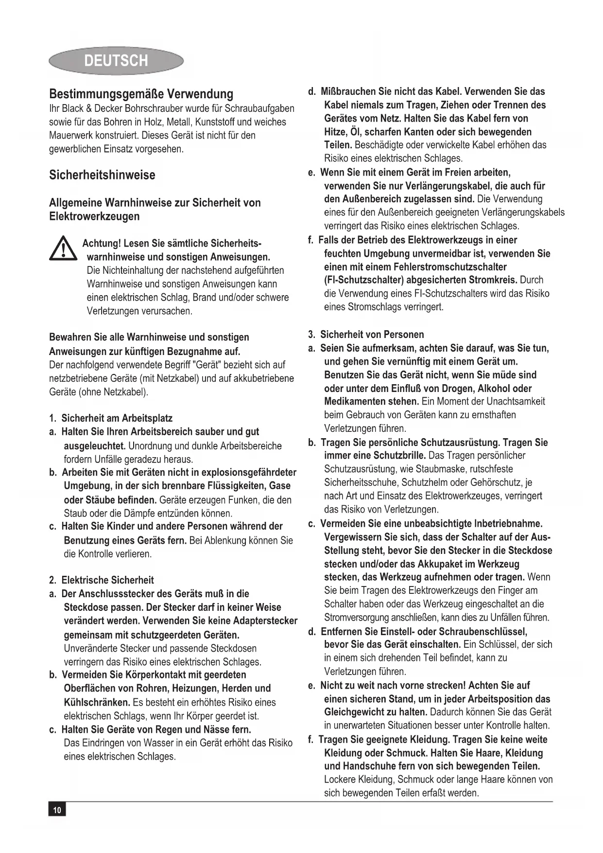Ihr Black & Decker Bohrschrauber wurde für Schraubaufgaben sowie für das Bohren in Holz, Metall, Kunststoff und weiches Mauerwerk konstruiert. Dieses Gerät ist nicht für den gewerblichen Einsatz vorgesehen.
