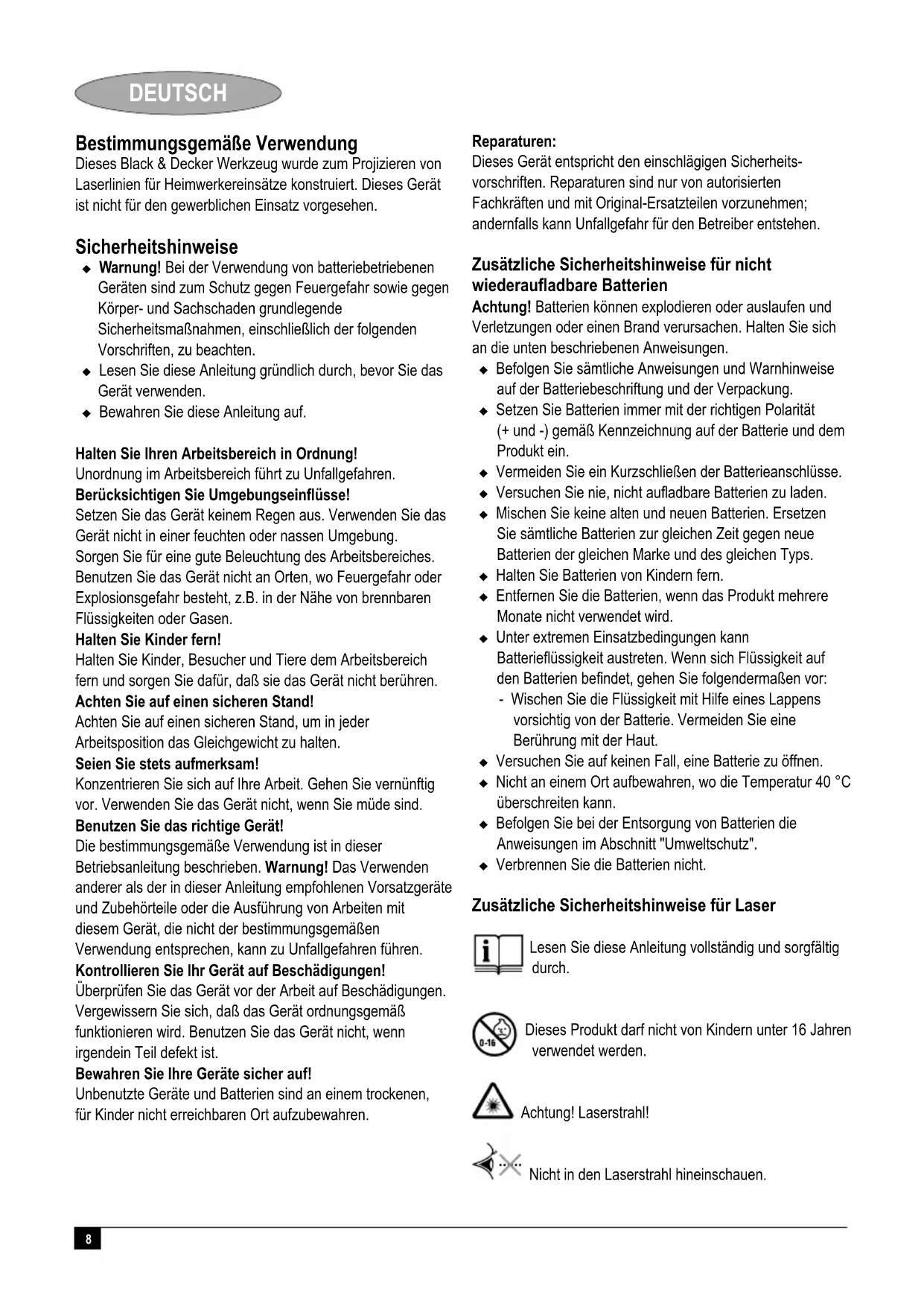 Kevin Hewitt Director of Consumer Engineering Spennymoor, County Durham DL16 6JG, United Kingdom 01-10-2006 Guarantee Black & Decker is confident of the quality of its products and offers an outstanding guarantee. This guarantee statement is in addition to and in no way prejudices your statutory rights. The guarantee is valid within the territories of the Member States of the European Union and the European Free Trade Area. If a Black & Decker product becomes defective due to faulty materials, workmanship or lack of conformity, within 24 months from the date of purchase, Black & Decker guarantees to replace defective parts, repair products subjected to fair wear and tear or replace such products to ensure minimum inconvenience to the customer unless:7 ENGLISH The product has been used for trade, professional or hire purposes; The product has been subjected to misuse or neglect; The product has sustained damage through foreign objects, substances or accidents; Repairs have been attempted by persons other than authorised repair agents or Black & Decker service staff. To claim on the guarantee, you will need to submit proof of purchase to the seller or an authorised repair agent. You can check the location of your nearest authorised repair agent by contacting your local Black & Decker office at the address indicated in this manual. Alternatively, a list of authorised Black & Decker repair agents and full details of our after-sales service and contacts are available on the Internet at: www.2helpU.com Please visit our website www.blackanddecker.co.uk to register your new Black & Decker product and to be kept up to date on new products and special offers. Further information on the Black & Decker brand and our range of products is available at www.blackanddecker.co.uk8 DEUTSCH Bestimmungsgemäße Verwendung Dieses Black & Decker Werkzeug wurde zum Projizieren von Laserlinien für Heimwerkereinsätze konstruiert. Dieses Gerät ist nicht für den gewerblichen Einsatz vorgesehen. Sicherheitshinweise Warnung! Bei der Verwendung von batteriebetriebenen Geräten sind zum Schutz gegen Feuergefahr sowie gegen Körper- und Sachschaden grundlegende Sicherheitsmaßnahmen, einschließlich der folgenden Vorschriften, zu beachten. Lesen Sie diese Anleitung gründlich durch, bevor Sie das Gerät verwenden. Bewahren Sie diese Anleitung auf. Halten Sie Ihren Arbeitsbereich in Ordnung! Unordnung im Arbeitsbereich führt zu Unfallgefahren. Berücksichtigen Sie Umgebungseinflüsse! Setzen Sie das Gerät keinem Regen aus. Verwenden Sie das Gerät nicht in einer feuchten oder nassen Umgebung. Sorgen Sie für eine gute Beleuchtung des Arbeitsbereiches. Benutzen Sie das Gerät nicht an Orten, wo Feuergefahr oder Explosionsgefahr besteht, z.B. in der Nähe von brennbaren Flüssigkeiten oder Gasen. Halten Sie Kinder fern! Halten Sie Kinder, Besucher und Tiere dem Arbeitsbereich fern und sorgen Sie dafür, daß sie das Gerät nicht berühren. Achten Sie auf einen sicheren Stand! Achten Sie auf einen sicheren Stand, um in jeder Arbeitsposition das Gleichgewicht zu halten. Seien Sie stets aufmerksam! Konzentrieren Sie sich auf Ihre Arbeit. Gehen Sie vernünftig vor. Verwenden Sie das Gerät nicht, wenn Sie müde sind. Benutzen Sie das richtige Gerät! Die bestimmungsgemäße Verwendung ist in dieser Betriebsanleitung beschrieben. Warnung! Das Verwenden anderer als der in dieser Anleitung empfohlenen Vorsatzgeräte und Zubehörteile oder die Ausführung von Arbeiten mit diesem Gerät, die nicht der bestimmungsgemäßen Verwendung entsprechen, kann zu Unfallgefahren führen. Kontrollieren Sie Ihr Gerät auf Beschädigungen! Überprüfen Sie das Gerät vor der Arbeit auf Beschädigungen. Vergewissern Sie sich, daß das Gerät ordnungsgemäß funktionieren wird. Benutzen Sie das Gerät nicht, wenn irgendein Teil defekt ist. Bewahren Sie Ihre Geräte sicher auf! Unbenutzte Geräte und Batterien sind an einem trockenen, für Kinder nicht erreichbaren Ort aufzubewahren. Reparaturen: Dieses Gerät entspricht den einschlägigen Sicherheits- vorschriften. Reparaturen sind nur von autorisierten Fachkräften und mit Original-Ersatzteilen vorzunehmen; andernfalls kann Unfallgefahr für den Betreiber entstehen. Zusätzliche Sicherheitshinweise für nicht wiederaufladbare Batterien Achtung! Batterien können explodieren oder auslaufen und Verletzungen oder einen Brand verursachen. Halten Sie sich an die unten beschriebenen Anweisungen. Befolgen Sie sämtliche Anweisungen und Warnhinweise auf der Batteriebeschriftung und der Verpackung. Setzen Sie Batterien immer mit der richtigen Polarität (+ und -) gemäß Kennzeichnung auf der Batterie und dem Produkt ein. Vermeiden Sie ein Kurzschließen der Batterieanschlüsse. Versuchen Sie nie, nicht aufladbare Batterien zu laden. Mischen Sie keine alten und neuen Batterien. Ersetzen Sie sämtliche Batterien zur gleichen Zeit gegen neue Batterien der gleichen Marke und des gleichen Typs. Halten Sie Batterien von Kindern fern. Entfernen Sie die Batterien, wenn das Produkt mehrere Monate nicht verwendet wird. Unter extremen Einsatzbedingungen kann Batterieflüssigkeit austreten. Wenn sich Flüssigkeit auf den Batterien befindet, gehen Sie folgendermaßen vor: - Wischen Sie die Flüssigkeit mit Hilfe eines Lappens vorsichtig von der Batterie. Vermeiden Sie eine Berührung mit der Haut. Versuchen Sie auf keinen Fall, eine Batterie zu öffnen. Nicht an einem Ort aufbewahren, wo die Temperatur 40 °C überschreiten kann. Befolgen Sie bei der Entsorgung von Batterien die Anweisungen im Abschnitt "Umweltschutz". Verbrennen Sie die Batterien nicht. Zusätzliche Sicherheitshinweise für Laser Lesen Sie diese Anleitung vollständig und sorgfältig durch. Dieses Produkt darf nicht von Kindern unter 16 Jahren verwendet werden. Achtung! Laserstrahl! Nicht in den Laserstrahl hineinschauen.9 DEUTSCH Den Laserstrahl nicht direkt mit optischen Instrumenten betrachten. Siehe Charakteristiken des Laserprodukts. Dies
