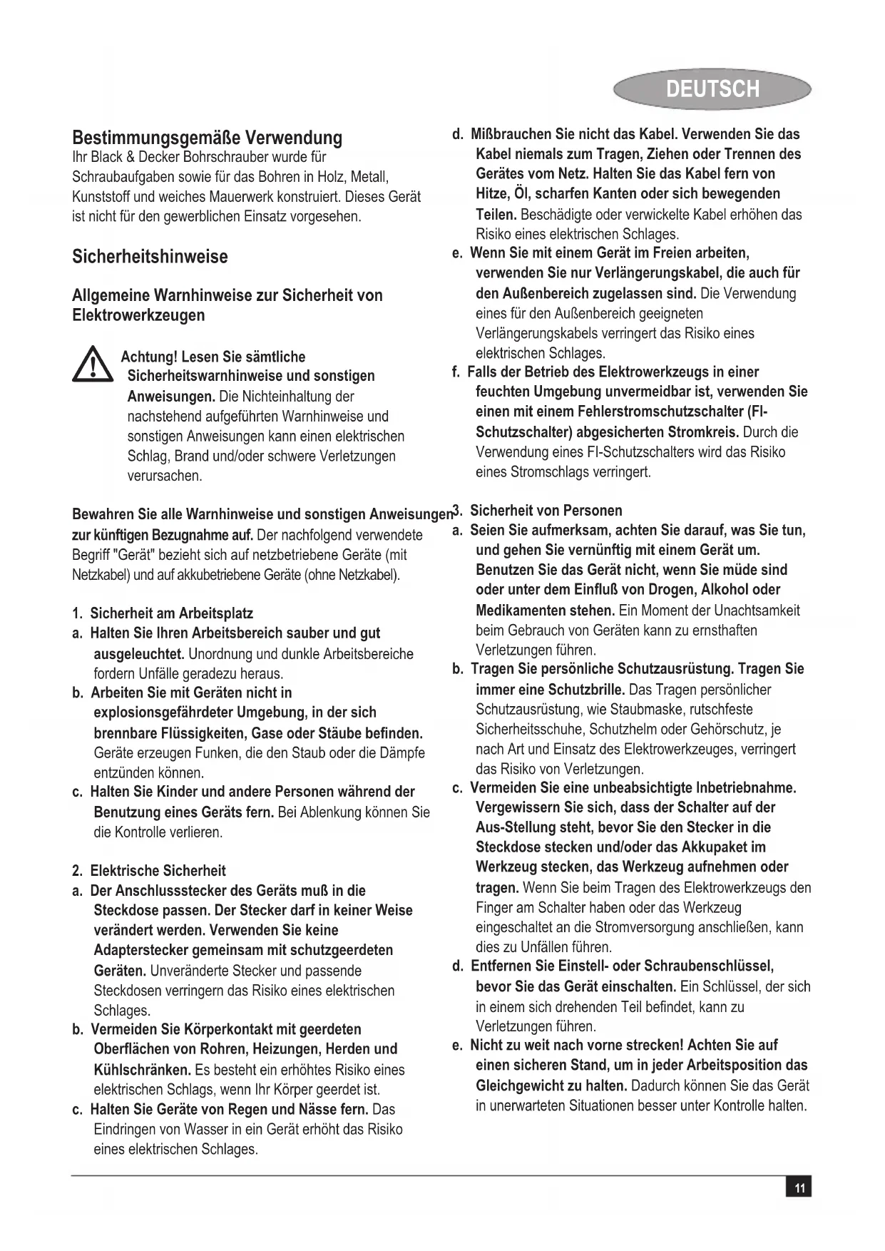 a. Halten Sie Ihren Arbeitsbereich sauber und gut ausgeleuchtet. Unordnung und dunkle Arbeitsbereiche fordern Unfälle geradezu heraus. b. Arbeiten Sie mit Geräten nicht in explosionsgefährdeter Umgebung, in der sich brennbareFlüssigkeiten,GaseoderStäubebenden. Geräte erzeugen Funken, die den Staub oder die Dämpfe entzünden können. c. Halten Sie Kinder und andere Personen während der Benutzung eines Geräts fern. Bei Ablenkung können Sie die Kontrolle verlieren.