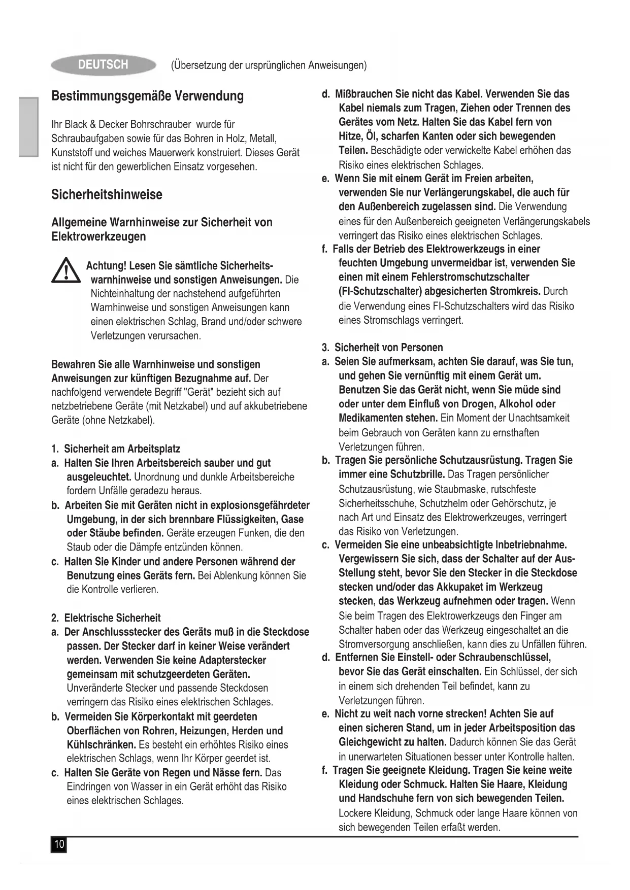 (Übersetzung der ursprünglichen Anweisungen) DEUTSCH Garantie Black & Decker vertraut auf die Qualität der eigenen Geräte und bietet dem Käufer eine außergewöhnliche Garantie. Diese Garantiezusage versteht sich unbeschadet der gesetzlichen Gewährleistungsansprüche und schränkt diese keinesfalls ein. Sie gilt in sämtlichen Mitgliedsstaaten der Europäischen Union und der Europäischen Freihandelszone EFTA. Tritt innerhalb von 24 Monaten ab Kaufdatum an einem Gerät von Black & Decker ein auf Material- oder Verarbeitungsfehler zurückzuführender Mangel auf, garantiert Black & Decker den Austausch defekter Teile, die Reparatur von Geräten mit üblichem Verschleiß bzw. den Austausch eines mangelhaften Geräts, ohne den Kunden dabei mehr als unbedingt nötig in Anspruch zu nehmen, allerdings vorbehaltlich folgender Ausnahmen: u wenn das Gerät gewerblich, beruich oder im Verleihgeschäft benutzt wurde; u wenn das Gerät mißbräuchlich verwendet oder mit mangelnder Sorgfalt behandelt wurde; u wenn das Gerät durch irgendwelche Fremdeinwirkung beschädigt wurde; u wenn ein unbefugter Reparaturversuch durch anderes Personal als das einer Vertragswerkstatt oder des Black & Decker-Kundendienstes unternommen wurde. Zur Inanspruchnahme dieser Garantie ist dem Verkäufer bzw. der Vertragswerkstatt ein Kaufnachweis vorzulegen. Der Kaufnachweis muß Kaufdatum und Gerätetyp bescheinigen. Die Adresse des zuständigen Büros von Black & Decker steht in dieser Anleitung, darüber läßt sich die nächstgelegene Vertragswerkstatt ermitteln. Außerdem ist eine Liste der Vertragswerkstätten und aller Kundendienststellen von Black & Decker sowie der zuständigen Ansprechpartner im Internet zu nden unter: www.2helpU.com Bitte besuchen Sie untere Webseite www.blackanddecker.de, um Ihr neues Black & Decker Produkt zu registrieren und über neue Produkte und Sonderangebote aktuell informiert zu werden. Weitere Informationen über die Marke Black & Decker und unsere Produkte nden Sie unter www.blackanddecker.de18 (Traduction des instructions initiales) FRANÇAIS Utilisation prévue Votre perceuse / tournevis Black & Decker a été conçue pour la pose de vis et pour le perçage du bois, du métal, des matières plastiques et de la maçonnerie légère. Cet outil a été conçu pour une utilisation exclusivement domestique. Instructions de sécurité Consignes de sécurité générales pour les outils électriques