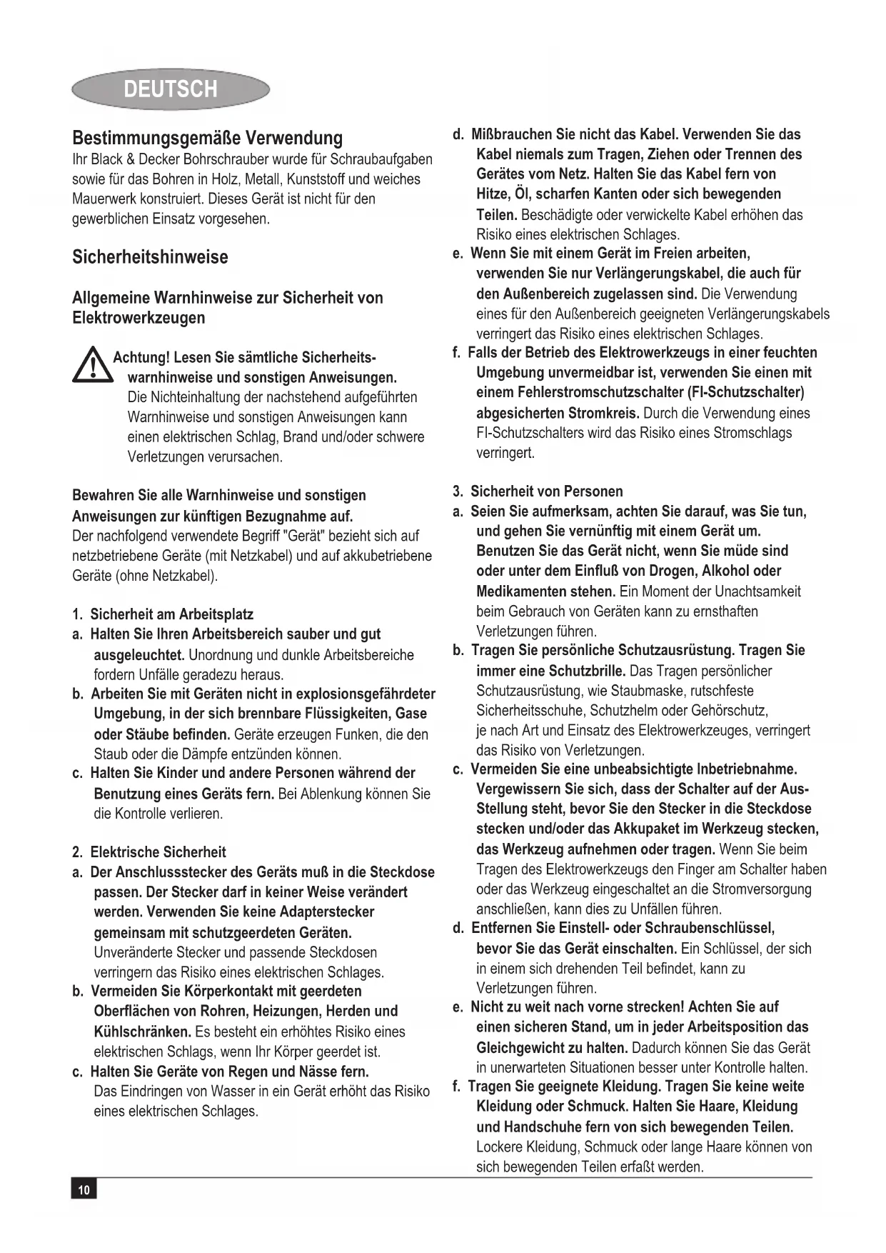 Achtung! Lesen Sie sämtliche Sicherheits- warnhinweise und sonstigen Anweisungen. Die Nichteinhaltung der nachstehend aufgeführten Warnhinweise und sonstigen Anweisungen kann einen elektrischen Schlag, Brand und/oder schwere Verletzungen verursachen. Bewahren Sie alle Warnhinweise und sonstigen Anweisungen zur künftigen Bezugnahme auf. Der nachfolgend verwendete Begriff "Gerät" bezieht sich auf netzbetriebene Geräte (mit Netzkabel) und auf akkubetriebene Geräte (ohne Netzkabel).