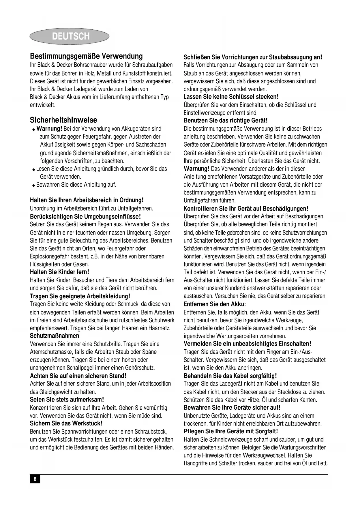 Colin Wills, Director of Engineering BDCI, 4/F, 2 Dai Wang Street Tai Po Industrial Estate Tai Po NT, Hong Kong Guarantee Black & Decker is confident of the quality of its products and offers an outstanding guarantee. This guarantee statement is in addition to and in no way prejudices your statutory rights. The guarantee is valid within the territories of the Member States of the European Union and the European Free Trade Area. If a Black & Decker product becomes defective due to faulty materials, workmanship or lack of conformity, within 24 months from the date of purchase, Black & Decker guarantees to replace defective parts, repair products subjected to fair wear and tear or replace such products to ensure minimum inconvenience to the customer unless: ◆ The product has been used for trade, professional or hire purposes; ◆ The product has been subjected to misuse or neglect; ◆ The product has sustained damage through foreign objects, substances or accidents; ◆ Repairs have been attempted by persons other than authorised repair agents or Black & Decker service staff. To claim on the guarantee, you will need to submit proof of purchase to the seller or an authorised repair agent. You can check the location of your nearest authorised repair agent by contacting your local Black & Decker office at the address indicated in this manual. Alternatively, a list of authorised Black & Decker repair agents and full details of our after-sales service and contacts are available on the Internet at: www.2helpU.com8 DEUTSCH Bestimmungsgemäße Verwendung Ihr Black & Decker Bohrschrauber wurde für Schraubaufgaben sowie für das Bohren in Holz, Metall und Kunststoff konstruiert. Dieses Gerät ist nicht für den gewerblichen Einsatz vorgesehen. Ihr Black & Decker Ladegerät wurde zum Laden von Black & Decker Akkus vom im Lieferumfang enthaltenen Typ entwickelt. Sicherheitshinweise ◆ Warnung! Bei der Verwendung von Akkugeräten sind zum Schutz gegen Feuergefahr, gegen Austreten der Akkuflüssigkeit sowie gegen Körper- und Sachschaden grundlegende Sicherheitsmaßnahmen, einschließlich der folgenden Vorschriften, zu beachten. ◆ Lesen Sie diese Anleitung gründlich durch, bevor Sie das Gerät verwenden. ◆ Bewahren Sie diese Anleitung auf. Halten Sie Ihren Arbeitsbereich in Ordnung! Unordnung im Arbeitsbereich führt zu Unfallgefahren. Berücksichtigen Sie Umgebungseinflüsse! Setzen Sie das Gerät keinem Regen aus. Verwenden Sie das Gerät nicht in einer feuchten oder nassen Umgebung. Sorgen Sie für eine gute Beleuchtung des Arbeitsbereiches. Benutzen Sie das Gerät nicht an Orten, wo Feuergefahr oder Explosionsgefahr besteht, z.B. in der Nähe von brennbaren Flüssigkeiten oder Gasen. Halten Sie Kinder fern! Halten Sie Kinder, Besucher und Tiere dem Arbeitsbereich fern und sorgen Sie dafür, daß sie das Gerät nicht berühren. Tragen Sie geeignete Arbeitskleidung! Tragen Sie keine weite Kleidung oder Schmuck, da diese von sich bewegenden Teilen erfaßt werden können. Beim Arbeiten im Freien sind Arbeitshandschuhe und rutschfestes Schuhwerk empfehlenswert. Tragen Sie bei langen Haaren ein Haarnetz. Schutzmaßnahmen Verwenden Sie immer eine Schutzbrille. Tragen Sie eine Atemschutzmaske, falls die Arbeiten Staub oder Späne erzeugen können. Tragen Sie bei einem hohen oder unangenehmen Schallpegel immer einen Gehörschutz. Achten Sie auf einen sicheren Stand! Achten Sie auf einen sicheren Stand, um in jeder Arbeitsposition das Gleichgewicht zu halten. Seien Sie stets aufmerksam! Konzentrieren Sie sich auf Ihre Arbeit. Gehen Sie vernünftig vor. Verwenden Sie das Gerät nicht, wenn Sie müde sind. Sichern Sie das Werkstück! Benutzen Sie Spannvorrichtungen oder einen Schraubstock, um das Werkstück festzuhalten. Es ist damit sicherer gehalten und ermöglicht die Bedienung des Gerätes mit beiden Händen. Schließen Sie Vorrichtungen zur Staubabsaugung an! Falls Vorrichtungen zur Absaugung oder zum Sammeln von Staub an das Gerät angeschlossen werden können, vergewissern Sie sich, daß diese angeschlossen sind und ordnungsgemäß verwendet werden. Lassen Sie keine Schlüssel stecken! Überprüfen Sie vor dem Einschalten, ob die Schlüssel und Einstellwerkzeuge entfernt sind. Benutzen Sie das richtige Gerät! Die bestimmungsgemäße Verwendung ist in dieser Betriebs- anleitung beschrieben. Verwenden Sie keine zu schwachen Geräte oder Zubehörteile für schwere Arbeiten. Mit dem richtigen Gerät erzielen Sie eine optimale Qualität und gewährleisten Ihre persönliche Sicherheit. Überlasten Sie das Gerät nicht. Warnung! Das Verwenden anderer als der in dieser Anleitung empfohlenen Vorsatzgeräte und Zubehörteile oder die Ausführung von Arbeiten mit diesem Gerät, die nicht der bestimmungsgemäßen Verwendung entsprechen, kann zu Unfallgefahren führen. Kontrollieren Sie Ihr Gerät auf Beschädigungen! Überprüfen Sie das Gerät vor der Arbeit auf Beschädigungen. Überprüfen Sie, ob alle beweglichen Teile richtig montiert sind, ob keine Teile gebrochen sind, ob keine Schutzvorrichtungen und Schalter beschädigt sind, und ob irgendwelche andere Schäden den einwandfreien Betrieb des Gerätes beeinträchtigen könnten. Vergewissern Sie sich, daß das Gerät ordnungsgemäß funktionieren wird. Benutzen Sie das Gerät nicht, wenn irgendein Teil defekt ist. Verwenden Sie das Gerät nicht, wenn der Ein-/ Aus-Schalter nicht funktioniert. Lassen Sie defekte Teile immer von einer unserer Kundendienstwerkstätten reparieren oder austauschen. Versuchen Sie nie, das Gerät selber zu reparieren. Entfernen Sie den Akku: Entfernen Sie, falls möglich, den Akku, wenn Sie das Gerät nicht benutzen, bevor Sie irgendwelche Werkzeuge, Zubehörteile oder Geräteteile auswechseln und bevor Sie irgendwelche Wartungsarbeiten vornehmen. Vermeiden Sie ein unbeabsichtigtes Einschalten! Tragen Sie das Gerät nicht mit dem Finger am Ein-/Aus- Schalter. Vergewissern Sie sich, daß das Gerät ausgeschaltet ist, wenn Si