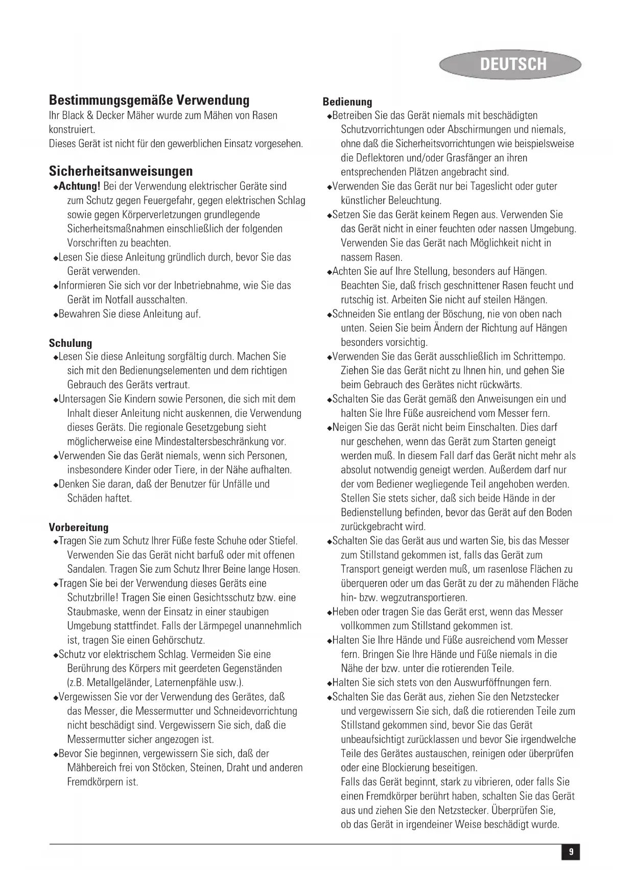 Kevin Hewitt Director of Consumer Engineering Spennymoor, County Durham DL16 6JG, United Kingdom 1-12-2004 Guarantee Black & Decker is confident of the quality of its products and offers an outstanding guarantee. This guarantee statement is in addition to and in no way prejudices your statutory rights. The guarantee is valid within the territories of the Member States of the European Union and the European Free Trade Area. If a Black & Decker product becomes defective due to faulty materials, workmanship or lack of conformity, within 24 months from the date of purchase, Black & Decker guarantees to replace defective parts, repair products subjected to fair wear and tear or replace such products to ensure minimum inconvenience to the customer unless: ◆ The product has been used for trade, professional or hire purposes; ◆ The product has been subjected to misuse or neglect; ◆ The product has sustained damage through foreign objects, substances or accidents; ◆ Repairs have been attempted by persons other than authorised repair agents or Black & Decker service staff. To claim on the guarantee, you will need to submit proof of purchase to the seller or an authorised repair agent. You can check the location of your nearest authorised repair agent by contacting your local Black & Decker office at the address indicated in this manual. Alternatively, a list of authorised Black & Decker repair agents and full details of our after-sales service and contacts are available on the Internet at: www.2helpU.com. Please visit our website www.blackanddecker.co.uk to register your new Black & Decker product and to be kept up to date on new products and special offers. Further information on the Black & Decker brand and our range of products is available at www.blackanddecker.co.uk.9 DEUTSCH Bestimmungsgemäße Verwendung Ihr Black & Decker Mäher wurde zum Mähen von Rasen konstruiert. Dieses Gerät ist nicht für den gewerblichen Einsatz vorgesehen. Sicherheitsanweisungen ◆ Achtung! Bei der Verwendung elektrischer Geräte sind zum Schutz gegen Feuergefahr, gegen elektrischen Schlag sowie gegen Körperverletzungen grundlegende Sicherheitsmaßnahmen einschließlich der folgenden Vorschriften zu beachten. ◆ Lesen Sie diese Anleitung gründlich durch, bevor Sie das Gerät verwenden. ◆ Informieren Sie sich vor der Inbetriebnahme, wie Sie das Gerät im Notfall ausschalten. ◆ Bewahren Sie diese Anleitung auf. Schulung ◆ Lesen Sie diese Anleitung sorgfältig durch. Machen Sie sich mit den Bedienungselementen und dem richtigen Gebrauch des Geräts vertraut. ◆ Untersagen Sie Kindern sowie Personen, die sich mit dem Inhalt dieser Anleitung nicht auskennen, die Verwendung dieses Geräts. Die regionale Gesetzgebung sieht möglicherweise eine Mindestaltersbeschränkung vor. ◆ Verwenden Sie das Gerät niemals, wenn sich Personen, insbesondere Kinder oder Tiere, in der Nähe aufhalten. ◆ Denken Sie daran, daß der Benutzer für Unfälle und Schäden haftet. Vorbereitung ◆ Tragen Sie zum Schutz Ihrer Füße feste Schuhe oder Stiefel. Verwenden Sie das Gerät nicht barfuß oder mit offenen Sandalen. Tragen Sie zum Schutz Ihrer Beine lange Hosen. ◆ Tragen Sie bei der Verwendung dieses Geräts eine Schutzbrille! Tragen Sie einen Gesichtsschutz bzw. eine Staubmaske, wenn der Einsatz in einer staubigen Umgebung stattfindet. Falls der Lärmpegel unannehmlich ist, tragen Sie einen Gehörschutz. ◆ Schutz vor elektrischem Schlag. Vermeiden Sie eine Berührung des Körpers mit geerdeten Gegenständen (z.B. Metallgeländer, Laternenpfähle usw.). ◆ Vergewissen Sie vor der Verwendung des Gerätes, daß das Messer, die Messermutter und Schneidevorrichtung nicht beschädigt sind. Vergewissern Sie sich, daß die Messermutter sicher angezogen ist. ◆ Bevor Sie beginnen, vergewissern Sie sich, daß der Mähbereich frei von Stöcken, Steinen, Draht und anderen Fremdkörpern ist. Bedienung ◆ Betreiben Sie das Gerät niemals mit beschädigten Schutzvorrichtungen oder Abschirmungen und niemals, ohne daß die Sicherheitsvorrichtungen wie beispielsweise die Deflektoren und/oder Grasfänger an ihren entsprechenden Plätzen angebracht sind. ◆ Verwenden Sie das Gerät nur bei Tageslicht oder guter künstlicher Beleuchtung. ◆ Setzen Sie das Gerät keinem Regen aus. Verwenden Sie das Gerät nicht in einer feuchten oder nassen Umgebung. Verwenden Sie das Gerät nach Möglichkeit nicht in nassem Rasen. ◆ Achten Sie auf Ihre Stellung, besonders auf Hängen. Beachten Sie, daß frisch geschnittener Rasen feucht und rutschig ist. Arbeiten Sie nicht auf steilen Hängen. ◆ Schneiden Sie entlang der Böschung, nie von oben nach unten. Seien Sie beim Ändern der Richtung auf Hängen besonders vorsichtig. ◆ Verwenden Sie das Gerät ausschließlich im Schrittempo. Ziehen Sie das Gerät nicht zu Ihnen hin, und gehen Sie beim Gebrauch des Gerätes nicht rückwärts. ◆ Schalten Sie das Gerät gemäß den Anweisungen ein und halten Sie Ihre Füße ausreichend vom Messer fern. ◆ Neigen Sie das Gerät nicht beim Einschalten. Dies darf nur geschehen, wenn das Gerät zum Starten geneigt werden muß. In diesem Fall darf das Gerät nicht mehr als absolut notwendig geneigt werden. Außerdem darf nur der vom Bediener wegliegende Teil angehoben werden. Stellen Sie stets sicher, daß sich beide Hände in der Bedienstellung befinden, bevor das Gerät auf den Boden zurückgebracht wird. ◆ Schalten Sie das Gerät aus und warten Sie, bis das Messer zum Stillstand gekommen ist, falls das Gerät zum Transport geneigt werden muß, um rasenlose Flächen zu überqueren oder um das Gerät zu der zu mähenden Fläche hin- bzw. wegzutransportieren. ◆ Heben oder tragen Sie das Gerät erst, wenn das Messer vollkommen zum Stillstand gekommen ist. ◆ Halten Sie Ihre Hände und Füße ausreichend vom Messer fern. Bringen Sie Ihre Hände und Füße niemals in die Nähe der bzw. unter die rotierenden Teile. ◆ Halten Sie sich stets von den 