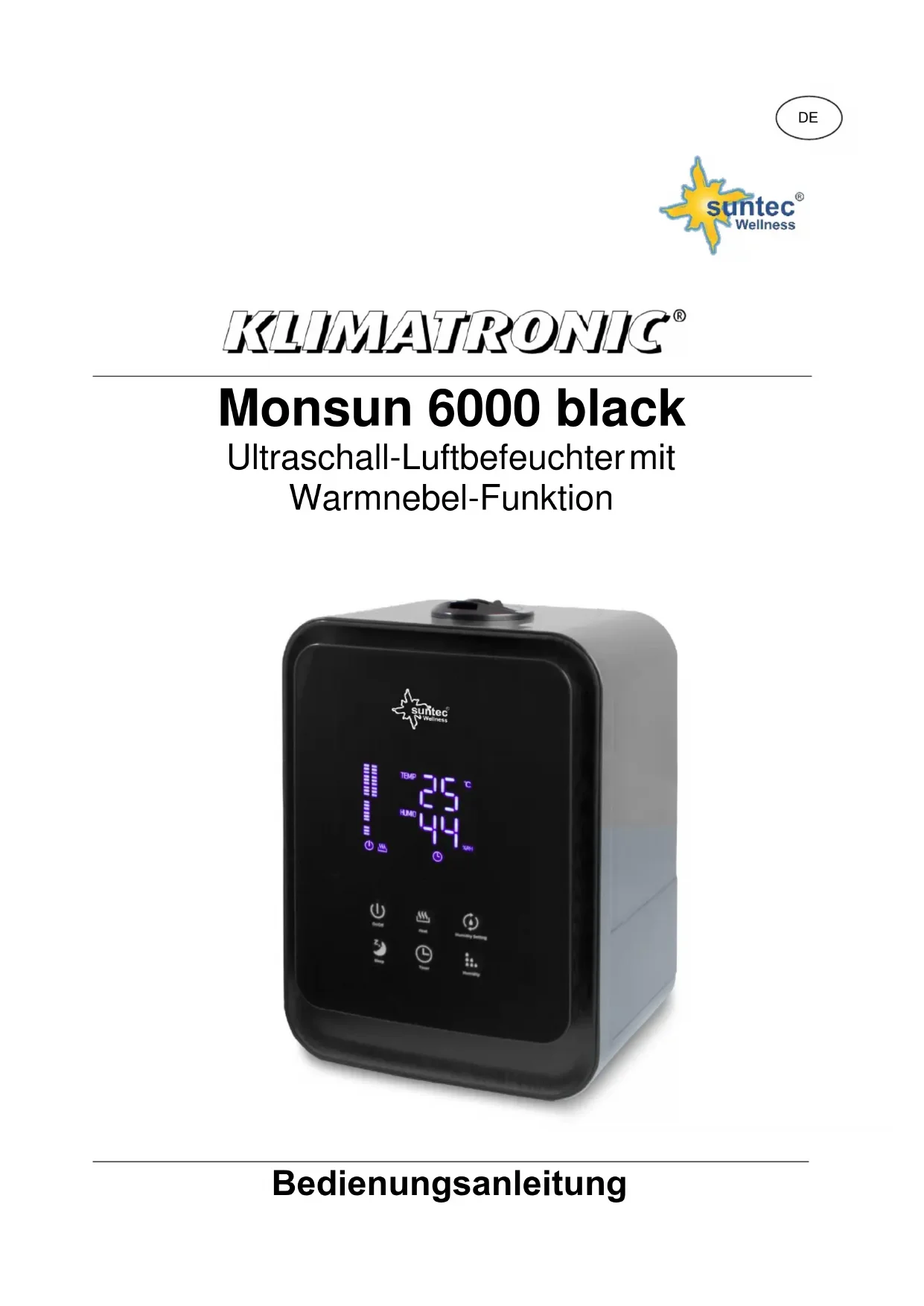 - Der Fachhändler oder Reparaturservice kann nach Ablauf der Garantie Reparaturen kostenpflichtig durchführen.Hinweise zum Umweltschutz Dieses Produkt darf am Ende seiner Lebensdauer nicht über den normalen Haushaltsabfall entsorgt werden, sondern muss an einem Sammelpunkt für das Recycling von elektrischen und elektronischen Geräten abgegeben werden. Das Symbol auf dem Produkt, der Gebrauchsanleitung oder der Verpackung weist darauf hin. Die Werkstoffe sind gemäß ihrer Kennzeichnung wieder verwertbar. Mit der Wiederverwendung, der stofflichen Verwertung oder anderen Formen der Verwertung von Altgeräten leisten Sie einen wichtigen Beitrag zum Schutze unserer Umwelt. Bitte erfragen Sie bei der Gemeindeverwaltung die zuständige Entsorgungsstelle. Im Rahmen unserer erweiterten Herstellerverantwortung ist dieses Gerät gemäß der Europäischen Richtlinie 2012/19/EU für Elektro- und Elektronik-Altgeräte (WEEE) gekennzeichnet. Ziel ist das Vermeiden, Verringern sowie umweltverträgliche Entsorgen an Elektronikschrott. Bitte helfen Sie aktiv mit, die Umwelt zu schonen und entsorgen Sie Elektroschrott über die örtlichen Sammelstellen. Die Verpackung sowie diese Bedienungsanleitung sind recycelbar. EG-Konformitätserklärung Das Gerät entspricht den wesentlichen Gesundheits- und Sicherheitsanforderungen der Europäischen Union. Die EG-Konformitätserklärung ist Basis für die CE-Kennzeichnung dieses Gerätes. Mit Erscheinen dieser Bedienungsanleitung verlieren alle bisherigen ihre Gültigkeit. SUNTEC, SUNTEC Wellness, KLIMATRONIC und das Sonnenlogo sind eingetragene Marken. © 2019/01 SUNTEC WELLNESS GMBH. Für Druckfehler und Irrtümer wird keine Haftung übernommen.