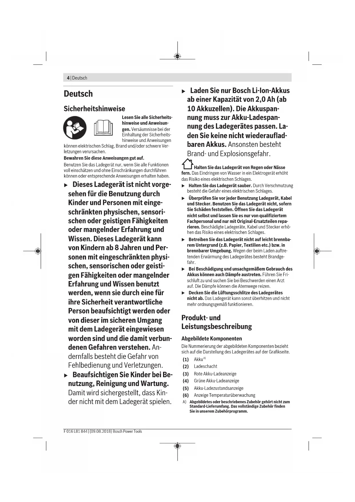 Akku-Ladespannung (auto- matische Spannungserken- nung) V 36 Ladestrom A 2,0 Zulässiger Ladetemperatur- bereich °C 0 – 45 Ladezeit bei Akku-Kapazität, ca. – 2,0 Ah min 65 – 4,0 Ah min 125 – 6,0 Ah min 185 Anzahl der Akkuzellen 10 – 30 Gewicht entsprechend EPTA-Procedure 01:2014 kg 0,55 Schutzklasse / II Betrieb Inbetriebnahme u Beachten Sie die Netzspannung! Die Spannung der Stromquelle muss mit den Angaben auf dem Typenschild des Ladegerätes übereinstimmen. Mit 230V gekenn- zeichnete Ladegeräte können auch an 220V betrieben werden. Ladevorgang Der Ladevorgang beginnt, sobald der Netzstecker des Lade- gerätes in die Steckdose gesteckt und der Akku (1) in den Ladeschacht (2) eingesteckt wird. Durch das intelligente Ladeverfahren wird der Ladezustand des Akkus automatisch erkannt und abhängig von Akkutem- peratur und -spannung mit dem jeweils optimalen Lade- strom geladen. Dadurch wird der Akku geschont und bleibt bei Aufbewah- rung im Ladegerät immer vollständig aufgeladen. Bedeutung der Anzeigeelemente Blinklicht grüne Akku-Ladeanzeige (4) Der Schnellladevorgang wird durch Blinken der grünen Akku-Ladeanzeige (4) signalisiert. Der Akku kann zu jedem Zeitpunkt heraus ge- nommen und verwendet werden. Hinweis: Der Ladevorgang ist nur möglich, wenn die Tempe- ratur des Akkus im zulässigen Ladetemperaturbereich ist, siehe Abschnitt „Technische Daten“. Dauerlicht grüne Akku-Ladeanzeige (4) Das Dauerlicht der grünen Akku-Ladeanzeige (4) signalisiert, dass der Akku vollständig auf- geladen ist. Der Akku kann anschließend zum sofortigen Gebrauch ent- nommen werden. Ohne eingesteckten Akku signalisiert das Dauerlicht der Ak- ku- Ladeanzeige (4), dass der Netzstecker in die Steckdose eingesteckt ist und das Ladegerät betriebsbereit ist. Dauerlicht rote Akku-Ladeanzeige (3) Das Dauerlicht der roten Akku-Ladeanzeige (3) signalisiert, dass die Temperatur des Ak- kus außerhalb des zulässigen Ladetemperatur- bereiches ist, siehe Abschnitt „Technische Da- ten“. Sobald der zulässige Temperaturbereich erreicht ist, beginnt der Ladevorgang. Blinklicht rote Akku-Ladeanzeige (3) Das Blinklicht der roten Akku-Ladeanzeige (3) signalisiert eine andere Störung des Ladevor- ganges, siehe Abschnitt „Fehler – Ursachen und Abhilfe“. Fehler – Ursachen und Abhilfe Ursache Abhilfe Rote Akku-Ladeanzeige (3) blinkt Kein Ladevorgang möglich Akku nicht (richtig) aufge- setzt Akku korrekt auf Ladegerät aufsetzen Akkukontakte verschmutzt Akkukontakte reinigen; z.B. durch mehrfaches Ein- und Ausstecken des Akkus, ggf. Akku ersetzen Akku defekt Akku ersetzen Akku-Ladeanzeigen (4) bzw. (3) leuchten nicht Netzstecker des Ladegerätes nicht (richtig) eingesteckt Netzstecker (vollständig) in die Steckdose einstecken Steckdose, Netzkabel oder Ladegerät defekt Netzspannung überprüfen, Ladegerät ggf. von einer au- torisierten Kundendienststel- le für Bosch-Elektrowerkzeu- ge überprüfen lassen Arbeitshinweise Bei kontinuierlichen bzw. mehrmals nacheinander folgenden Ladezyklen ohne Unterbrechung kann sich das Ladegerät er- wärmen. Dies ist jedoch unbedenklich und deutet nicht auf einen technischen Defekt des Ladegerätes hin. Eine wesentlich verkürzte Betriebszeit nach der Aufladung zeigt an, dass der Akku verbraucht ist und ersetzt werden muss. Deutsch | 5 Bosch Power Tools F 016 L81 844 | (09.08.2018)6 | English F 016 L81 844 | (09.08.2018) Bosch Power Tools Wartung und Service Wartung und Reinigung Wenn ein Ersatz der Anschlussleitung erforderlich ist, dann ist dies von Bosch oder einer autorisierten Kundendienst- stelle für Bosch-Elektrowerkzeuge auszuführen, um Sicher- heitsgefährdungen zu vermeiden. Kundendienst und Anwendungsberatung www.bosch-garden.com Geben Sie bei allen Rückfragen und Ersatzteilbestellungen bitte unbedingt die 10-stellige Sachnummer laut Typen- schild des Produkts an. Deutschland Robert Bosch Power Tools GmbH Servicezentrum Elektrowerkzeuge Zur Luhne 2 37589 Kalefeld – Willershausen Unter www.bosch-pt.de können Sie online Ersatzteile be- stellen oder Reparaturen anmelden. Kundendienst: Tel.: (0711) 40040480 Fax: (0711) 40040481 E-Mail: Servicezentrum.Elektrowerkzeuge@de.bosch.com Anwendungsberatung: Tel.: (0711) 40040480 Fax: (0711) 40040482 E-Mail: kundenberatung.ew@de.bosch.com Österreich Unter www.bosch-pt.at können Sie online Ersatzteile bestel- len. Tel.: (01) 797222010 Fax: (01) 797222011 E-Mail: service.elektrowerkzeuge@at.bosch.com Schweiz Unter www.bosch-pt.com/ch/de können Sie online Ersatz- teile bestellen. Tel.: (044) 8471511 Fax: (044) 8471551 E-Mail: Aftersales.Service@de.bosch.com Luxemburg Tel.: +32 2 588 0589 Fax: +32 2 588 0595 E-Mail: outillage.gereedschap@be.bosch.com Entsorgung Ladegeräte, Zubehör und Verpackungen sollen einer um- weltgerechten Wiederverwertung zugeführt werden. Werfen Sie Ladegeräte nicht in den Hausmüll! Nur für EU-Länder: Gemaß der Europaischen Richtlinie 2012/19/EU uber Elek- tro- und Elektronik- Altgerate und ihrer Umsetzung in natio- nales Recht mussen nicht mehr gebrauchsfahige Ladegeräte getrennt gesammelt und einer umweltgerechten Wiederver- wertung zugefuhrt werden. English Safety instructions Read all the safety and general instructions. Fail- ure to observe the safety and general instructions may result in electric shock, fire and/or serious injury. Store these instructions in a safe place. Only use the charger if you can fully evaluate all functions and carry them out without restrictions, or if you have re- ceived corresponding instructions. u This charger is not intended for use by children or persons with physical, sensory or mental limita- tions or a lack of experience or knowledge. This charger can be used by children aged 8 or older and by persons who have physical, sensory or mental limitations or a lack of experience or knowledge if a person responsible for their safety supervises them or has in- structed them in the safe opera- tion of the charger and they under- stand 