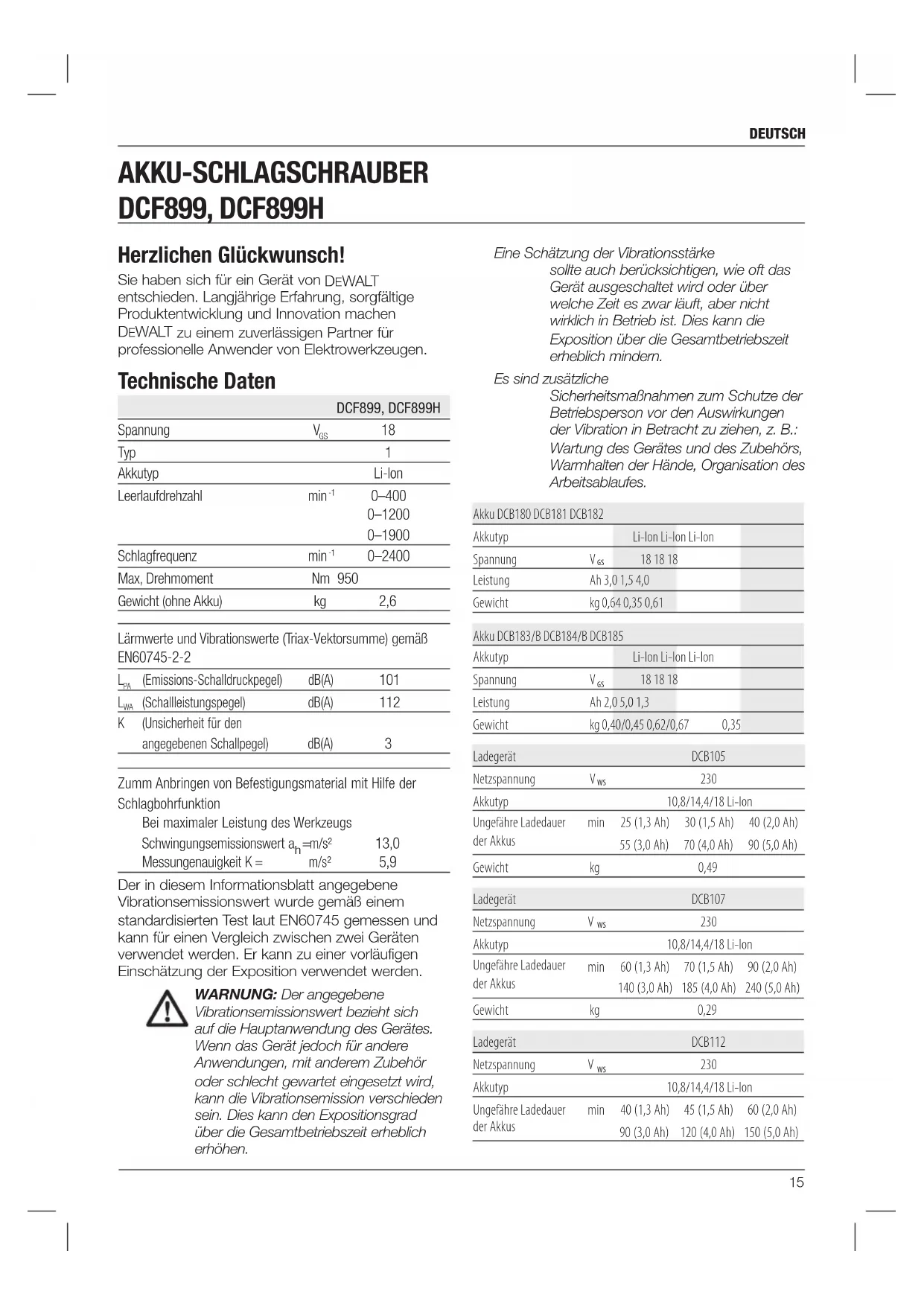 entschieden. Langjährige Erfahrung, sorgfältige Produktentwicklung und Innovation machen DeWALT zu einem zuverlässigen Partner für professionelle Anwender von Elektrowerkzeugen. Technische Daten