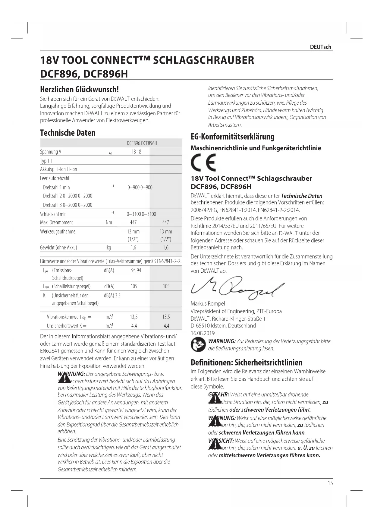 DeWALT erklärt hiermit, dass diese unter Technische Daten beschriebenen Produkte die folgenden Vorschriften erfüllen: 2006/42/EG, EN62841-1:2014, EN62841-2-2:2014. Diese Produkte erfüllen auch die Anforderungen von Richtlinie 2014/53/EU und 2011/65/EU. Für weitere Informationen wenden Sie sich bitte an DeWALT unter der folgenden Adresse oder schauen Sie auf der Rückseite dieser Betriebsanleitungnach. Der Unterzeichnete ist verantwortlich für die Zusammenstellung des technischen Dossiers und gibt diese Erklärung im Namen von DeWALT ab. Markus Rompel Vizepräsident of Engineering, PTE-Europa DeWALT , Richard-Klinger-Straße 11 D-65510 Idstein, Deutschland