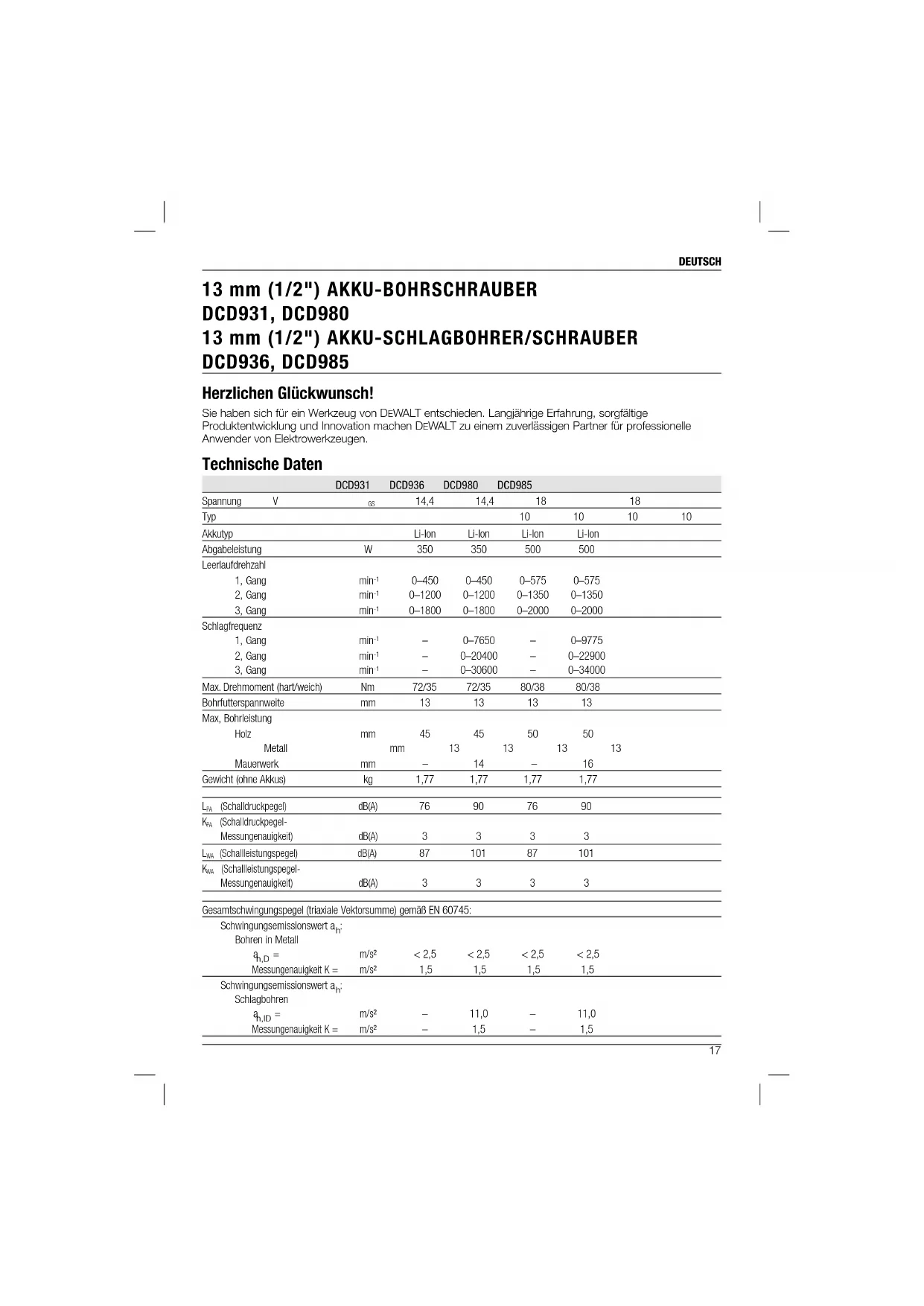 13 mm (1/2") AKKU-BOHRSCHRAUBER DCD931, DCD980 13 mm (1/2") AKKU-SCHLAGBOHRER/SCHRAUBER DCD936, DCD985 Herzlichen Glückwunsch! Sie haben sich für ein Werkzeug von DEWALT entschieden. Langjährige Erfahrung, sorgfältige Produktentwicklung und Innovation machen DEWALT zu einem zuverlässigen Partner für professionelle Anwender von Elektrowerkzeugen. Technische Daten