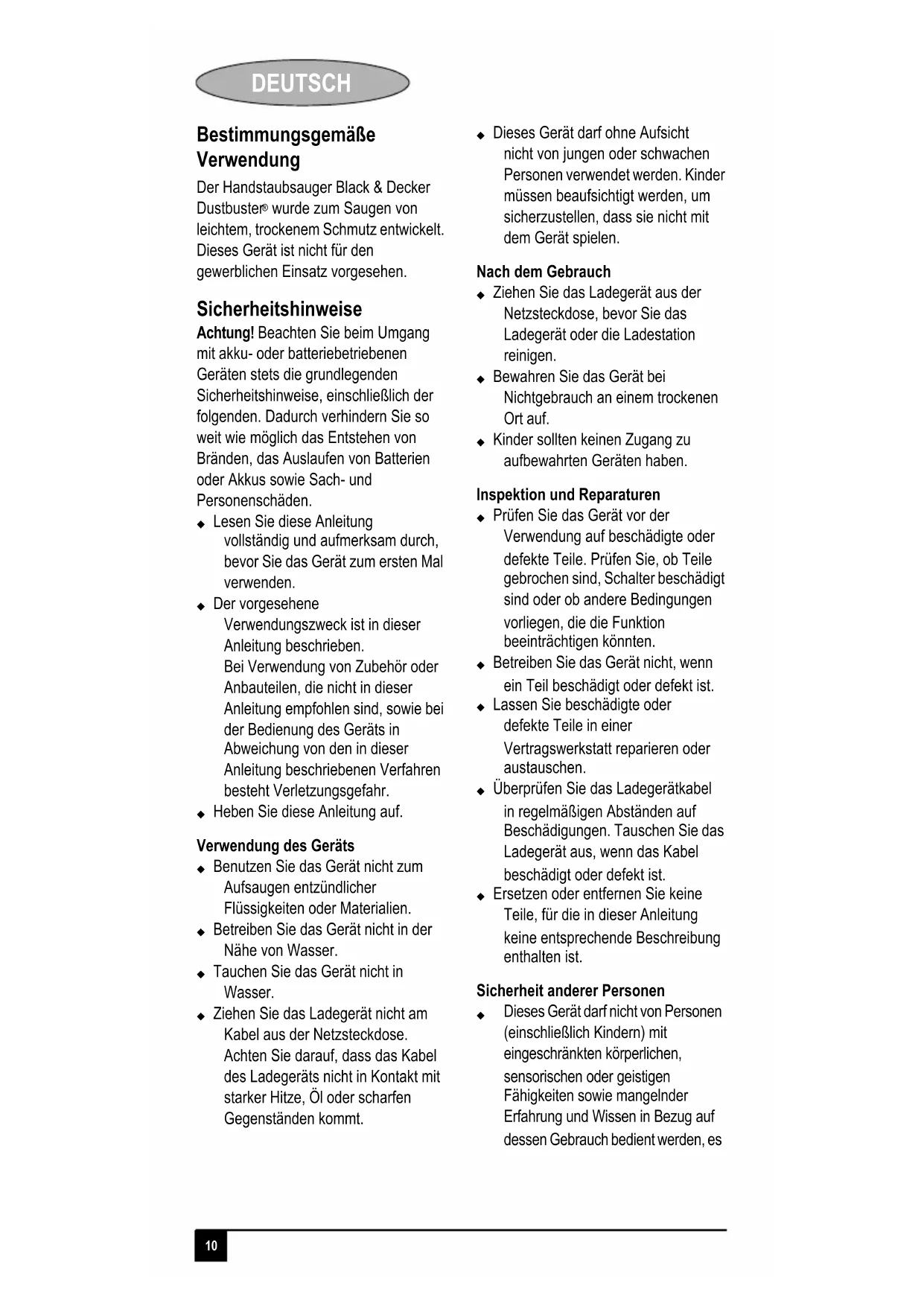 Kinder müssen beaufsichtigt werden, um sicherzustellen, dass sie nicht mit dem Gerät spielen. Zusätzliche Sicherheitshinweise für Akkus und Ladegeräte Akkus Auf keinen Fall öffnen. Achten Sie darauf, dass der Akku nicht mit Wasser in Berührung kommt. Setzen Sie den Akku keinen hohen Temperaturen aus. Nicht bei Temperaturen über 40°C lagern. Laden Sie den Akku ausschließlich bei Umgebungstemperaturen zwischen 10°C und 40°C. Verwenden Sie ausschließlich das mit dem Gerät gelieferte Ladegerät. Das Verwenden des falschen Ladegeräts kann zu einem Stromschlag oder dem Überhitzen des Akkus führen. Bei der Entsorgung von Akkus oder Batterien die Hinweise im Abschnitt „Umweltschutz“ beachten. Der Akku darf nicht durch mechanische Krafteinwirkung oder Belastungen beschädigt oder verformt werden. Andernfalls besteht Verletzungs- und Brandgefahr. Laden Sie beschädigte Akkus nicht auf. Unter extremen Bedingungen können Akkus undicht werden. Wenn Sie feststellen, dass aus dem Akku Flüssigkeit austritt, wischen Sie diese vorsichtig mit einem Tuch ab. Vermeiden Sie Hautkontakt. Beachten Sie nach Haut- oder Augenkontakt die folgenden Hinweise. Achtung! Batteriesäure kann Sach- oder Personenschäden verursachen. Spülen Sie die Säure nach Hautkontakt sofort mit Wasser ab. Suchen Sie einen Arzt auf, wenn sich auf der Haut Rötungen, Reizungen oder andere Irritationen zeigen. Spülen Sie das Auge nach Augenkontakt sofort mit sauberem Wasser aus, und suchen Sie einen Arzt auf. Ladegeräte Das Ladegerät ist für eine bestimmte Spannung ausgelegt. Stellen Sie sicher, dass die Netzspannung der auf dem Typenschild des Geräts angegebenen Spannung entspricht. Achtung! Ersetzen Sie das Ladegerät keinesfalls durch ein normales Netzkabel. Verwenden Sie das Black & Decker Ladegerät nur für den Akku des Geräts, mit dem es geliefert wurde. Andere Akkus könnten platzen und Sachschäden oder Verletzungen verursachen. Versuchen Sie keinesfalls, nicht aufladbare Batterien zu laden. Ist das Netzkabel beschädigt, muss es durch den Hersteller oder eine Black & Decker Vertragswerkstatt ausgetauscht werden, um eine mögliche Gefährdung zu vermeiden. Achten Sie darauf, dass das Ladegerät nicht mit Wasser in Berührung kommt. Versuchen Sie nicht, das Ladegerät zu öffnen. Nehmen Sie am Ladegerät keine Veränderungen vor. Während das Gerät/der Akku geladen wird, muss auf ausreichende Belüftung geachtet werden. Elektrische Sicherheit Das Ladegerät ist für eine bestimmte Spannung ausgelegt. Stellen Sie sicher, dass die Netzspannung der auf dem Typenschild des Geräts angegebenen Spannung entspricht. Ersetzen Sie das Ladegerät keinesfalls durch ein normales Netzkabel.12 DEUTSCH Symbole auf dem Ladegerät Merkmale