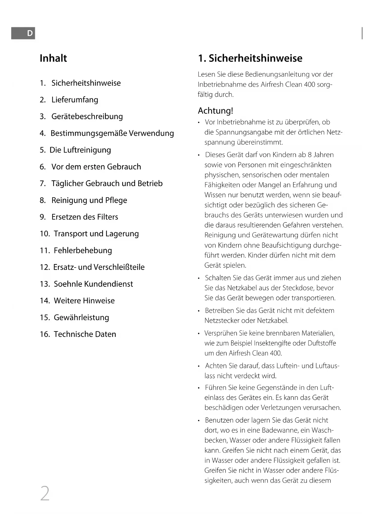 Lesen Sie diese Bedienungsanleitung vor der Inbetriebnahme des Airfresh Clean 400 sorg- fältig durch. Achtung!