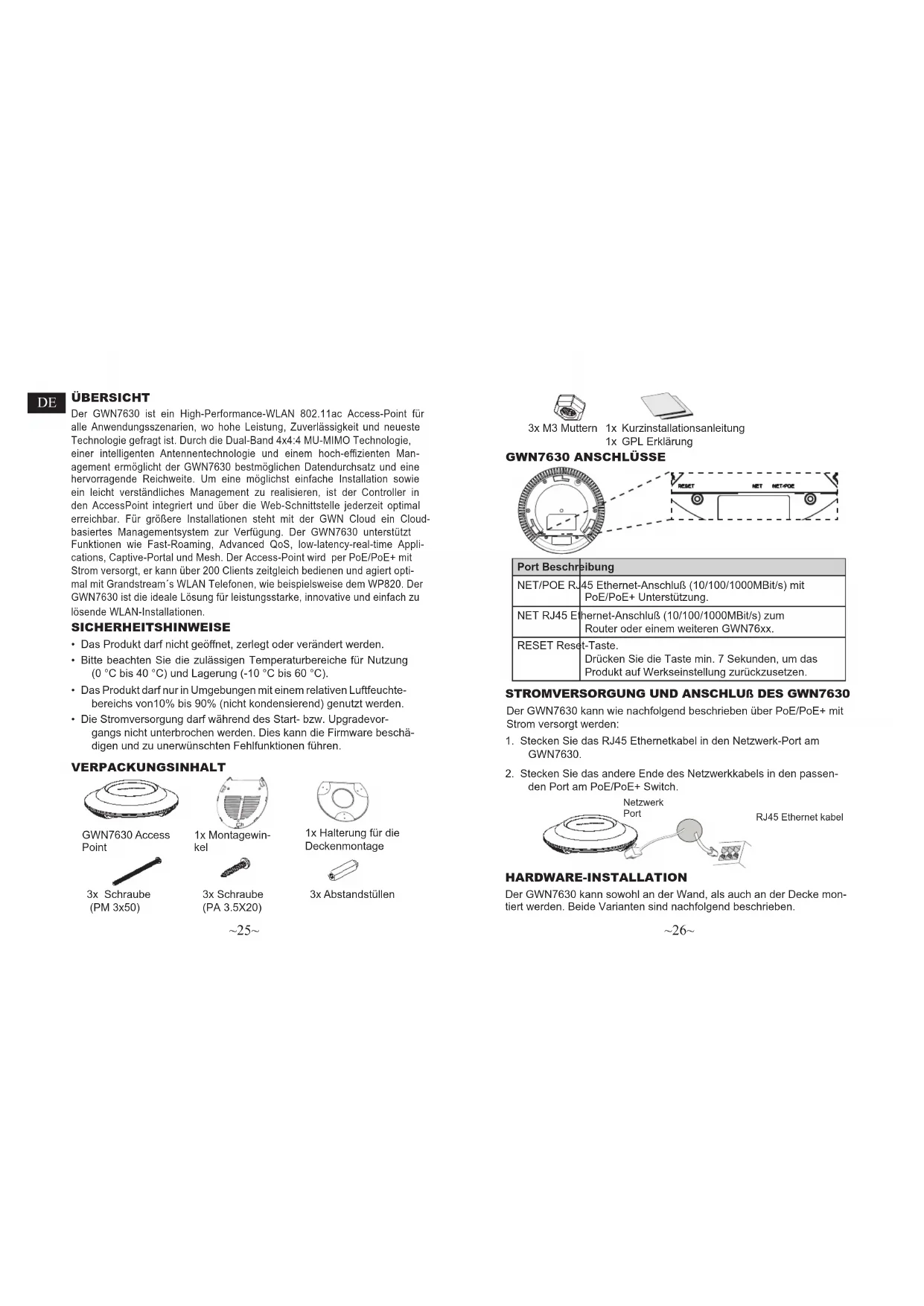 den Port am PoE/PoE+ Switch. Port Beschreibung NET/POE RJ45 Ethernet-Anschluß (10/100/1000MBit/s) mit PoE/PoE+ Unterstützung. NET RJ45 Ethernet-Anschluß (10/100/1000MBit/s) zum Router oder einem weiteren GWN76xx. RESET Reset-Taste. Drücken Sie die Taste min. 7 Sekunden, um das Produkt auf Werkseinstellung zurückzusetzen. 1x Kurzinstallationsanleitung 1x GPL Erklärung 3x M3 Muttern Netzwerk Port RJ45 Ethernet kabel ÜBERSICHT Der GWN7630 ist ein High-Performance-WLAN 802.11ac Access-Point für alle Anwendungsszenarien, wo hohe Leistung, Zuverlässigkeit und neueste Technologie gefragt ist. Durch die Dual-Band 4x4:4 MU-MIMO Technologie, einer intelligenten Antennentechnologie und einem hoch-ezienten Man- agement ermöglicht der GWN7630 bestmöglichen Datendurchsatz und eine hervorragende Reichweite. Um eine möglichst einfache Installation sowie ein leicht verständliches Management zu realisieren, ist der Controller in den AccessPoint integriert und über die Web-Schnittstelle jederzeit optimal erreichbar. Für größere Installationen steht mit der GWN Cloud ein Cloud- basiertes Managementsystem zur Verfügung. Der GWN7630 unterstützt Funktionen wie Fast-Roaming, Advanced QoS, low-latency-real-time Appli- cations, Captive-Portal und Mesh. Der Access-Point wird per PoE/PoE+ mit Strom versorgt, er kann über 200 Clients zeitgleich bedienen und agiert opti- mal mit Grandstream´s WLAN Telefonen, wie beispielsweise dem WP820. Der GWN7630 ist die ideale Lösung für leistungsstarke, innovative und einfach zu lösende WLAN-Installationen. VERPACKUNGSINHALT SICHERHEITSHINWEISE