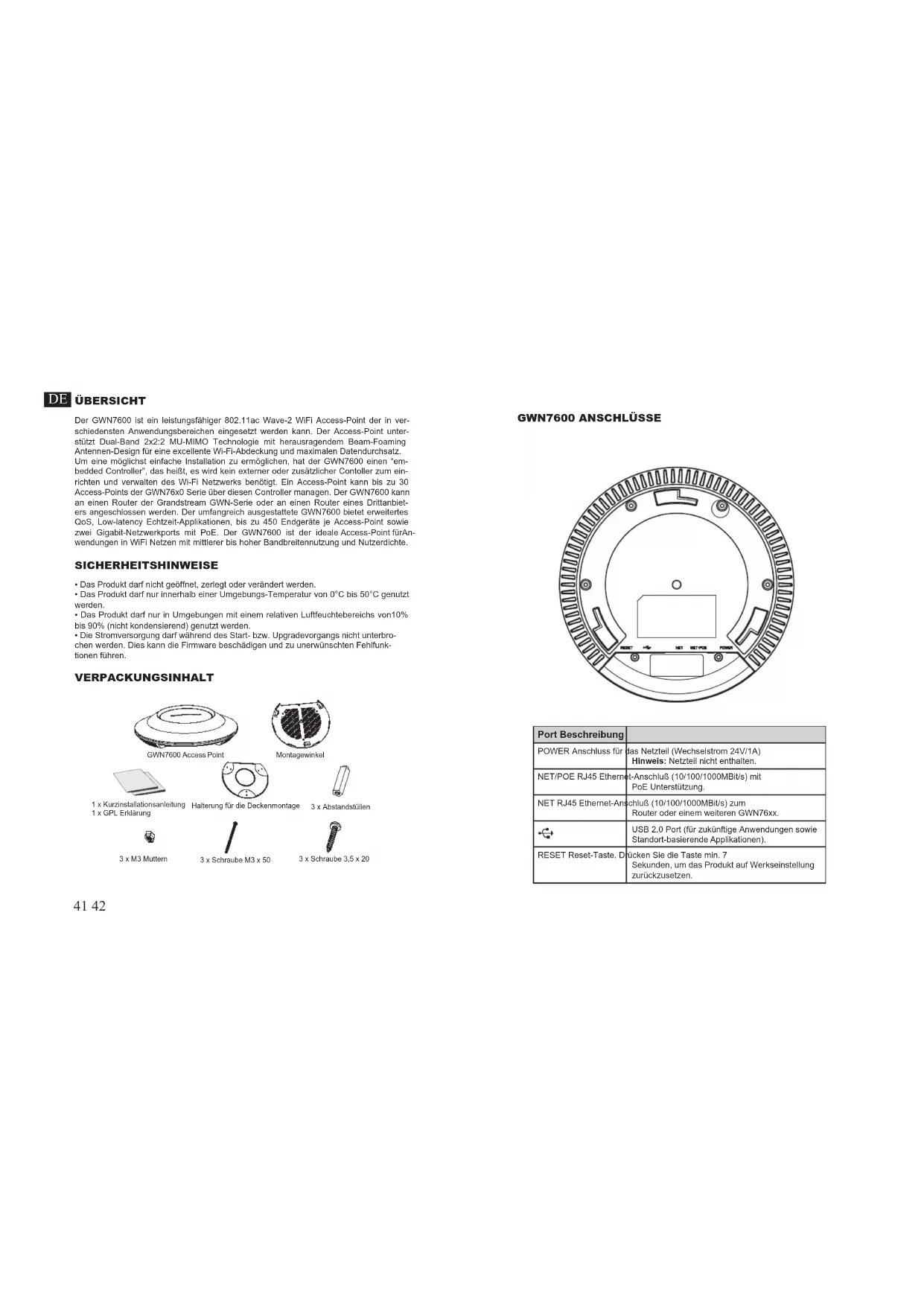 du GWN7600, ou saisir manuellement sur votre navigateur l’adresse IP afchée.ÜBERSICHT Der GWN7600 ist ein leistungsfähiger 802.11ac Wave-2 WiFi Access-Point der in ver- schiedensten Anwendungsbereichen eingesetzt werden kann. Der Access-Point unter- stützt Dual-Band 2x2:2 MU-MIMO Technologie mit herausragendem Beam-Foaming Antennen-Design für eine excellente Wi-Fi-Abdeckung und maximalen Datendurchsatz. Um eine möglichst einfache Installation zu ermöglichen, hat der GWN7600 einen “em- bedded Controller”, das heißt, es wird kein externer oder zusätzlicher Contoller zum ein- richten und verwalten des Wi-Fi Netzwerks benötigt. Ein Access-Point kann bis zu 30 Access-Points der GWN76x0 Serie über diesen Controller managen. Der GWN7600 kann an einen Router der Grandstream GWN-Serie oder an einen Router eines Drittanbiet- ers angeschlossen werden. Der umfangreich ausgestattete GWN7600 bietet erweitertes QoS, Low-latency Echtzeit-Applikationen, bis zu 450 Endgeräte je Access-Point sowie zwei Gigabit-Netzwerkports mit PoE. Der GWN7600 ist der ideale Access-Point fürAn- wendungen in WiFi Netzen mit mittlerer bis hoher Bandbreitennutzung und Nutzerdichte. SICHERHEITSHINWEISE