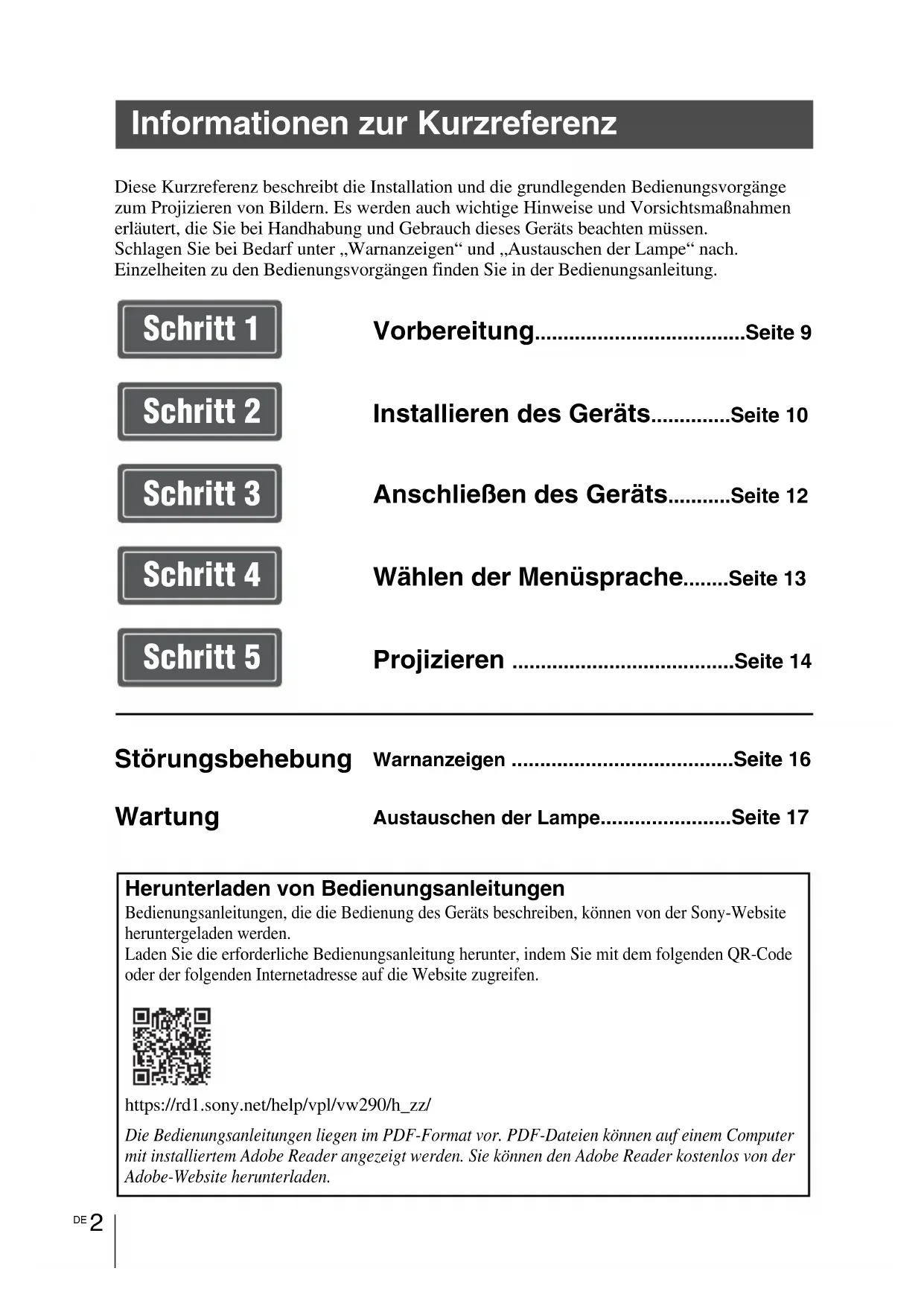 Diese Kurzreferenz beschreibt die Installation und die grundlegenden Bedienungsvorgänge zum Projizieren von Bildern. Es werden auch wichtige Hinweise und Vorsichtsmaßnahmen erläutert, die Sie bei Handhabung und Gebrauch dieses Geräts beachten müssen.Schlagen Sie bei Bedarf unter „Warnanzeigen“ und „Austauschen der Lampe“ nach.Einzelheiten zu den Bedienungsvorgängen finden Sie in der Bedienungsanleitung. Informationen zur Kurzreferenz Vorbereitung.....................................Seite 9 Installieren des Geräts..............Seite 10 Anschließen des Geräts...........Seite 12 Wählen der Menüsprache........Seite 13 Projizieren .......................................Seite 14 Störungsbehebung Warnanzeigen .......................................Seite 16 Wartung Austauschen der Lampe.......................Seite 17 Schritt 1 Schritt 2 Schritt 3 Schritt 4 Schritt 5 Herunterladen von Bedienungsanleitungen Bedienungsanleitungen, die die Bedienung des Geräts beschreiben, können von der Sony-Website heruntergeladen werden.Laden Sie die erforderliche Bedienungsanleitung herunter, indem Sie mit dem folgenden QR-Code oder der folgenden Internetadresse auf die Website zugreifen.https://rd1.sony.net/help/vpl/vw290/h_zz/Die Bedienungsanleitungen liegen im PDF-Format vor. PDF-Dateien können auf einem Computer mit installiertem Adobe Reader angezeigt werden. Sie können den Adobe Reader kostenlos von der Adobe-Website herunterladen.3