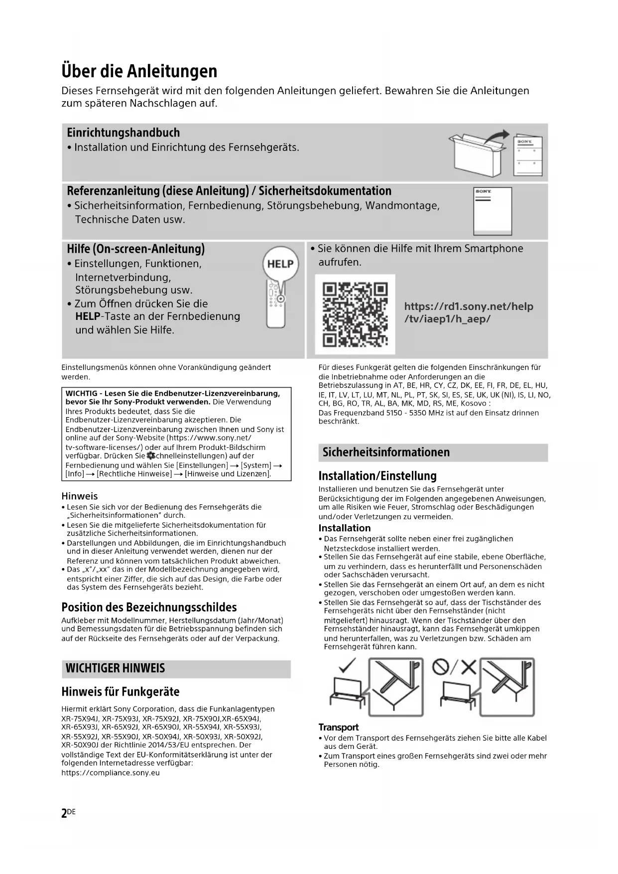 Hiermit erklart Sony Corporation, dass die Funkanlagepten XR-75X94J,XR-75X93J,XR-75X92J,XR-75X90JXR-65X94J, XR-65X93J,XR-65X92J,XR-65X90J,XR-55X94J,XR-55X93J, XR-55X92J,XR-55X90J,XR-50X94J,XR-50X93J,XR-50X92J, XR-50X90J der Richtlinie 2014/53/EU entsprechen. Der vollständige Text der EU-Konformitatserklarung ist unter der folgenden Internetadresse verfügbar: https://compliance.sony.eu