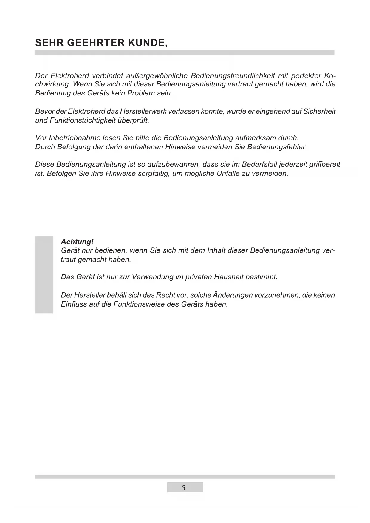 SEHR GEEHRTER KUNDE, Der Elektroherd verbindet außergewöhnliche Bedienungsfreundlichkeit mit perfekter Ko- chwirkung. Wenn Sie sich mit dieser Bedienungsanleitung vertraut gemacht haben, wird die Bedienung des Geräts kein Problem sein. Bevor der Elektroherd das Herstellerwerk verlassen konnte, wurde er eingehend auf Sicherheit und Funktionstüchtigkeit überprüft. Vor Inbetriebnahme lesen Sie bitte die Bedienungsanleitung aufmerksam durch. Durch Befolgung der darin enthaltenen Hinweise vermeiden Sie Bedienungsfehler. Diese Bedienungsanleitung ist so aufzubewahren, dass sie im Bedarfsfall jederzeit gribereit ist. Befolgen Sie ihre Hinweise sorgfältig, um mögliche Unfälle zu vermeiden. Achtung! Gerät nur bedienen, wenn Sie sich mit dem Inhalt dieser Bedienungsanleitung ver- traut gemacht haben. Das Gerät ist nur zur Verwendung im privaten Haushalt bestimmt. Der Hersteller behält sich das Recht vor, solche Änderungen vorzunehmen, die keinen Einuss auf die Funktionsweise des Geräts haben.4 SICHERHEITSHINWEISE Achtung. Das Gerät und seine zugänglichen Teile werden während der Benutzung heiß. Seien Sie beim Berühren sehr vorsichtig. Kinder unter 8 Jahren sollten sich nicht in der Nähe des Geräts aufhalten. Das Gerät darf von Kindern nur unter Aufsicht benutzt werden. Das Gerät darf von Kindern (ab einem Alter von 8 Jahren) sowie von Personen, die nicht im vollen Besitz ihrer körperli- chen, sensorischen oder geistigen Fähigkeiten sind nur unter Aufsicht und gebrauchsanweisungsgemäß benutzt werden. Kinder dürfen nicht mit dem Gerät spielen. Kinder dürfen Reinigungsarbeiten nur unter Aufsicht durchführen. Kinder dürfen das Gerät nur unter Aufsicht bedienen. Achtung! Erhitzen Sie Fett oder Öl niemals unbeaufsichtigt (Brandgefahr!). Versuchen Sie Flammen niemals mit Wasser zulöschen. Schalten Sie das Gerät aus und ersticken Sie die Flammen z.B. mit einem Topfdeckel oder einer nichtentammbaren Decke. Achtung! Verwenden Sie die Kochäche nicht als Ablage- äche (Brandgefahr!). Achtung! Sollten Sie auf der Kochäche Beschädigungen bemerken (Sprünge oder Brüche), schalten Sie das Gerät ab und trennen Sie es von der Stromversorgung (Strom- schlaggefahr!).5 SICHERHEITSHINWEISE Starke Erhitzung des Geräts während des Betriebs. Seien Sie vorsichtig und vermeiden Sie das Berühren der heißen Innenteile des Geräts. Zugängliche Teile können bei Be nut zung heiß werden. Kin- der fern halten. Achtung. Verwenden Sie zur Reinigung der Kochäche keine aggressiven Putzmittel oder scharfen Metallgegen- stände, die die Oberäche beschädigen könnten (Entstehung von Sprüngen oder Brüchen). Achtung.Um Stromschläge zu vermeiden, muss man sich vor dem Wechsel die Glühlampe vergewissern, dass das Gerät abgeschaltet ist. Zur Reinigung des Geräts keine Dampfreiniger verwenden. Während der Pyrolyse kann der Kochherd sehr hohe Tem- peraturen erreichen. Aus diesem Grunde können die Außen- ächen des Kochherdes heißer als gewöhnlich werden und daher ist es dafür zu sorgen, dass die Kinder sich dann in der Nähe des Kochherdes nicht aufhalten. Verbrühungsgefahr! Heißer Dampf kann beim Önen der Gerätetür entweichen. Während oder nach dem Garbetrieb die Gerätetür vorsichtig önen. Beim Önen nicht über die Gerätetür beugen. Beachten Sie, dass Dampf je nach Tem- peratur nicht sichtbar ist.6 SICHERHEITSHINWEISE Lassen Sie Kinder nicht unbeaufsichtigt an den Herd! Gefahr von Verbrennungen bei direktem Kontakt mit dem eingeschalteten Herd! Andere Haushaltsgeräte samt ihren Anschlusskabeln dürfen den Backofen nicht berühren oder auf den Kochächen auiegen, da deren Isolierung nicht hitzebe- ständig ist. Beim Braten den Herd nicht ohne Aufsicht lassen! Öl und Fett können sich durch Überhitzen oder Überlaufen selbst entzünden. Kochplatte von Verschmutzungen und übergelaufenem Kochgut freihalten. Dies betrit insbesondere Zucker, der mit dem Glaskeramik-Kochfeld reagiert und da- durch eine bleibende Beschädigung verursachen kann. Etwaige Verschmutzungen sind laufend zu beseitigen. Zur Vermeidung von irreversiblen Veränderungen des Kochfelds darf Geschirr mit feuchtem Boden nicht auf warme Kochächen gestellt werden. Nur Kochgeschirr verwenden, das nach Herstelleragaben für die Verwendung auf Glaskeramik-Kochfeldern geeignet ist. Bei Feststellung einer Beschädigung des Kochfelds – Kratzern, Rissen oder Ab- splitterungen – ist der Betrieb des Herdes sofort abzubrechen und die Reparatur bei der Kundendienststelle zu melden. Das Kochfeld nicht einschalten, ohne vorher ein Kochgeschirr darauf zu stellen. Scharfkantiges Geschirr, das eine Beschädigung des Kochfelds verursachen kann, darf nicht benutzt werden. Nicht auf die sich vorheizenden (nicht mit Geschirr überdeckten) Halogen-Koch- ächen schauen. Kochgeschirr mit einem Gewicht über 15 kg darf nicht auf die geönete Backofen- tür und Kochgeschirr mit einem Gewicht über 25 kg auf die Kochächen gestellt werden. Keine Scheuermittel oder scharfen Metallgegenstände zur Glasreinigung verwen- den; sie können die Oberäche zerkratzen, was dazu führen kann, dass das Glas springt. In nicht betriebsfähigem Zustand darf der Herd nicht benutzt werden. Sämtliche Mängel dürfen nur von einer autorisierten Fachkraft beseitigt werden. Bei Betriebsstörungen, die durch technische Mängel verursacht sind, muss unbe- dingt die Stromzufuhr unterbrochen und eine Reparatur veranlasst werden. Es ist dafür zu sorgen, dass Kinder nicht mit dem Gerät spielen. Das Gerät ist ausschließlich zum Kochen im haushaltsüblichen Rahmen ausgelegt. Ein anderweitiger Gebrauch jeder Art (z.B. zur Raumbeheizung) ist nicht bestim- mungsgemäß und kann gefährlich sein.7 UNSERE ENERGIESPARTIPPS Wer Energie verantwort- lich verbraucht, der schont nicht nur die Haushaltskas- se, sondern handelt auch umweltbewusst. Seien Sie dabei! Sparen Sie Elektro- energie! Folgendes können Sie tun: Das richtige Kochgeschirr benutzen. Töpfe mi