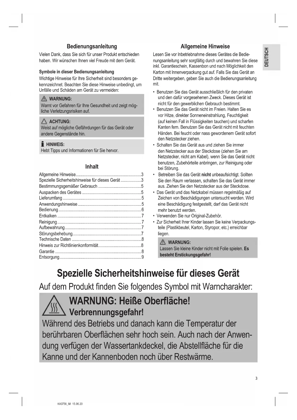 - Zur Sicherheit Ihrer Kinder lassen Sie keine Verpackungs- teile (Plastikbeutel, Karton, Styropor, etc.) erreichbar liegen. WARNUNG: Lassen Sie kleine Kinder nicht mit Folie spielen. Es besteht Erstickungsgefahr! Spezielle Sicherheitshinweise für dieses Gerät Auf dem Produkt nden Sie folgendes Symbol mit Warncharakter: WARNUNG: Heiße Oberäche! Verbrennungsgefahr! Während des Betriebs und danach kann die Temperatur der berührbaren Oberächen sehr hoch sein. Auch nach der Anwen- dung verfügen der Wassertankdeckel, die Abstelläche für die Kanne und der Kannenboden noch über Restwärme.4 KA3756_IM 15.06.20 WARNUNG: Heiße Oberäche! Verbrennungsgefahr!