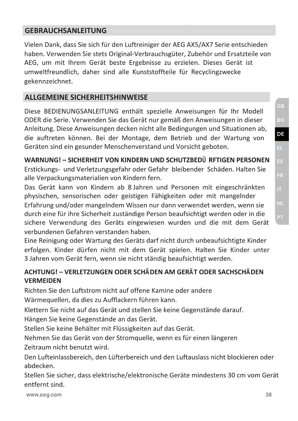 Vielen Dank, dass Sie sich für den Luftreiniger der AEG AX5/AX7 Serie entschieden haben. Verwenden Sie stets Original-Verbrauchsgüter, Zubehör und Ersatzteile von AEG, um mit Ihrem Gerät beste Ergebnisse zu erzielen. Dieses Gerät ist umweltfreundlich, daher sind alle Kunststoffteile für Recyclingzwecke gekennzeichnet. ALLGEMEINE SICHERHEITSHINWEISE
