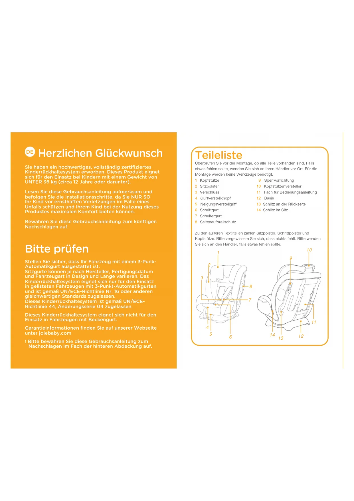 Herzlichen Glückwunsch Sie haben ein hochwertiges﹐ vollständig zertifiziertes Kinderrückhaltesystem erworben. Dieses Produkt eignet sich für den Einsatz bei Kindern mit einem Gewicht von UNTER 36 kg (circa 12 Jahre oder darunter). Lesen Sie diese Gebrauchsanleitung aufmerksam und befolgen Sie die Installationsschritte﹐ da Sie NUR SO Ihr Kind vor ernsthaften Verletzungen im Falle eines Unfalls schützen und Ihrem Kind bei der Nutzung dieses Produktes maximalen Komfort bieten können. Bewahren Sie diese Gebrauchsanleitung zum künftigen Nachschlagen auf. Bitte prüfen Stellen Sie sicher﹐ dass Ihr Fahrzeug mit einem 3-Punk- Automatikgurt ausgestattet ist. Sitzgurte können je nach Hersteller﹐ Fertigungsdatum und Fahrzeugart in Design und Länge variieren. Das Kinderrückhaltesystem eignet sich nur für den Einsatz in gelisteten Fahrzeugen mit 3-Punkt-Automatikgurten und ist gemäß UN/ECE-Richtlinie Nr. 16 oder anderen gleichwertigen Standards zugelassen. Dieses Kinderrückhaltesystem ist gemäß UN/ECE- Richtlinie 44﹐ Änderungsserie 04 zugelassen. Dieses Kinderrückhaltesystem eignet sich nicht für den Einsatz in Fahrzeugen mit Beckengurt. Garantieinformationen finden Sie auf unserer Webseite unter joiebaby.com ! Bitte bewahren Sie diese Gebrauchsanleitung zum Nachschlagen im Fach der hinteren Abdeckung auf.