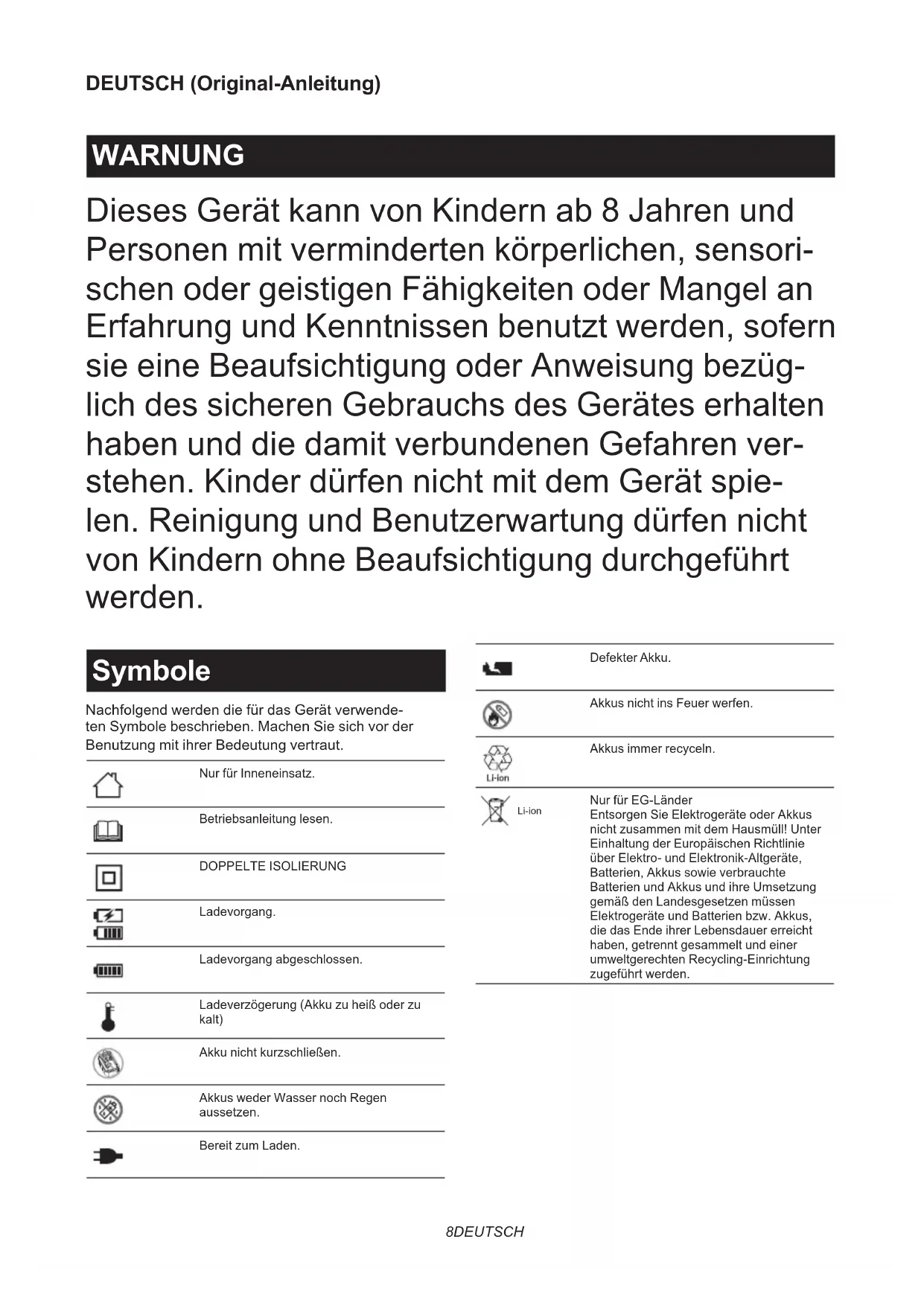 - Batterie exposée à de l’air froid pendant une période prolongée. La charge commencera après que la température de la batterie a atteint le degré auquel la charge est possible. NOTE : Si le témoin de charge clignote en alternance en vert et en rouge, la charge n’est pas possible. Les bornes sur le chargeur ou la batterie sont bouchées par de la poussière ou la batterie est usée ou endommagée.8 DEUTSCH DEUTSCH (Original-Anleitung) WARNUNG Dieses Gerät kann von Kindern ab 8 Jahren und Personen mit verminderten körperlichen, sensori- schen oder geistigen Fähigkeiten oder Mangel an Erfahrung und Kenntnissen benutzt werden, sofern sie eine Beaufsichtigung oder Anweisung bezüg- lich des sicheren Gebrauchs des Gerätes erhalten haben und die damit verbundenen Gefahren ver- stehen. Kinder dürfen nicht mit dem Gerät spie- len. Reinigung und Benutzerwartung dürfen nicht von Kindern ohne Beaufsichtigung durchgeführt werden. Symbole Nachfolgend werden die für das Gerät verwende- ten Symbole beschrieben. Machen Sie sich vor der Benutzung mit ihrer Bedeutung vertraut. Nur für Inneneinsatz. Betriebsanleitung lesen. DOPPELTE ISOLIERUNG Ladevorgang. Ladevorgang abgeschlossen. Ladeverzögerung (Akku zu heiß oder zu kalt) Akku nicht kurzschließen. Akkus weder Wasser noch Regen aussetzen. Bereit zum Laden. Defekter Akku. Akkus nicht ins Feuer werfen. Akkus immer recyceln. Li-ion Nur für EG-Länder Entsorgen Sie Elektrogeräte oder Akkus nicht zusammen mit dem Hausmüll! Unter Einhaltung der Europäischen Richtlinie über Elektro- und Elektronik-Altgeräte, Batterien, Akkus sowie verbrauchte Batterien und Akkus und ihre Umsetzung gemäß den Landesgesetzen müssen Elektrogeräte und Batterien bzw. Akkus, die das Ende ihrer Lebensdauer erreicht haben, getrennt gesammelt und einer umweltgerechten Recycling-Einrichtung zugeführt werden.9 DEUTSCH VORSICHT