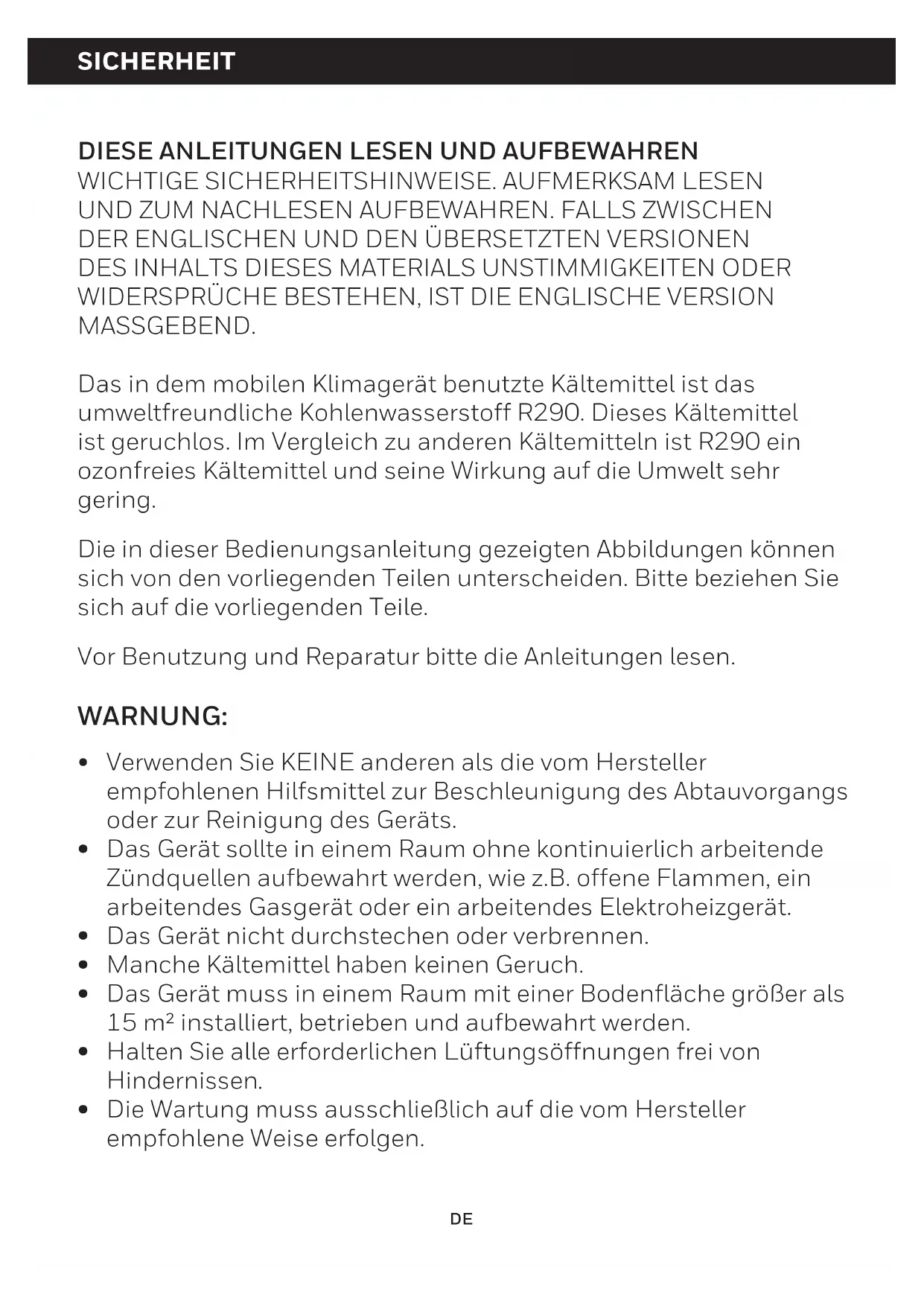 "E1" Fallo del sensor de la temperatura interior (circuito abierto o cortocircuito). "E2" Fallo del sensor de temperatura de la tubería (circuito abierto o cortocircuito). ESDas in dem mobilen Klimagerät benutzte Kältemittel ist das umweltfreundliche Kohlenwasserstoff R290. Dieses Kältemittel ist geruchlos. Im Vergleich zu anderen Kältemitteln ist R290 ein ozonfreies Kältemittel und seine Wirkung auf die Umwelt sehr gering. Die in dieser Bedienungsanleitung gezeigten Abbildungen können sich von den vorliegenden Teilen unterscheiden. Bitte beziehen Sie sich auf die vorliegenden Teile. Vor Benutzung und Reparatur bitte die Anleitungen lesen. SICHERHEIT