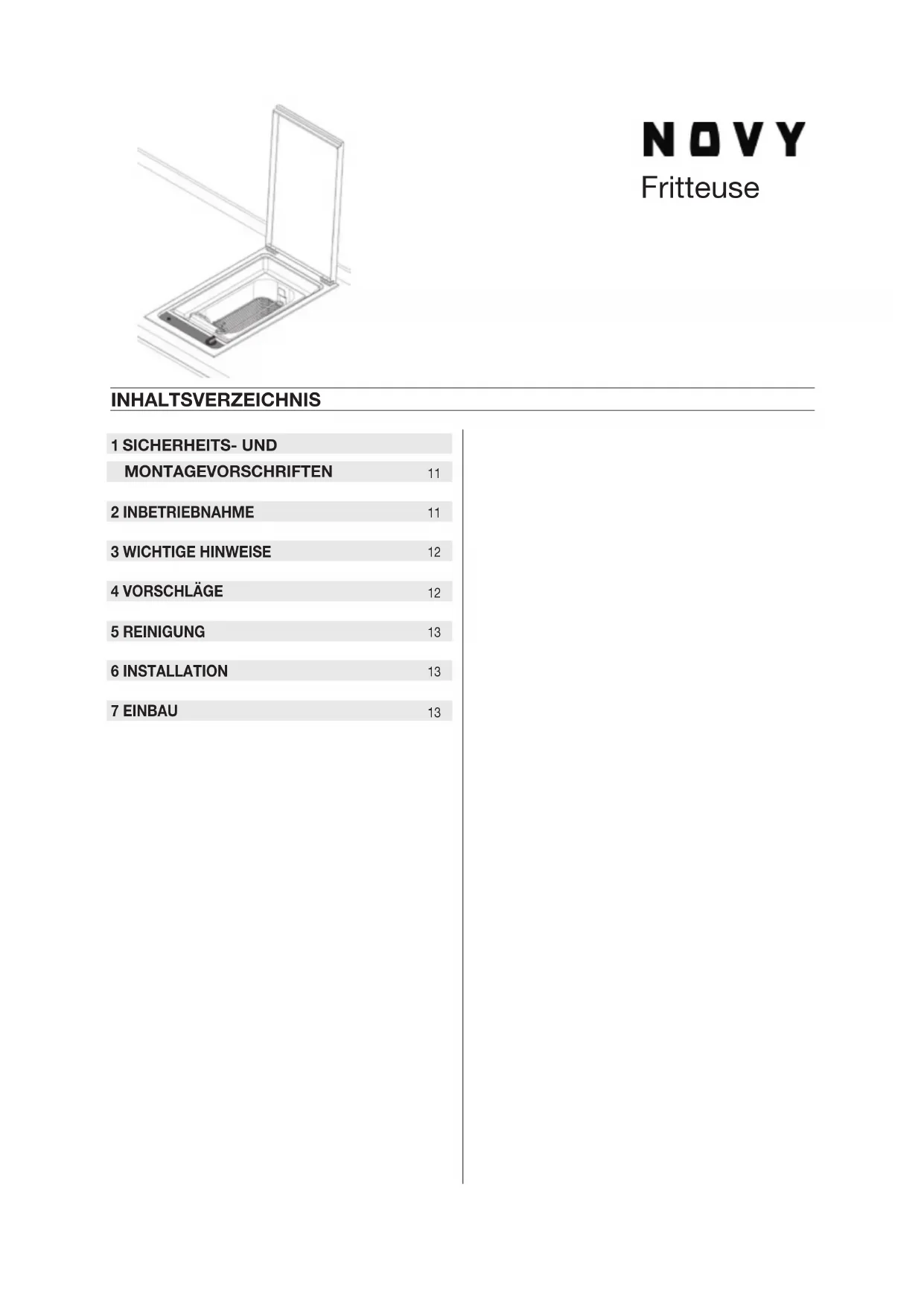 Fritteuse11 1 SICHERHEITS- UND MONTAGEVORSCHRIFTEN Weitere Informationen zu den Produkten, dem Zubehör und den Dienstleistungen von Novy finden Sie im Internet unter: www.novy-dunsthauben.de Diese Broschüre enthält die Montageanleitung für das Gerät, wie auf der Vorderseite angegeben. Die Gebrauchsanwei- sung wurde dem Gerät in einer gesonderten Broschüre beigefügt. In dieser Montageanleitung werden einige Symbole ver- wendet. Nachfolgend finden Sie eine Erklärung dieser Symbole. Symbol Bedeutung Aktion