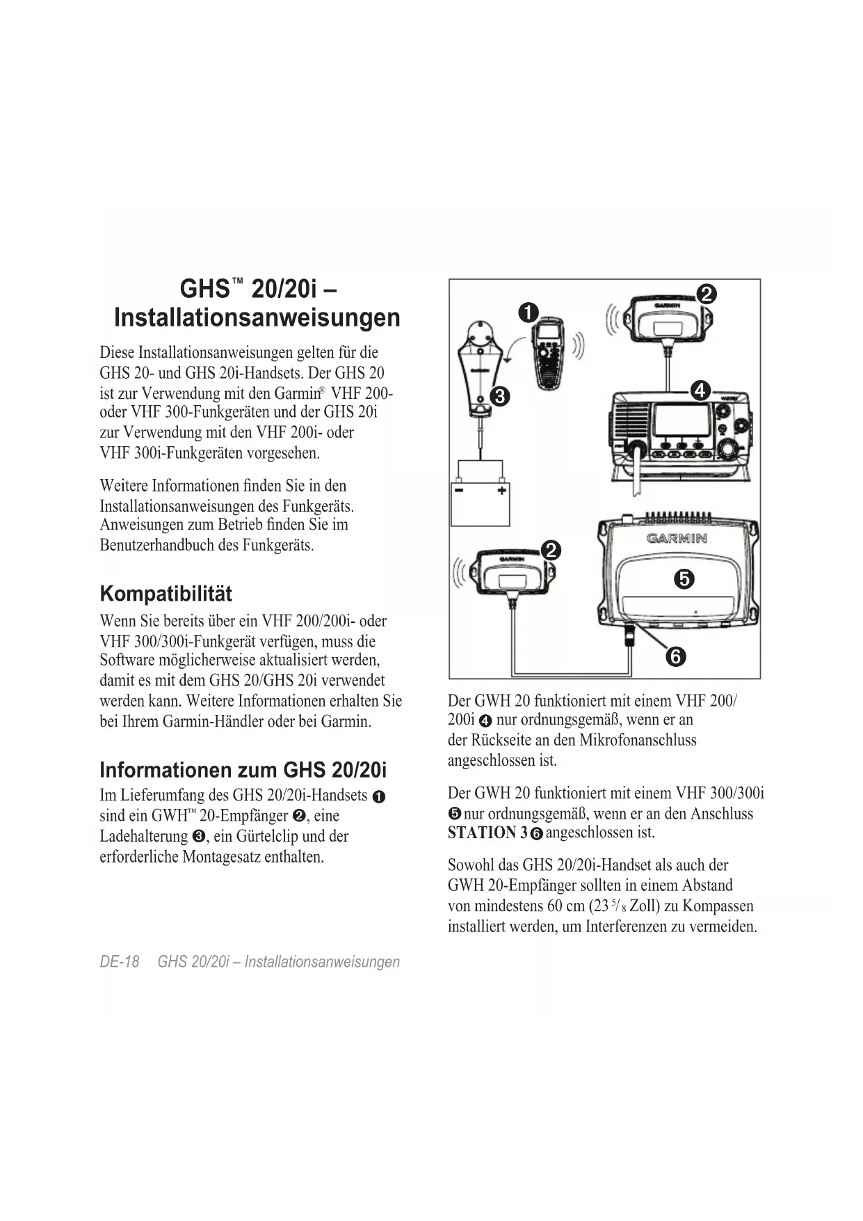 VHF 200- oder VHF 300-Funkgeräten und der GHS 20i zur Verwendung mit den VHF 200i- oder VHF 300i-Funkgeräten vorgesehen. Weitere Informationen nden Sie in den Installationsanweisungen des Funkgeräts. Anweisungen zum Betrieb nden Sie im Benutzerhandbuch des Funkgeräts. Kompatibilität Wenn Sie bereits über ein VHF 200/200i- oder VHF 300/300i-Funkgerät verfügen, muss die Software möglicherweise aktualisiert werden, damit es mit dem GHS 20/GHS 20i verwendet werden kann. Weitere Informationen erhalten Sie bei Ihrem Garmin-Händler oder bei Garmin. Informationen zum GHS 20/20i Im Lieferumfang des GHS 20/20i-Handsets