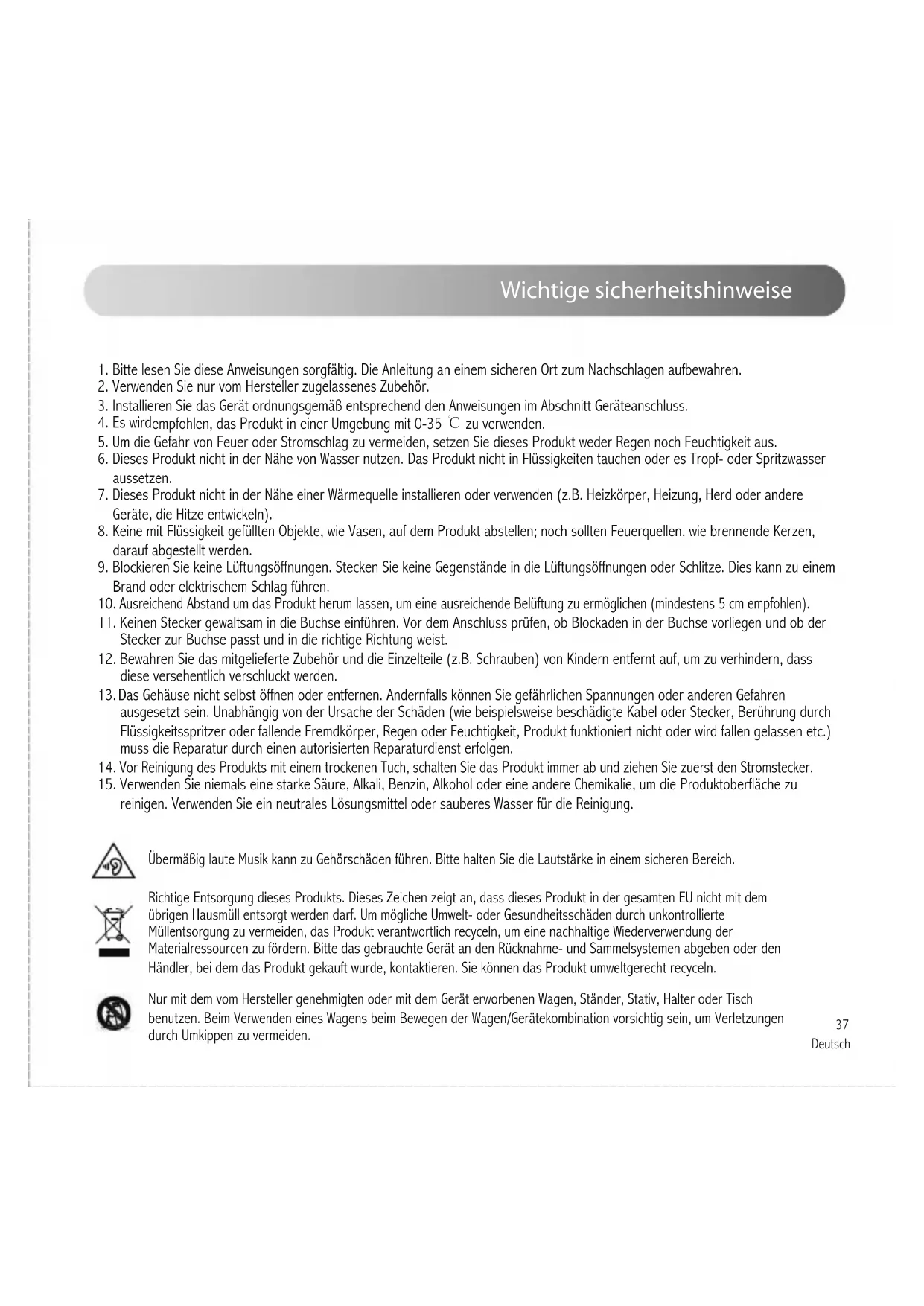 - Compruebe si el enchufe está conectado a la toma de corriente o si hay corriente. No hay sonido El S760D no se enciende Si quiere saber más sobre EDIFIER, visite www.edifier.com. Para consultas sobre la garantía Edifier, por favor, seleccione la página del país correspondiente en www.edifier.com y revise la sección Condiciones de la garantía. EE.UU. y Canadá: service@edifier.ca América del Sur: por favor, visite www.edifier.com (inglés) o www.edifierla.com (español/portugués) para obtener información de contacto local.37 Deutsch Wichtige sicherheitshinweise Übermäßig laute Musik kann zu Gehörschäden führen. Bitte halten Sie die Lautstärke in einem sicheren Bereich. Richtige Entsorgung dieses Produkts. Dieses Zeichen zeigt an, dass dieses Produkt in der gesamten EU nicht mit dem übrigen Hausmüll entsorgt werden darf. Um mögliche Umwelt- oder Gesundheitsschäden durch unkontrollierte Müllentsorgung zu vermeiden, das Produkt verantwortlich recyceln, um eine nachhaltige Wiederverwendung der Materialressourcen zu fördern. Bitte das gebrauchte Gerät an den Rücknahme- und Sammelsystemen abgeben oder den Händler, bei dem das Produkt gekauft wurde, kontaktieren. Sie können das Produkt umweltgerecht recyceln. Nur mit dem vom Hersteller genehmigten oder mit dem Gerät erworbenen Wagen, Ständer, Stativ, Halter oder Tisch benutzen. Beim Verwenden eines Wagens beim Bewegen der Wagen/Gerätekombination vorsichtig sein, um Verletzungen durch Umkippen zu vermeiden.