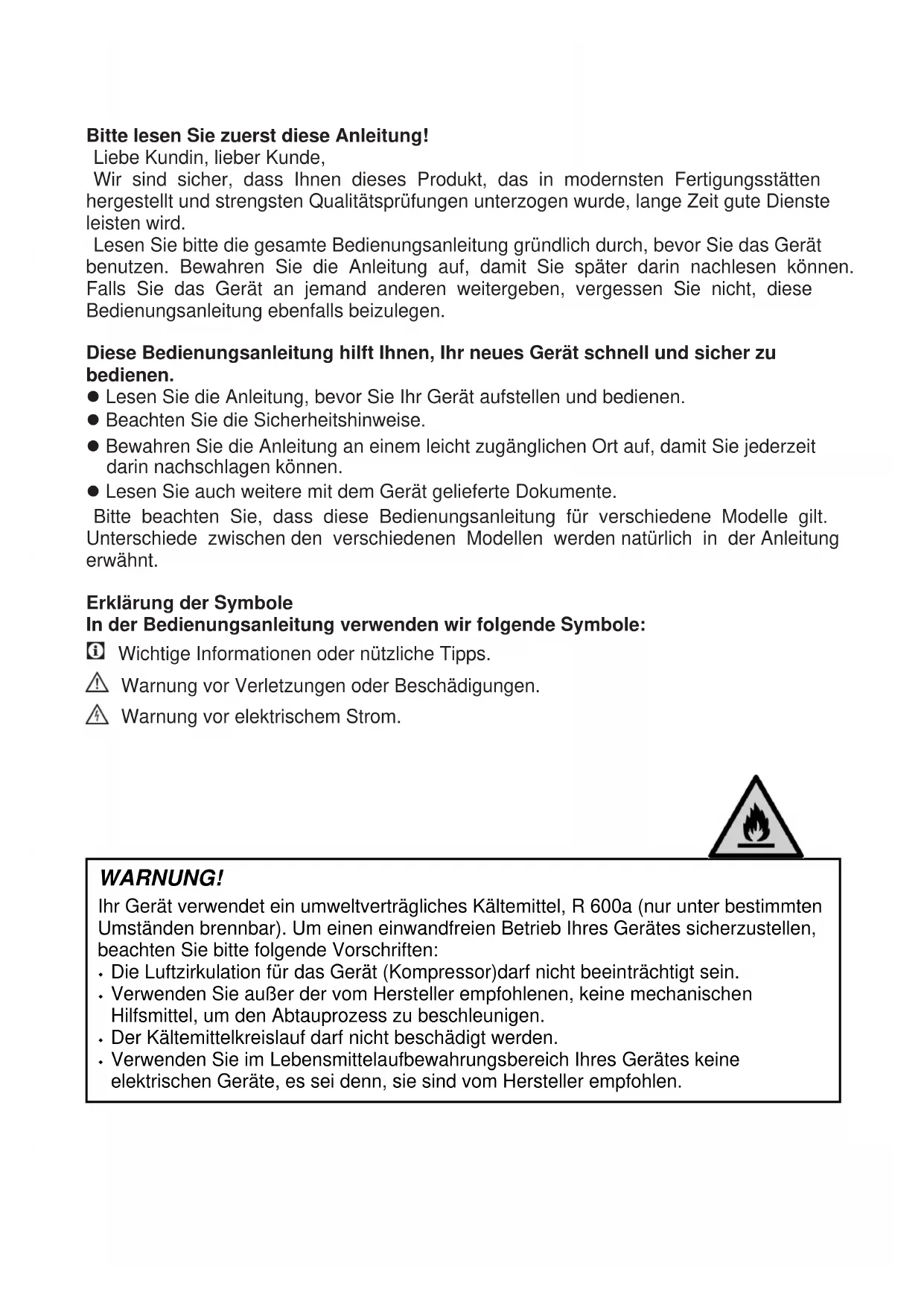 - The food is touching the ceiling of the drawer. >>>Rearrange food in the drawer.Bitte lesen Sie zuerst diese Anleitung! Liebe Kundin, lieber Kunde, Wir sind sicher, dass Ihnen dieses Produkt, das in modernsten Fertigungsstätten hergestellt und strengsten Qualitätsprüfungen unterzogen wurde, lange Zeit gute Dienste leisten wird. Lesen Sie bitte die gesamte Bedienungsanleitung gründlich durch, bevor Sie das Gerät benutzen. Bewahren Sie die Anleitung auf, damit Sie später darin nachlesen können. Falls Sie das Gerät an jemand anderen weitergeben, vergessen Sie nicht, diese Bedienungsanleitung ebenfalls beizulegen. Diese Bedienungsanleitung hilft Ihnen, Ihr neues Gerät schnell und sicher zu bedienen. Lesen Sie die Anleitung, bevor Sie Ihr Gerät aufstellen und bedienen. Beachten Sie die Sicherheitshinweise. Bewahren Sie die Anleitung an einem leicht zugänglichen Ort auf, damit Sie jederzeit darin nachschlagen können. Lesen Sie auch weitere mit dem Gerät gelieferte Dokumente. Bitte beachten Sie, dass diese Bedienungsanleitung für verschiedene Modelle gilt. Unterschiede zwischen den verschiedenen Modellen werden natürlich in der Anleitung erwähnt. Erklärung der Symbole In der Bedienungsanleitung verwenden wir folgende Symbole: Wichtige Informationen oder nützliche Tipps. Warnung vor Verletzungen oder Beschädigungen. Warnung vor elektrischem Strom. WARNUNG! Ihr Gerät verwendet ein umweltverträgliches Kältemittel, R 600a (nur unter bestimmten Umständen brennbar). Um einen einwandfreien Betrieb Ihres Gerätes sicherzustellen, beachten Sie bitte folgende Vorschriften: Die Luftzirkulation für das Gerät (Kompressor)darf nicht beeinträchtigt sein. Verwenden Sie außer der vom Hersteller empfohlenen, keine mechanischen Hilfsmittel, um den Abtauprozess zu beschleunigen. Der Kältemittelkreislauf darf nicht beschädigt werden. Verwenden Sie im Lebensmittelaufbewahrungsbereich Ihres Gerätes keine elektrischen Geräte, es sei denn, sie sind vom Hersteller empfohlen.1 Ihr Kühlschrank 3 2 Wichtige Hinweise zu Ihrer Sicherheit 4 Bestimmungsgemäßer Einsatz......... 4 Allgemeine Hinweise zu Ihrer Sicherheit ................................. 4 Bei Geräten mit einem Wasserspender ................................ 6 Sicherheit von Kindern ..................... 6 Konformität mit der WEEE-Richtlinie zur Entsorgung von Altgeräten ............... 6 Hinweise zur Verpackung ................. 7 Wichtige Hinweise zum Kältemittel... 7 Tipps zum Energiesparen................. 7 3 Installation 8 Wenn Sie den Kühlschrank versetzen möchten ............................................ 8 Vor dem Einschalten ........................ 8 Elektrischer Anschluss ..................... 8 Verpackungsmaterialien entsorgen .. 8 Altgeräte entsorgen .......................... 9 Aufstellung und Installation............... 9 Beleuchtung auswechseln ................ 9 Füße einstellen ................................. 9 INHALT 2 D 4 Vorbereitung 10 5 So nutzen Sie Ihren Kühlschrank 11 Thermostateinstelltaste .................. 11 Doppeltes Kühlsystem ……………..11 Türanschlag umkehren …………….12 Frische Lebensmittel tiefkühlen ...... 13 Empfehlungen zur Konservierung gefrorener Lebensmittel .................. 14 Abtauen .......................................... 14 Lebensmittel platzieren ................... 14 Informationen zum Tiefkühlen ........ 15 Empfehlungen zum Kühlbereich (für frische Lebensmittel) ...................... 15 6 Reinigung und Pflege 16 Kunststoffflächen schützen ............. 16 7 Problemlösung 17Ihr Kühlschrank