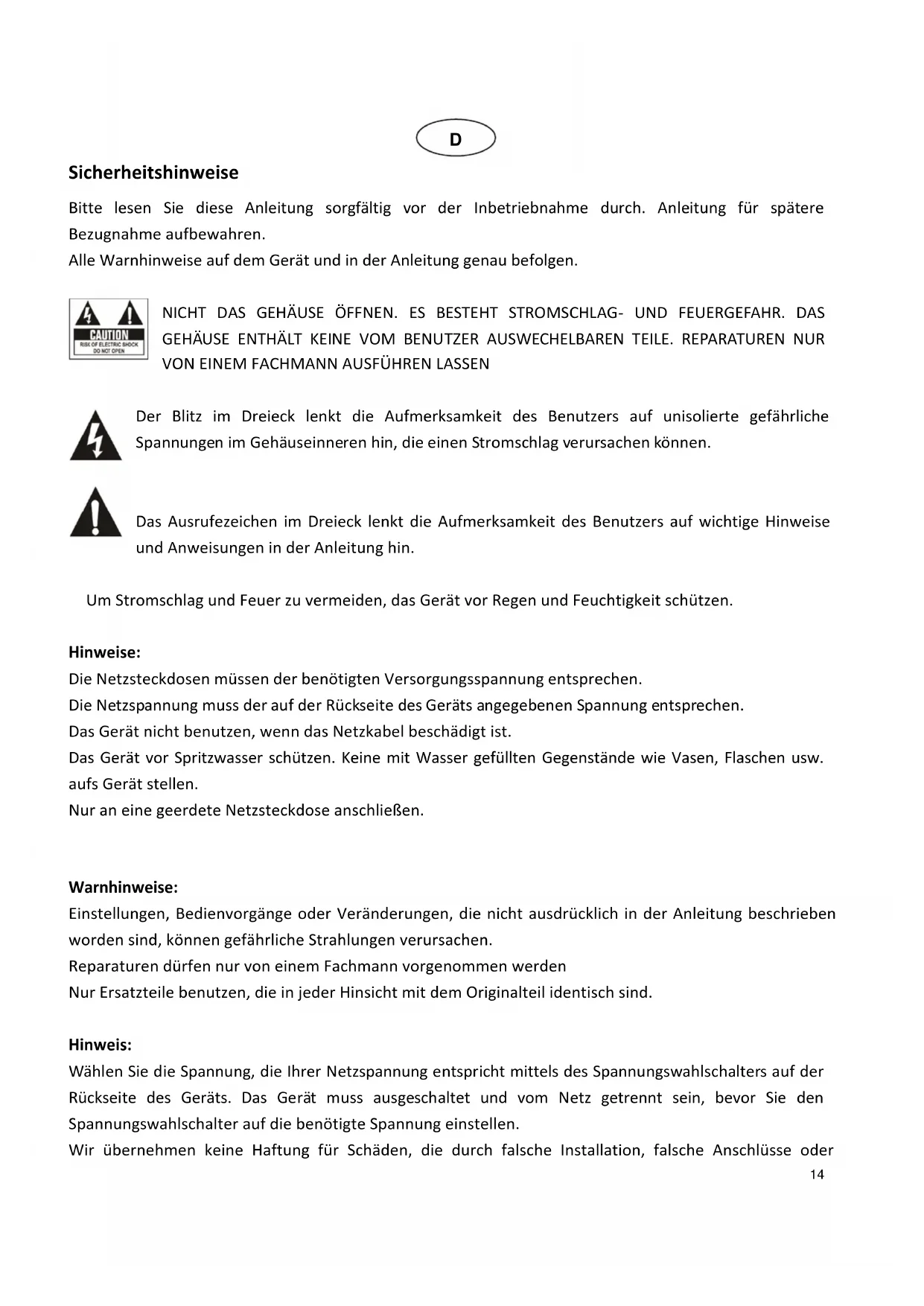 Warnhinweise: Einstellungen, Bedienvorgänge oder Veränderungen, die nicht ausdrücklich in der Anleitung beschrieben worden sind, können gefährliche Strahlungen verursachen. Reparaturen dürfen nur von einem Fachmann vorgenommen werden Nur Ersatzteile benutzen, die in jeder Hinsicht mit dem Originalteil identisch sind. Hinweis: Wählen Sie die Spannung, die Ihrer Netzspannung entspricht mittels des Spannungswahlschalters auf der Rückseite des Geräts. Das Gerät muss ausgeschaltet und vom Netz getrennt sein, bevor Sie den Spannungswahlschalter auf die benötigte Spannung einstellen. Wir übernehmen keine Haftung für Schäden, die durch falsche Installation, falsche Anschlüsse oder15 unsachgemäßen Gebrauch, durch die Nachlässigkeit oder Irrtum des Benutzers entstanden sind. Wichtige Hinweise: