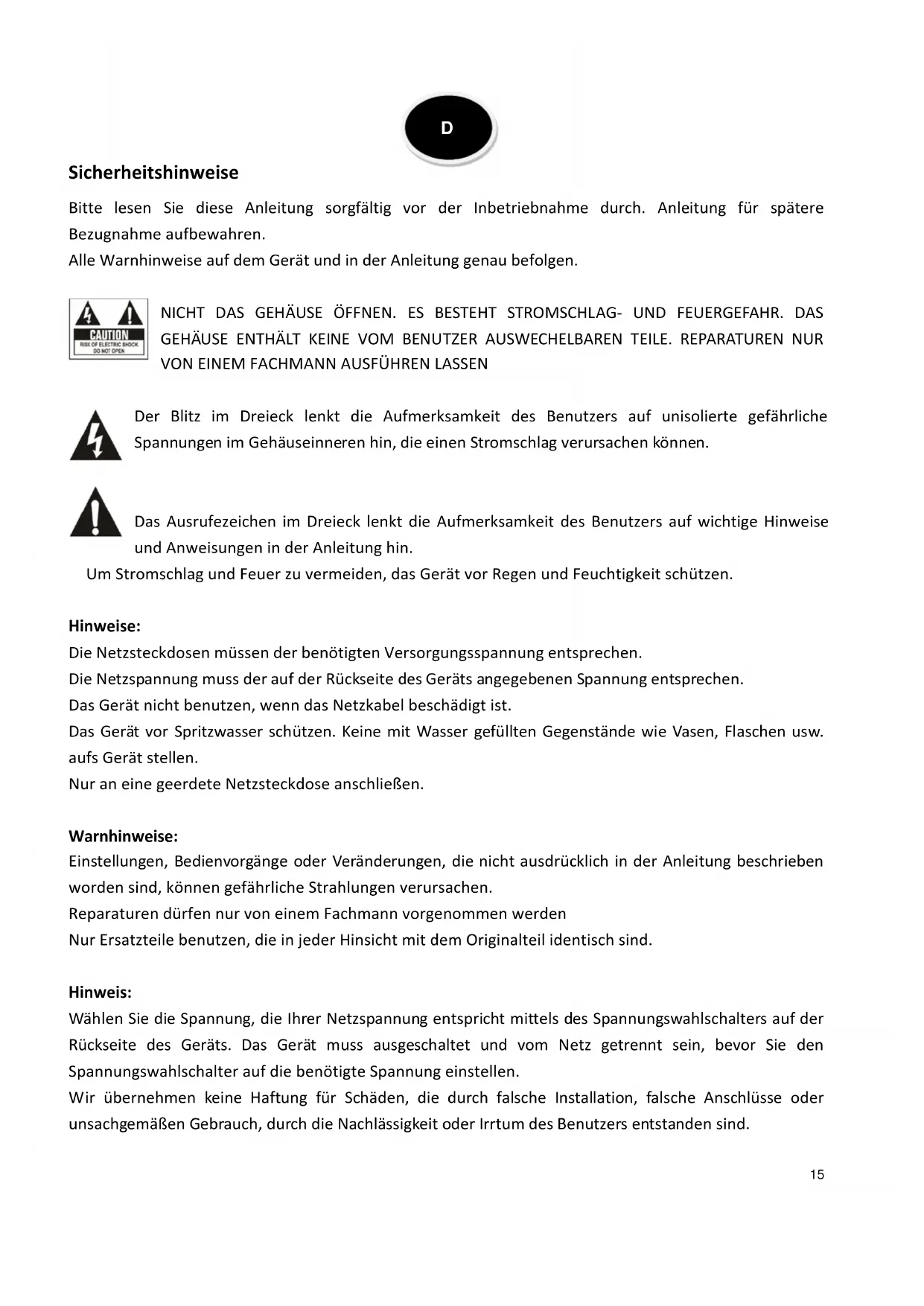 Das Ausrufezeichen im Dreieck lenkt die Aufmerksamkeit des Benutzers auf wichtige Hinweise und Anweisungen in der Anleitung hin. Um Stromschlag und Feuer zu vermeiden, das Gerät vor Regen und Feuchtigkeit schützen. Hinweise: Die Netzsteckdosen müssen der benötigten Versorgungsspannung entsprechen. Die Netzspannung muss der auf der Rückseite des Geräts angegebenen Spannung entsprechen. Das Gerät nicht benutzen, wenn das Netzkabel beschädigt ist. Das Gerät vor Spritzwasser schützen. Keine mit Wasser gefüllten Gegenstände wie Vasen, Flaschen usw. aufs Gerät stellen. Nur an eine geerdete Netzsteckdose anschließen. Warnhinweise: Einstellungen, Bedienvorgänge oder Veränderungen, die nicht ausdrücklich in der Anleitung beschrieben worden sind, können gefährliche Strahlungen verursachen. Reparaturen dürfen nur von einem Fachmann vorgenommen werden Nur Ersatzteile benutzen, die in jeder Hinsicht mit dem Originalteil identisch sind. Hinweis: Wählen Sie die Spannung, die Ihrer Netzspannung entspricht mittels des Spannungswahlschalters auf der Rückseite des Geräts. Das Gerät muss ausgeschaltet und vom Netz getrennt sein, bevor Sie den Spannungswahlschalter auf die benötigte Spannung einstellen. Wir übernehmen keine Haftung für Schäden, die durch falsche Installation, falsche Anschlüsse oder unsachgemäßen Gebrauch, durch die Nachlässigkeit oder Irrtum des Benutzers entstanden sind. D16 Wichtige Hinweise: