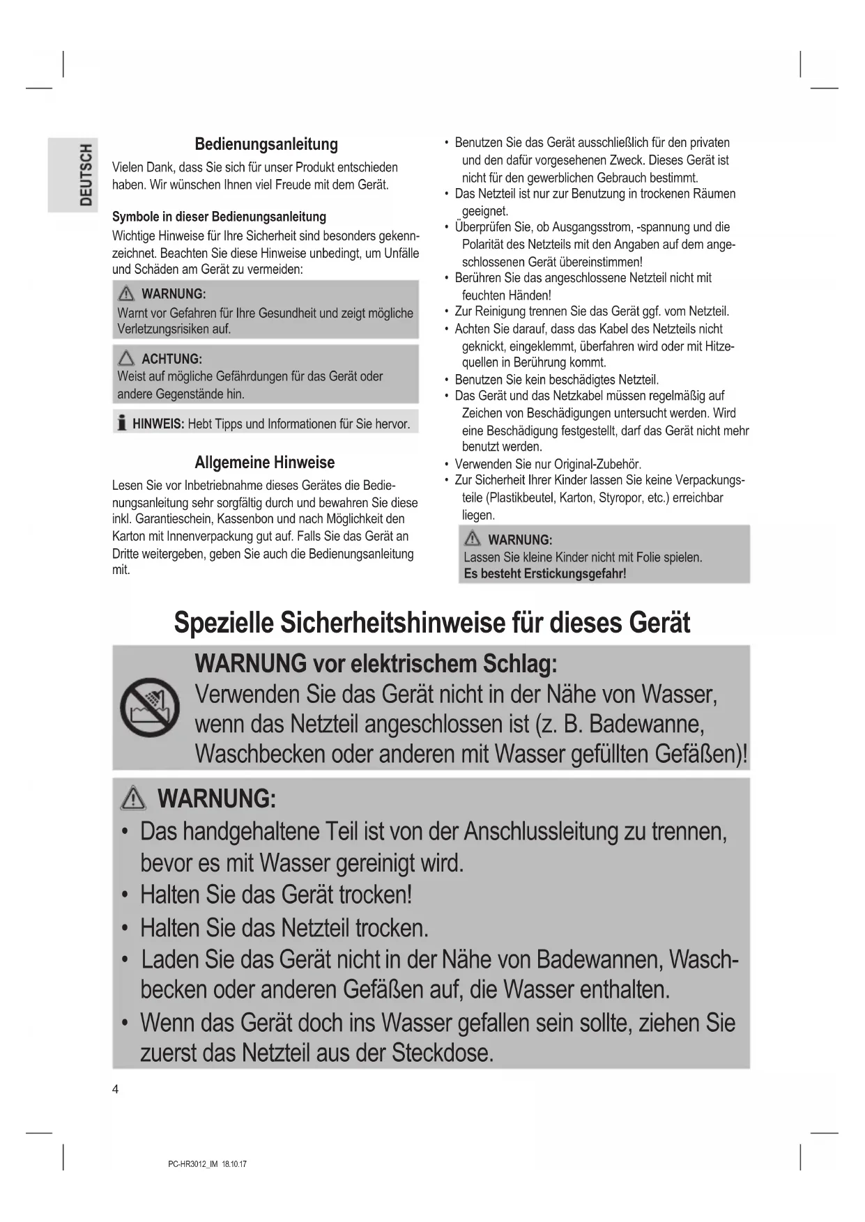 - Wenn das Gerät doch ins Wasser gefallen sein sollte, ziehen Sie zuerst das Netzteil aus der Steckdose.5 PC-HR3012_IM 18.10.17 WARNUNG:
