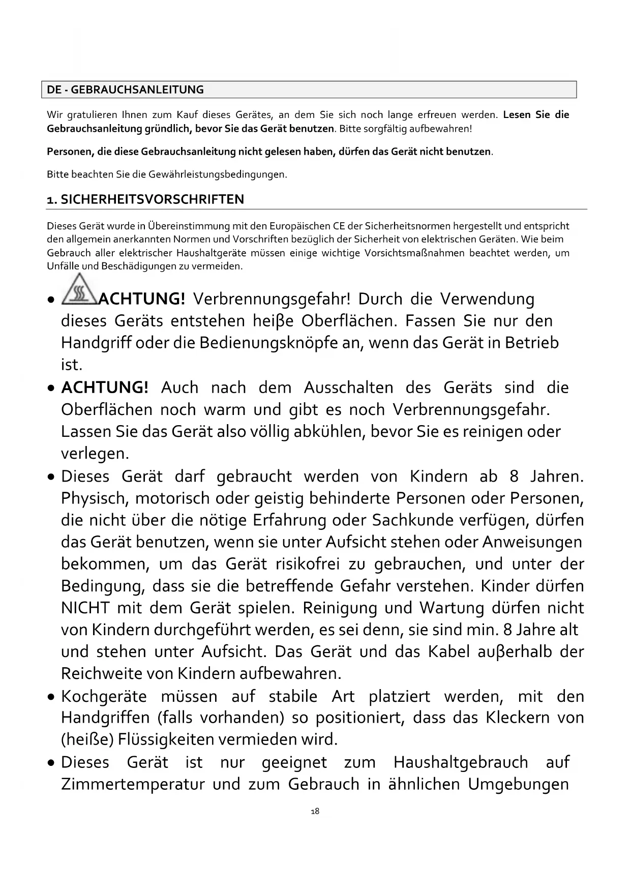 ACHTUNG! Verbrennungsgefahr! Durch die Verwendung dieses Geräts entstehen heiβe Oberflächen. Fassen Sie nur den Handgriff oder die Bedienungsknöpfe an, wenn das Gerät in Betrieb ist.