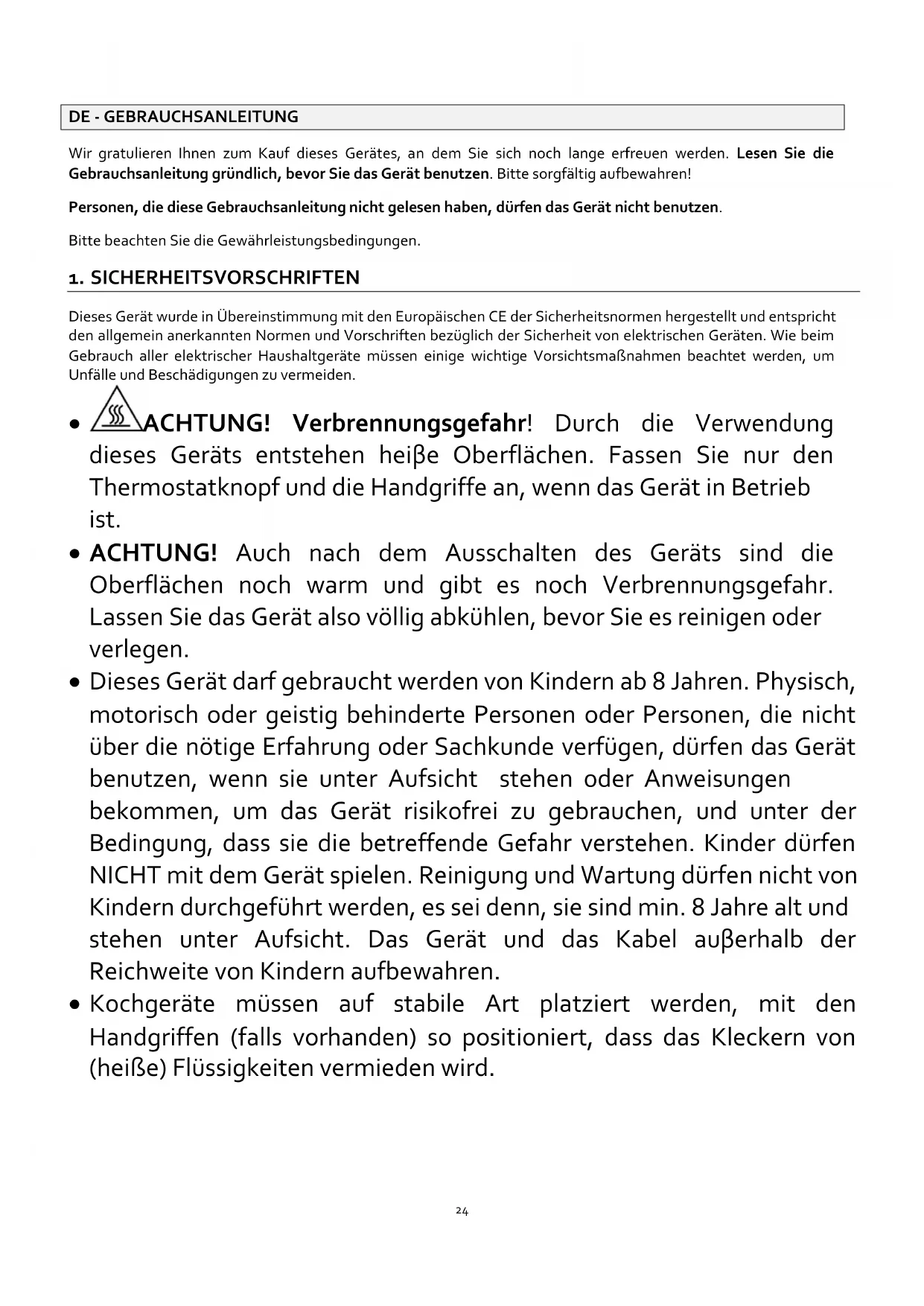 - ACHTUNG! Verbrennungsgefahr! Durch die Verwendung dieses Geräts entstehen heiβe Oberflächen. Fassen Sie nur den Thermostatknopf und die Handgriffe an, wenn das Gerät in Betrieb ist.