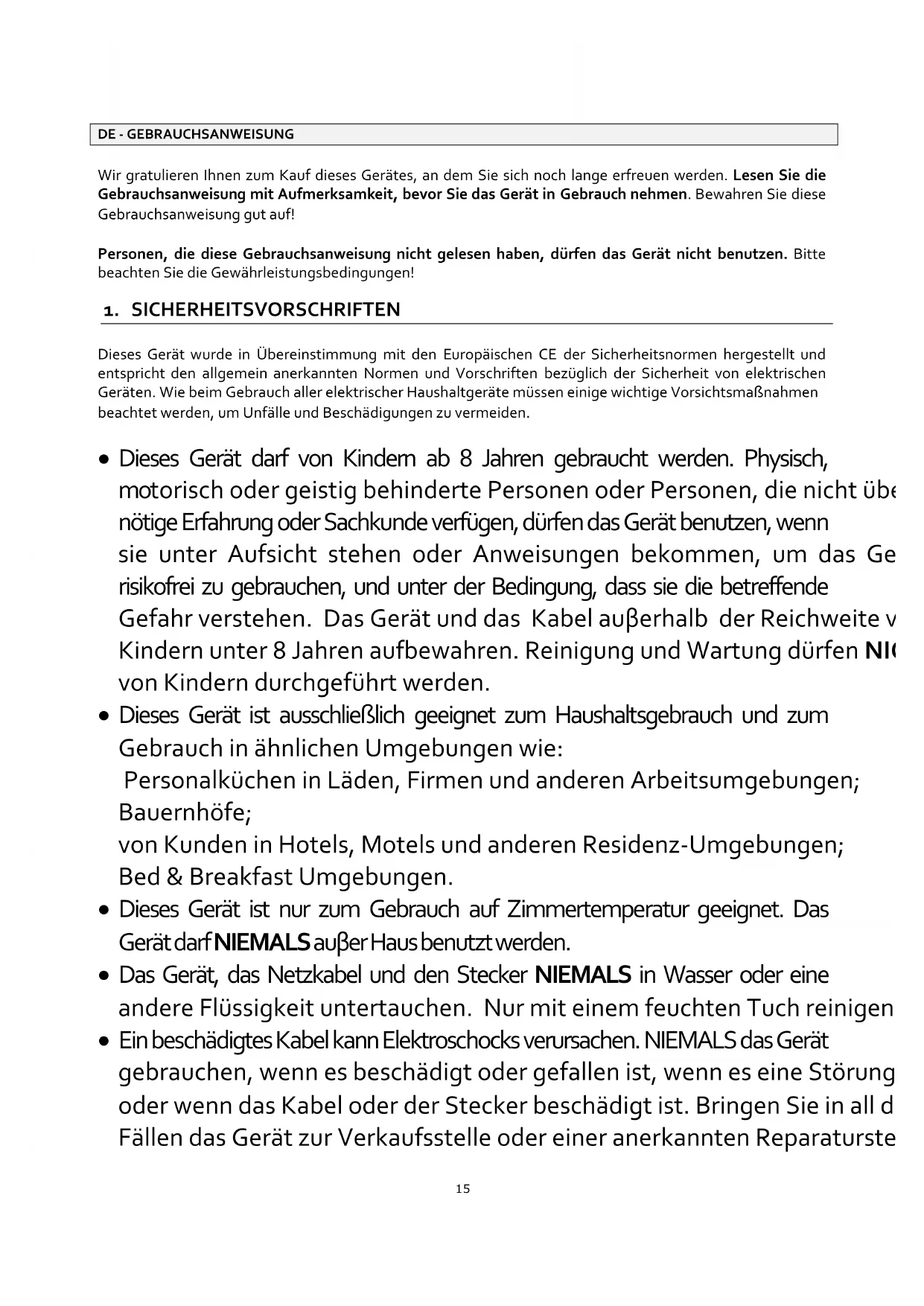 - Das Gerät ist nur für den Hausgebrauch und nicht für professionellen Gebrauch geeignet.
