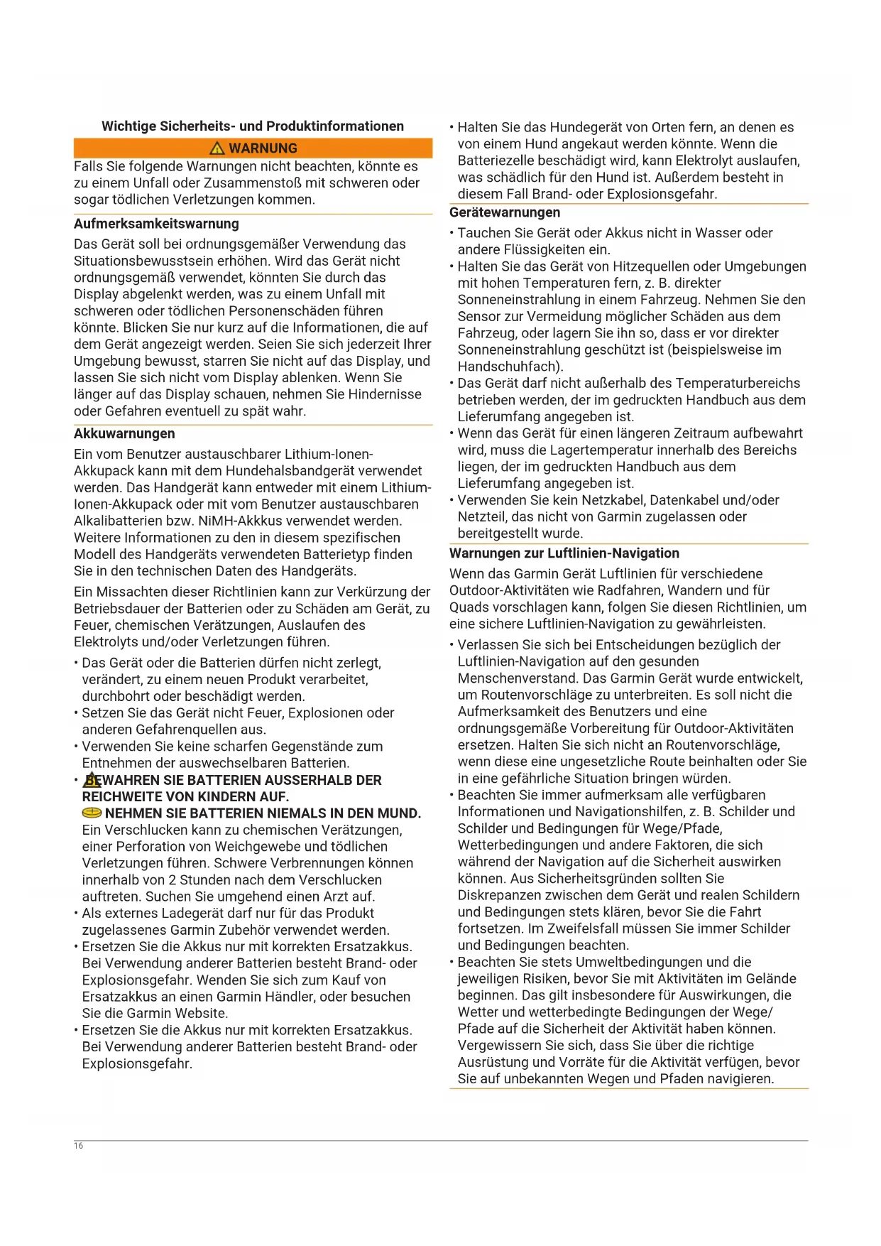VERFÜGUNG STEHENDEN RECHTSMITTEL. Für reparierte oder ersetzte Geräte gilt eine Gewährleistung von 90 Tagen. Falls für das eingesendete Gerät weiterhin die ursprüngliche Gewährleistung gilt, beträgt die neue Gewährleistung 90 Tage oder bis zum Ende der ursprünglichen einjährigen Garantie, wobei der jeweils längere Zeitraum Anwendung findet. Bevor Sie einen Garantieanspruch geltend machen, sehen Sie sich die unter support.garmin.com verfügbaren Online-Hilferessourcen an. Falls Sie diese Ressourcen verwenden und das Gerät weiterhin nicht ordnungsgemäß funktioniert, wenden Sie sich an eine von Garmin autorisierte Serviceeinrichtung in dem Land, in dem Sie das Produkt ursprünglich erworben haben, oder folgen Sie den Anweisungen unter support.garmin.com, um einen Garantieanspruch geltend zu machen. Falls Sie sich in den USA befinden, können Sie sich auch telefonisch an 1-800-800-1020 wenden. Falls Sie einen Garantieanspruch außerhalb des Landes geltend machen, in dem Sie das Produkt ursprünglich erworben haben, kann Garmin nicht garantieren, dass die zum Reparieren oder Ersetzen des Produkts erforderlichen Teile und Produkte verfügbar sein werden; dies ist auf unterschiedliche Produktangebote und geltende Standards, Gesetze und Vorschriften zurückzuführen. In diesem Fall kann Garmin nach eigenem Ermessen und gemäß anwendbaren Gesetzen das Produkt reparieren oder ersetzen, wobei vergleichbare Garmin Produkte und Teile verwendet werden, oder verlangen, dass Sie das Produkt an eine von Garmin autorisierte Serviceeinrichtung in dem Land schicken, in dem Sie das Produkt ursprünglich erworben haben, oder an eine von Garmin autorisierte Serviceeinrichtung in einem anderen Land, die den Service des Produkts durchführen kann; in diesem Fall unterliegt es Ihrer Verantwortung, alle anwendbaren Gesetze und Vorschriften bezüglich Import und Export einzuhalten und für alle Zollgebühren, die Mehrwertsteuer, Versandkosten und andere damit verbundene Steuern und Gebühren aufzukommen. In einigen Fällen können Garmin und seine Händler Ihr Produkt nicht in einem anderen Land als dem Land warten, in dem Sie das Produkt nicht ursprünglich erworben haben, oder das reparierte oder ersetzte Produkt in dieses Land zurückschicken; dies ist auf geltende Standards, Gesetze und Vorschriften zurückzuführen. Käufe über Online-Auktionen: Online- Auktionsbestätigungen werden für Garantieansprüche nicht akzeptiert. Hierfür ist das Original oder eine Kopie des Kaufbelegs des ursprünglichen Einzelhändlers erforderlich. Garmin ersetzt keine fehlenden Komponenten bei Paketsendungen, die über Online- Auktionen erworben wurden. Internationale Käufe: Für über internationale Vertriebspartner außerhalb der USA erworbene Geräte gilt möglicherweise abhängig vom jeweiligen Land eine separate Garantie. Sofern zutreffend wird diese Garantie von dem Vertriebspartner im jeweiligen Land angeboten, der auch den lokalen Service für das Gerät durchführt. Garantien von Vertriebspartnern gelten nur in dem für den Vertrieb vorgesehenen Gebiet. 19Información importante sobre el producto y tu seguridad ADVERTENCIA Si no se cumplen las siguientes advertencias, se pueden provocar accidentes o colisiones que tengan como consecuencia la muerte o lesiones graves. Advertencia de distracción Este dispositivo se ha diseñado para ofrecer un mejor conocimiento de la situación si se usa correctamente. Sin embargo, si no se usa adecuadamente, la pantalla podría distraer al usuario, lo que podría ocasionar accidentes que provocasen graves daños personales o incluso la muerte. Consulta rápidamente la información que se muestra en el dispositivo. Estate atento siempre al entorno y no mires fijamente la pantalla ni dejes que te distraiga. Centrarse demasiado en la pantalla puede evitar que te percates de los obstáculos o elementos peligrosos. Advertencias sobre la pila/batería Para el collar para perros, se puede utilizar una batería de ión-litio sustituible. Para el dispositivo de mano, se puede utilizar una batería de ión-litio o bien pilas NiMH o alcalinas sustituibles. Consulta las especificaciones del dispositivo de mano en el manual para obtener más información acerca del tipo de batería que debe utilizarse en el modelo específico de tu dispositivo de mano. Si no se siguen estas indicaciones, puede reducirse el ciclo vital de las pilas o se pueden producir riesgos de daños al dispositivo, fuego, quemaduras químicas, fuga de electrolitos y heridas.