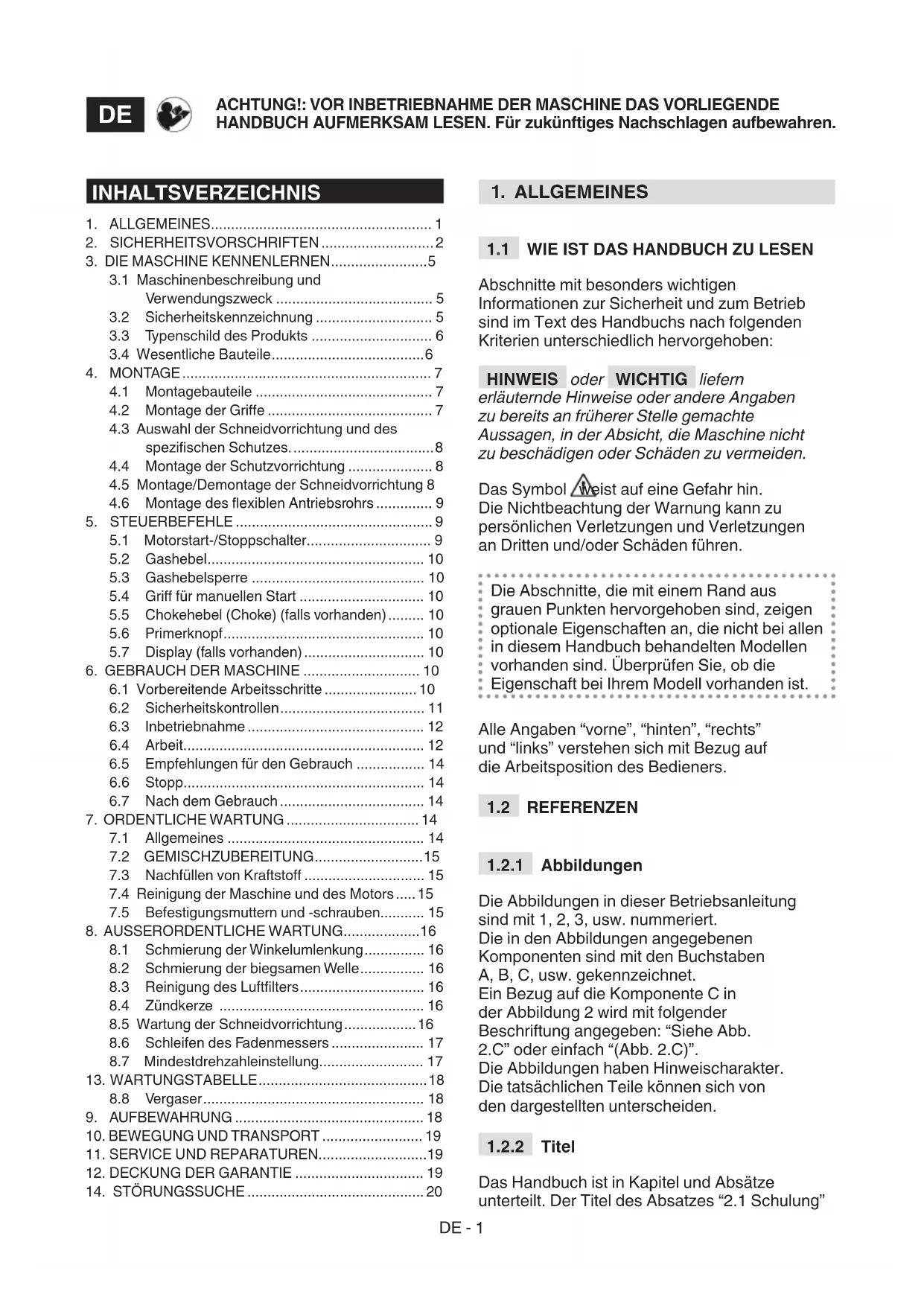 UND VERWENDUNGSZWECK Diese Maschine ist ein Gartengerät, genauer gesagt ein handgehaltener Freischneider/Trimmer mit Verbrennungsmotor für den Hobbygebrauch. Die Maschine besteht im Wesentlichen aus einem Motor, der über eine in einem Rohr gelagerte Antriebswelle und eine Winkelumlenkung eine Schneidvorrichtung antreibt, deren unterschiedliche Kongurationen verschiedene Funktionen erfüllen. Der Bediener kann die Maschine mithilfe von Tragegurten halten und die Hauptbedienelemente immer in Sicherheitsabstand zur Schneidvorrichtung betätigen.