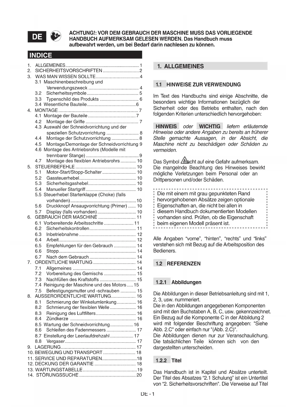 VERWENDUNGSZWECK Diese Maschine ist ein Gartengerät und zwar ein tragbarer Freischneider/Handrasenmäher mit Verbrennungsmotor, der für den Freizeitgebrauch vorgesehen ist. Die Maschine besteht im Wesentlichen aus einem Motor, der über eine in einem Rohr enthaltenenDE -