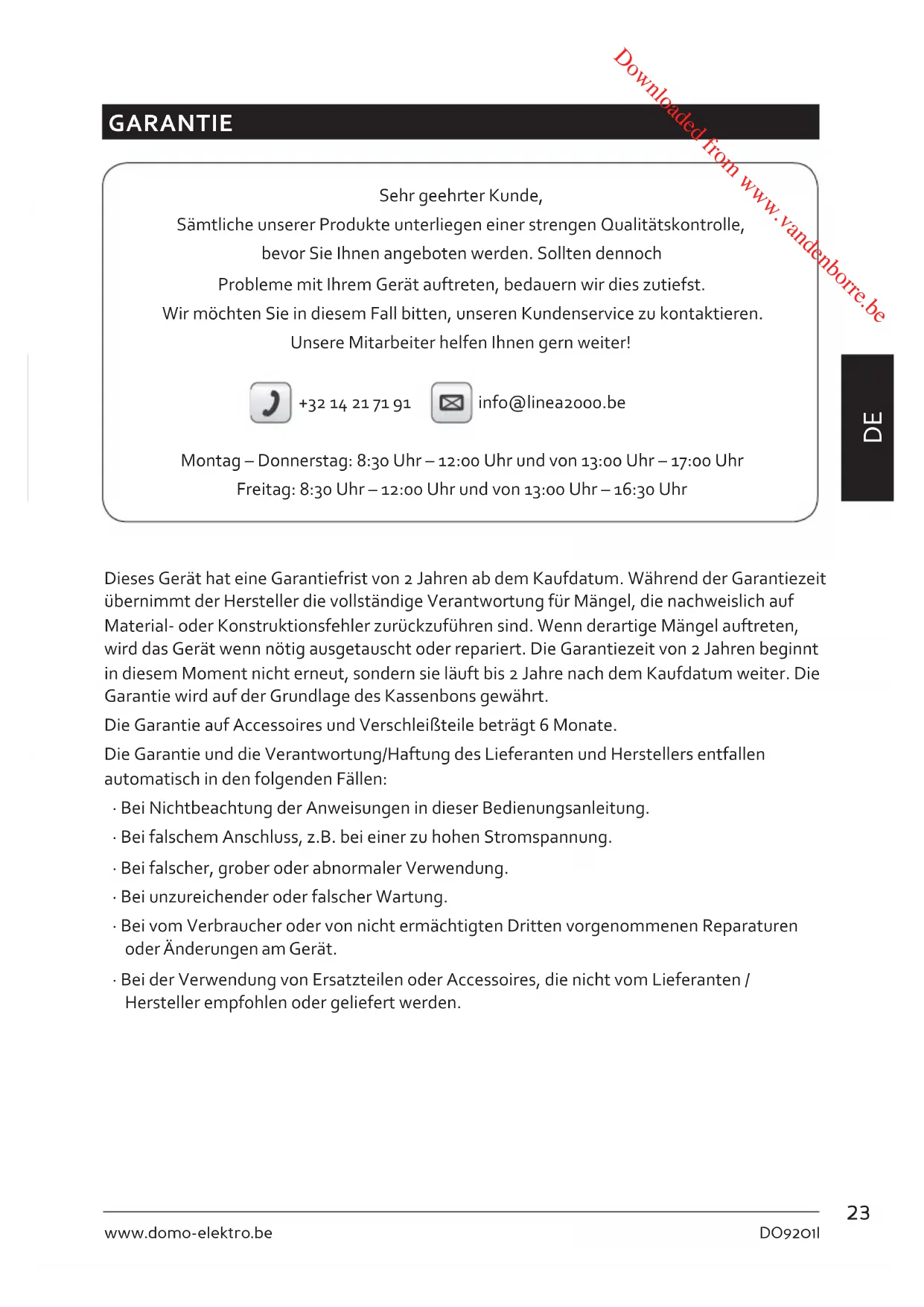 - Bei der Verwendung von Ersatzteilen oder Accessoires, die nicht vom Lieferanten / Hersteller empfohlen oder geliefert werden. Downloaded from www.vandenborre.be24 DO9201I